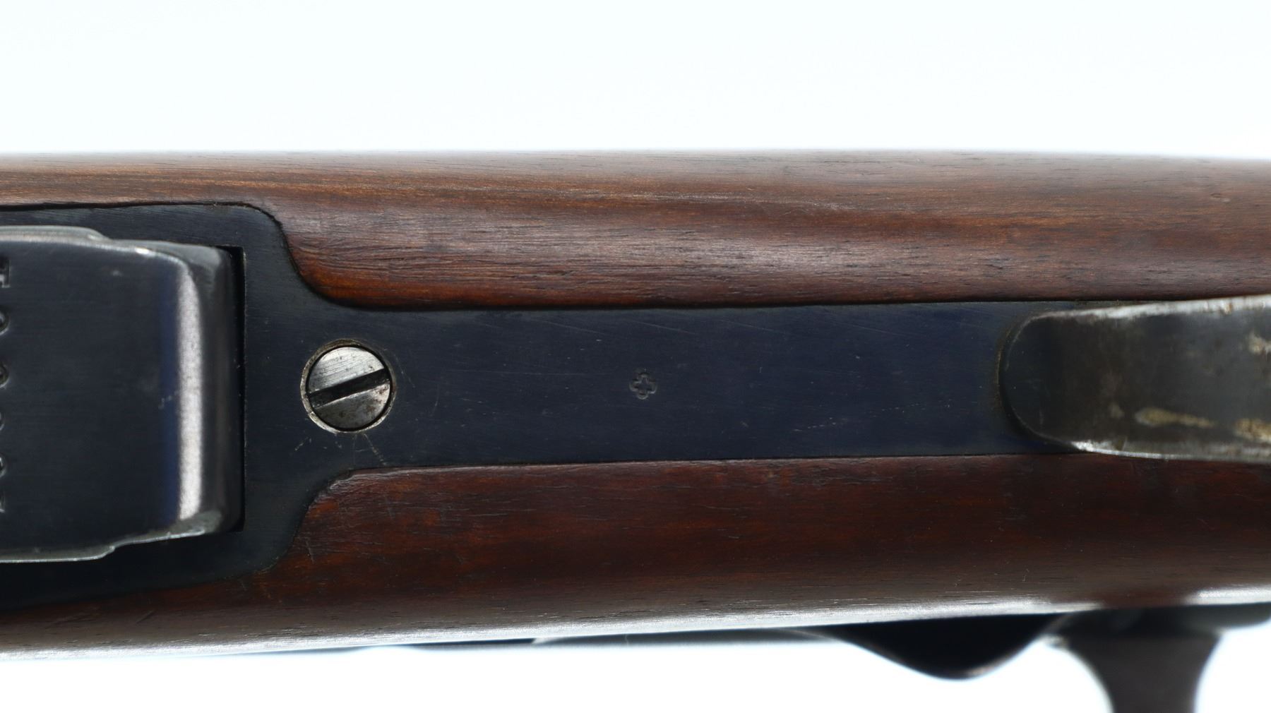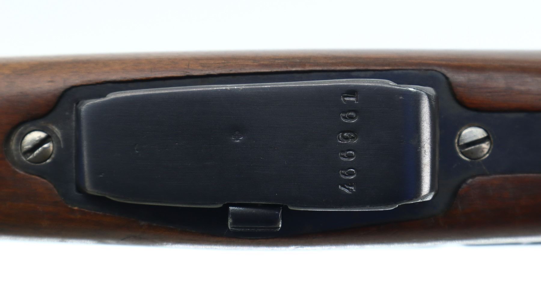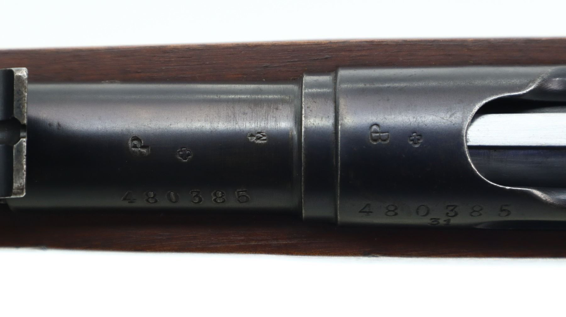 7/10, SWISS SCHMIDT RUBIN, MODEL: 1911 RIFLE, CALIBER:7.5 X 55 SWISS, COMES WITH MAGAZINE, BORE IS VERY GOOD. MANUFACTURED 1919, VISIBLE NUMBERS MATCH EXCEPT MAG. BLADE FRONT SIGHT WITH RAMP, ADJUSTABLE U NOTCHED REAR SIGHT, BLUED FINISH, SILVER BOLT WITH BROWN POLYMER BOLT KNOBS. TWO PIECE FULL MILITARY WOOD STOCKS, FINGER GROOVED FOREND, PISTOL GRIP, SMOOTH STEEL BUTT PLATE, SLING SWIVELS, STACKING HOOK, BAYONET LUG. METAL FINISH SHOWS SOME SCRATCHES, HANDLING MARKS AND WEAR. STOCKS SHOW SOME MARKS, SCRATCHES AND WEAR. , ACTION: STRAIGHT PULL RIFLE, BARREL LENGTH: 30.25", SERIAL # 480385, CONDITION: 7/10, CLASS: CANADIAN NON RESTRICTED