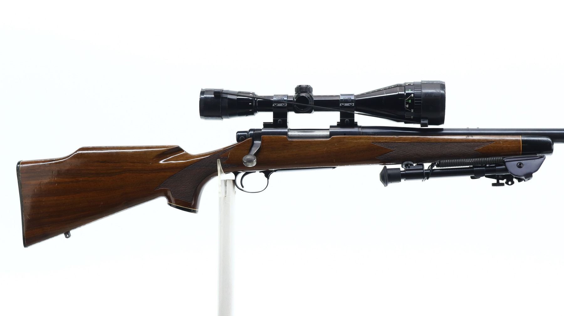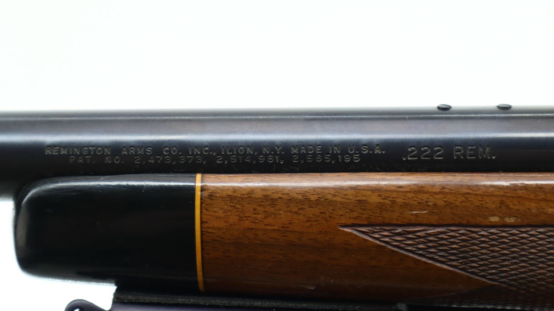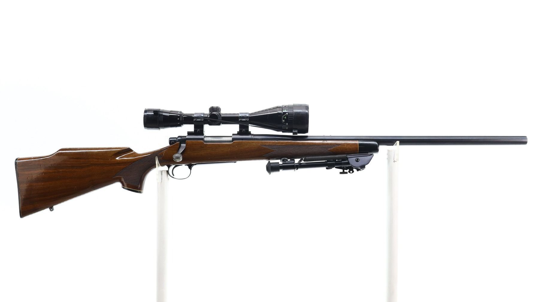 6+/10, REMINGTON, MODEL: 700 BDL VARMINT, CALIBER:222 REM, BORE IS EXCELLENT. BLUED HEAVY BARREL NO SIGHTS, RECEIVER DRILLED AND TAPPED WITH NIKO STERLING PLATINUM 4-12 X 50 SCOPE, CLEAR OPTICS WITH DUPLEX CROSSHAIR, JEWELLED BOLT. ONE PIECE BROWN WOOD STOCK, BLACK POLYMER FOREND AND PISTOL GRIP CAPS, CHECKERED FOREARM AND PISTOL GRIP, CHEEK REST, CHECKERED BLACK POLYMER BUTT PLATE (CRACKED AT HEEL), HINGED FLOOR PLATE, HAS A FOLDING ADJUSTABLE BIPOD ON FOREND. METAL FINISH SHOWS SOME SCRATCHES, HANDLING MARKS AND WEAR. STOCK SHOWS SOME MARKS, SCRATCHES AND WEAR. , ACTION: BOLT ACTION RIFLE, BARREL LENGTH: 24", SERIAL # 6826361, CONDITION: 6+/10, CLASS: CANADIAN NON RESTRICTED