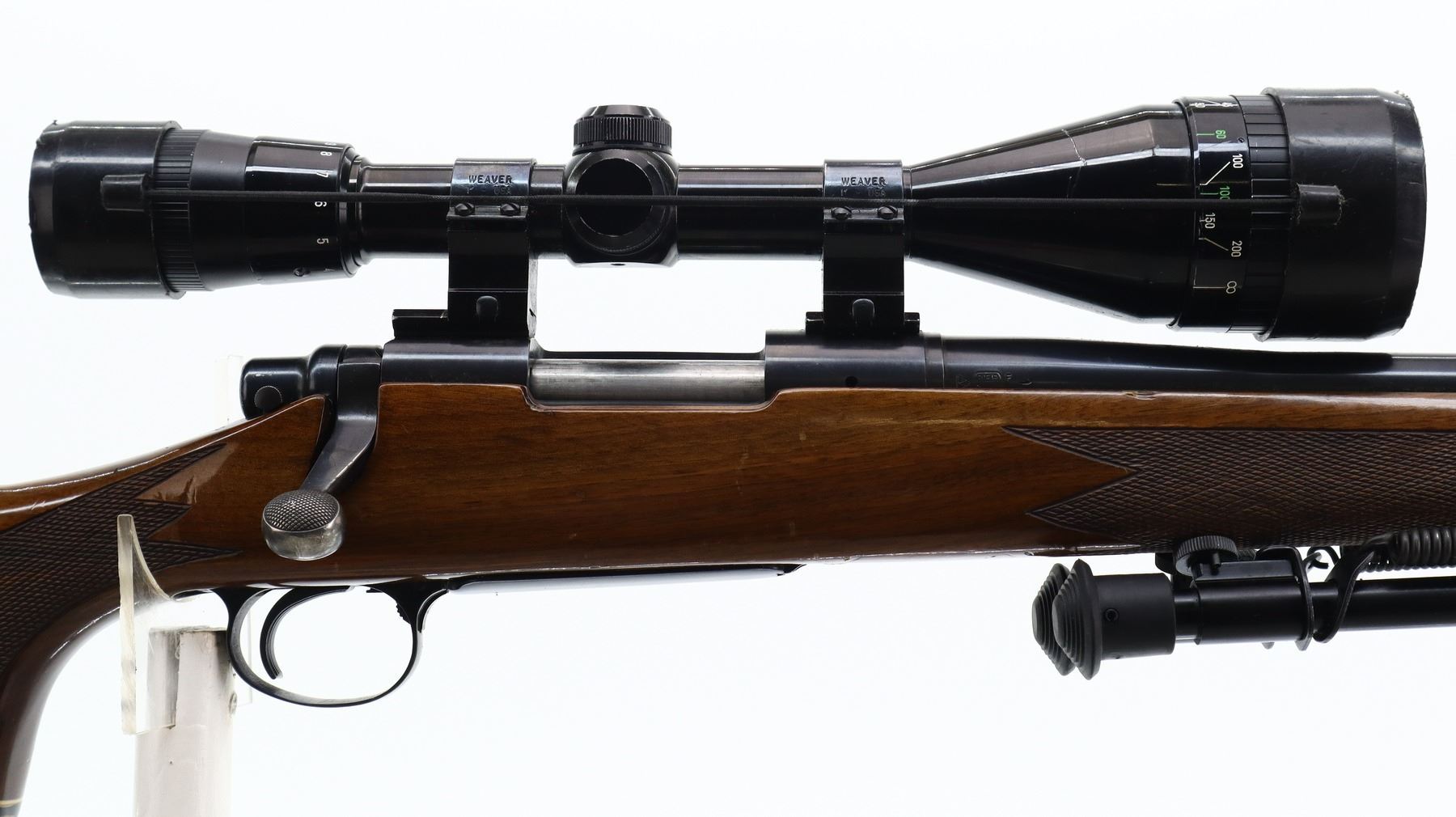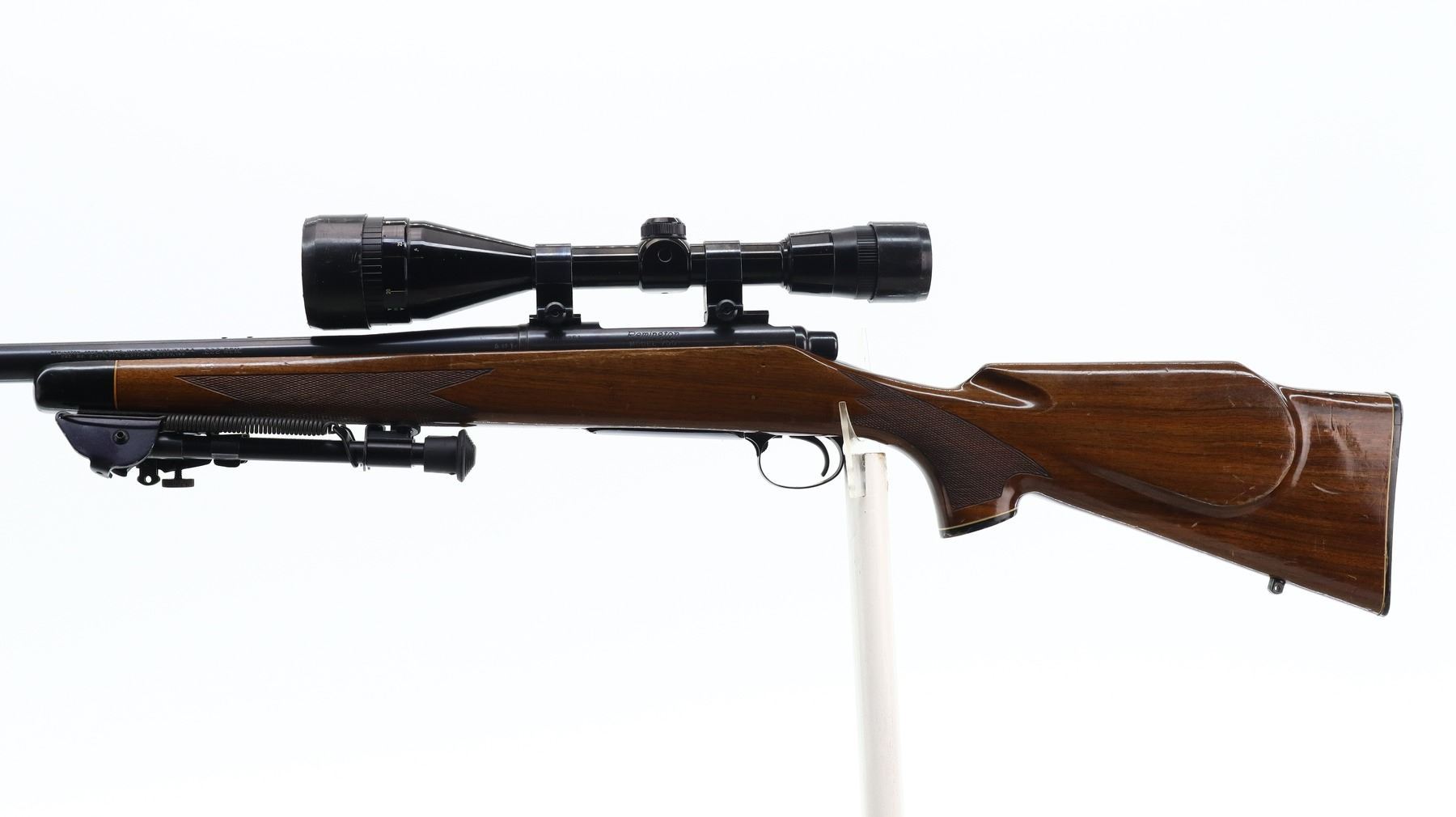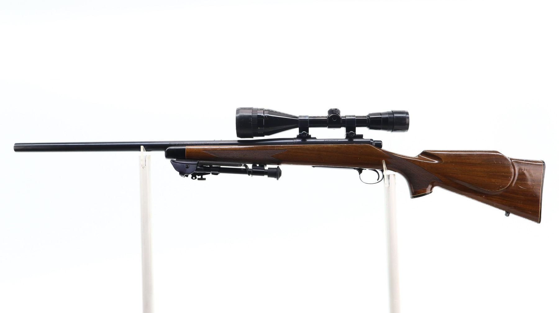 6+/10, REMINGTON, MODEL: 700 BDL VARMINT, CALIBER:222 REM, BORE IS EXCELLENT. BLUED HEAVY BARREL NO SIGHTS, RECEIVER DRILLED AND TAPPED WITH NIKO STERLING PLATINUM 4-12 X 50 SCOPE, CLEAR OPTICS WITH DUPLEX CROSSHAIR, JEWELLED BOLT. ONE PIECE BROWN WOOD STOCK, BLACK POLYMER FOREND AND PISTOL GRIP CAPS, CHECKERED FOREARM AND PISTOL GRIP, CHEEK REST, CHECKERED BLACK POLYMER BUTT PLATE (CRACKED AT HEEL), HINGED FLOOR PLATE, HAS A FOLDING ADJUSTABLE BIPOD ON FOREND. METAL FINISH SHOWS SOME SCRATCHES, HANDLING MARKS AND WEAR. STOCK SHOWS SOME MARKS, SCRATCHES AND WEAR. , ACTION: BOLT ACTION RIFLE, BARREL LENGTH: 24", SERIAL # 6826361, CONDITION: 6+/10, CLASS: CANADIAN NON RESTRICTED