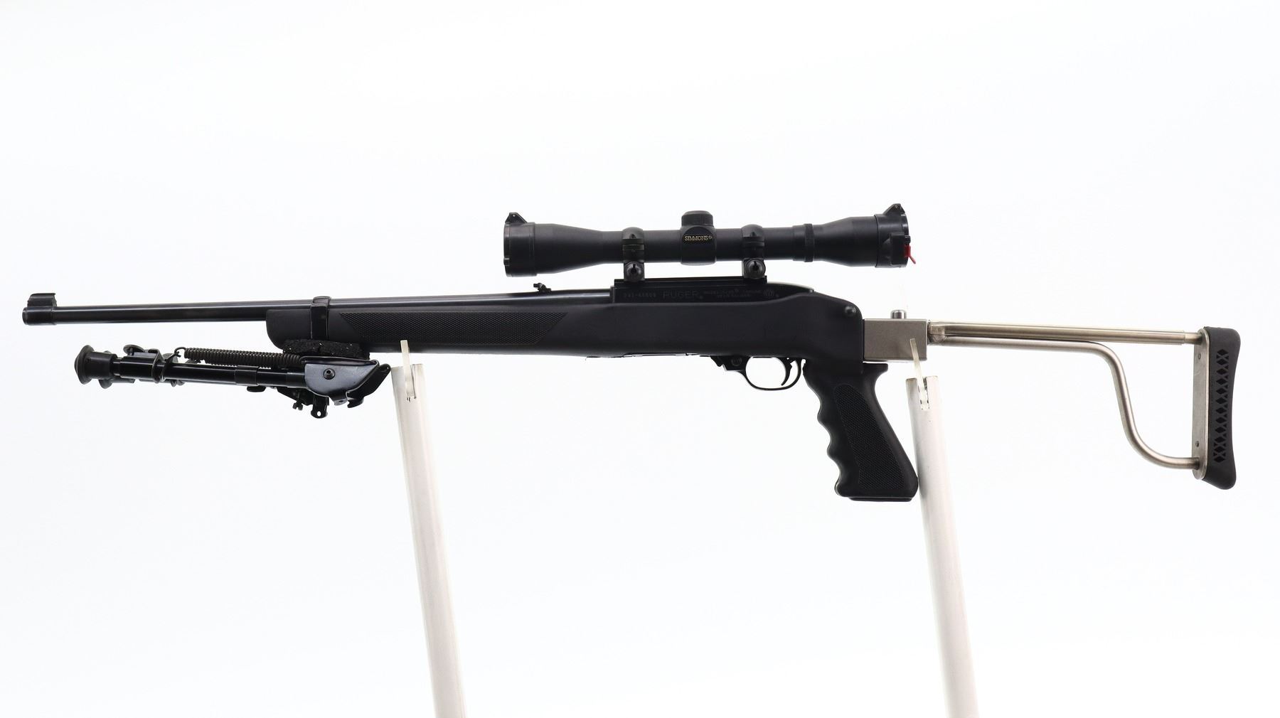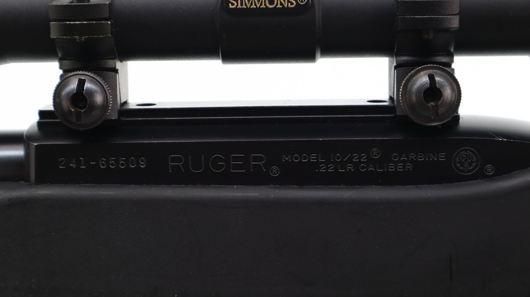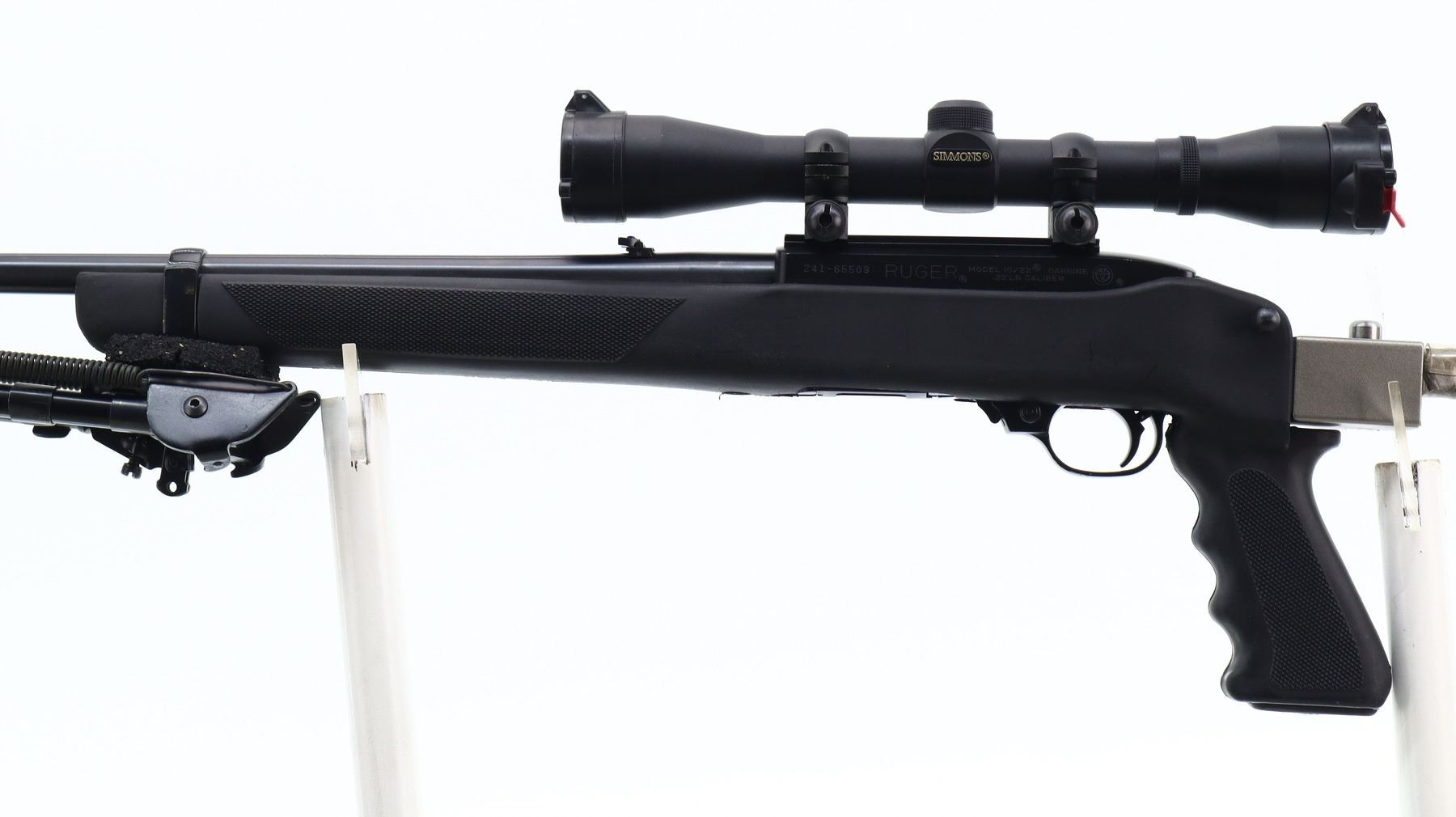 7/10, RUGER, MODEL: 10/22, CALIBER:22 LR, COMES WITH HARD CASE, MAGAZINE, BORE IS EXCELLENT. BLADE FRONT SIGHT WITH RAMP, ADJUSTABLE U NOTCHED REAR SIGHT, BLUED STEEL BARREL, BLACK ALLOY RECEIVER DRILLED AND TAPPED WITH SIMMONS 4 X 32 SCOPE, CLEAR OPTICS WITH DUPLEX CROSSHAIR. HAS A ONE PIECE BUTLER CREEK BLACK SYNTHETIC STOCK, CHECKERED FOREARM AND PISTOL GRIP, STAINLESS FOLDING BUTT WITH BLACK VENTED RUBBER RECOIL PAD, SWIVEL STUDS, ATTACHED FOLDING HARRIS 1A2 ULTRA LIGHT BIPOD. METAL FINISH SHOWS SOME SCRATCHES, HANDLING MARKS AND WEAR. STOCK SHOWS SOME MARKS, SCRATCHES AND WEAR. , ACTION: SEMI AUTOMATIC RIFLE, BARREL LENGTH: 18.5", SERIAL # 24165509, CONDITION: 7/10, CLASS: CANADIAN NON RESTRICTED