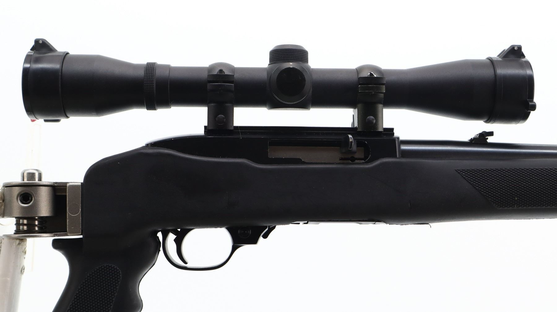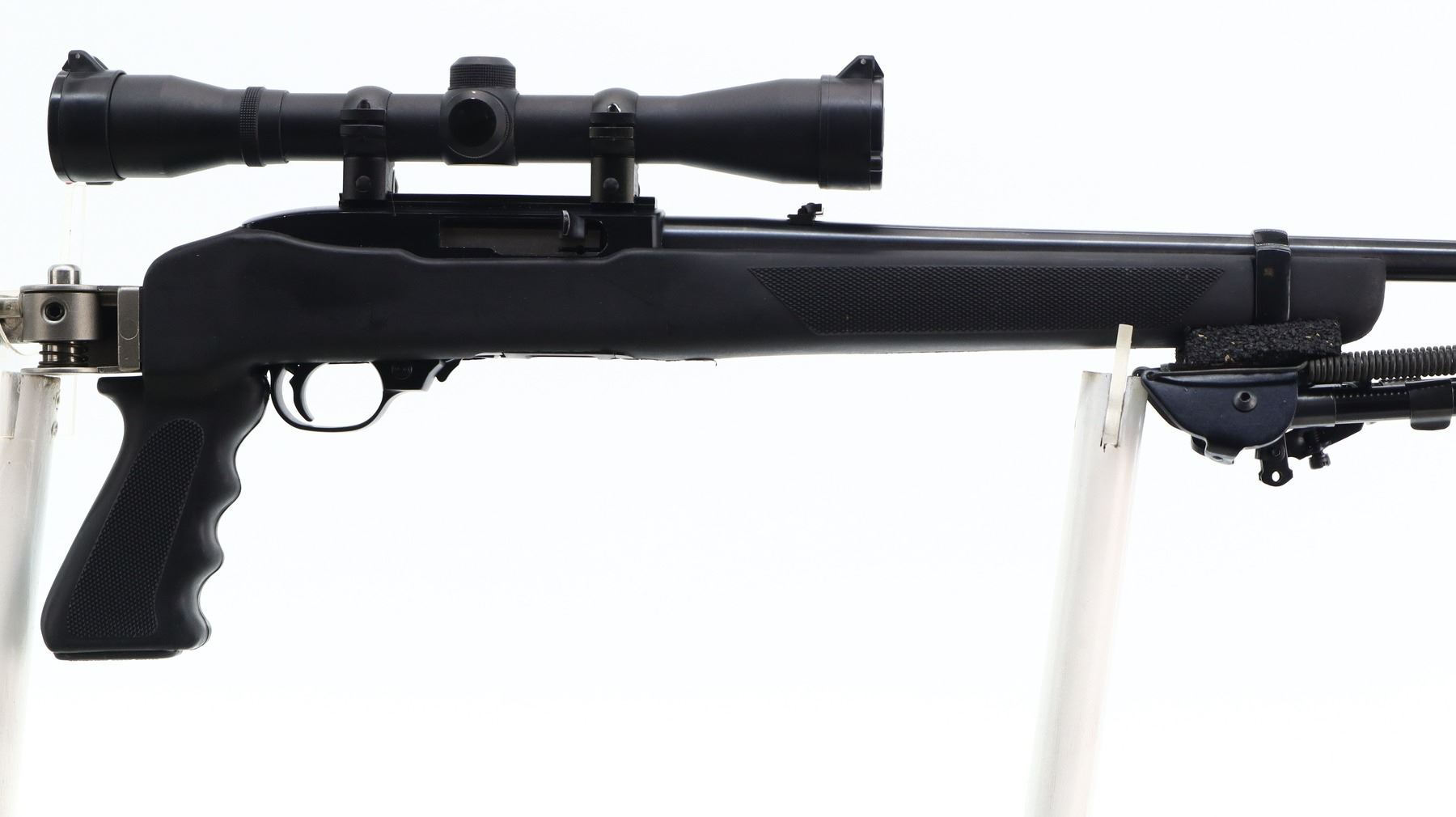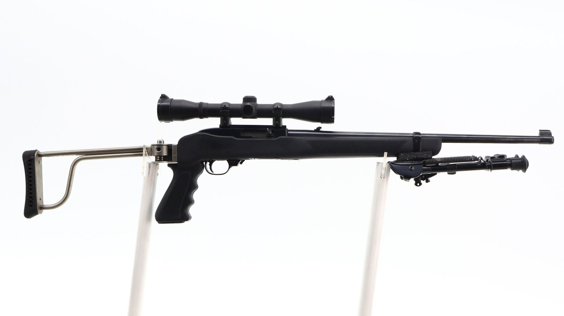 7/10, RUGER, MODEL: 10/22, CALIBER:22 LR, COMES WITH HARD CASE, MAGAZINE, BORE IS EXCELLENT. BLADE FRONT SIGHT WITH RAMP, ADJUSTABLE U NOTCHED REAR SIGHT, BLUED STEEL BARREL, BLACK ALLOY RECEIVER DRILLED AND TAPPED WITH SIMMONS 4 X 32 SCOPE, CLEAR OPTICS WITH DUPLEX CROSSHAIR. HAS A ONE PIECE BUTLER CREEK BLACK SYNTHETIC STOCK, CHECKERED FOREARM AND PISTOL GRIP, STAINLESS FOLDING BUTT WITH BLACK VENTED RUBBER RECOIL PAD, SWIVEL STUDS, ATTACHED FOLDING HARRIS 1A2 ULTRA LIGHT BIPOD. METAL FINISH SHOWS SOME SCRATCHES, HANDLING MARKS AND WEAR. STOCK SHOWS SOME MARKS, SCRATCHES AND WEAR. , ACTION: SEMI AUTOMATIC RIFLE, BARREL LENGTH: 18.5", SERIAL # 24165509, CONDITION: 7/10, CLASS: CANADIAN NON RESTRICTED