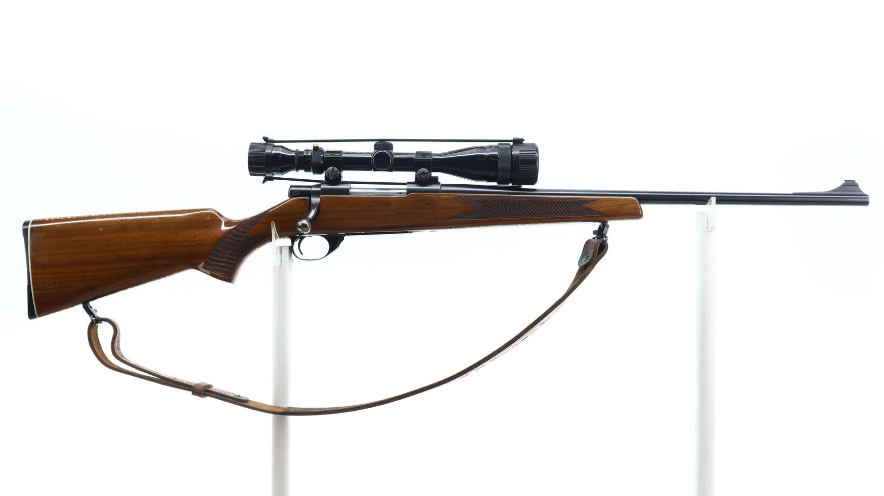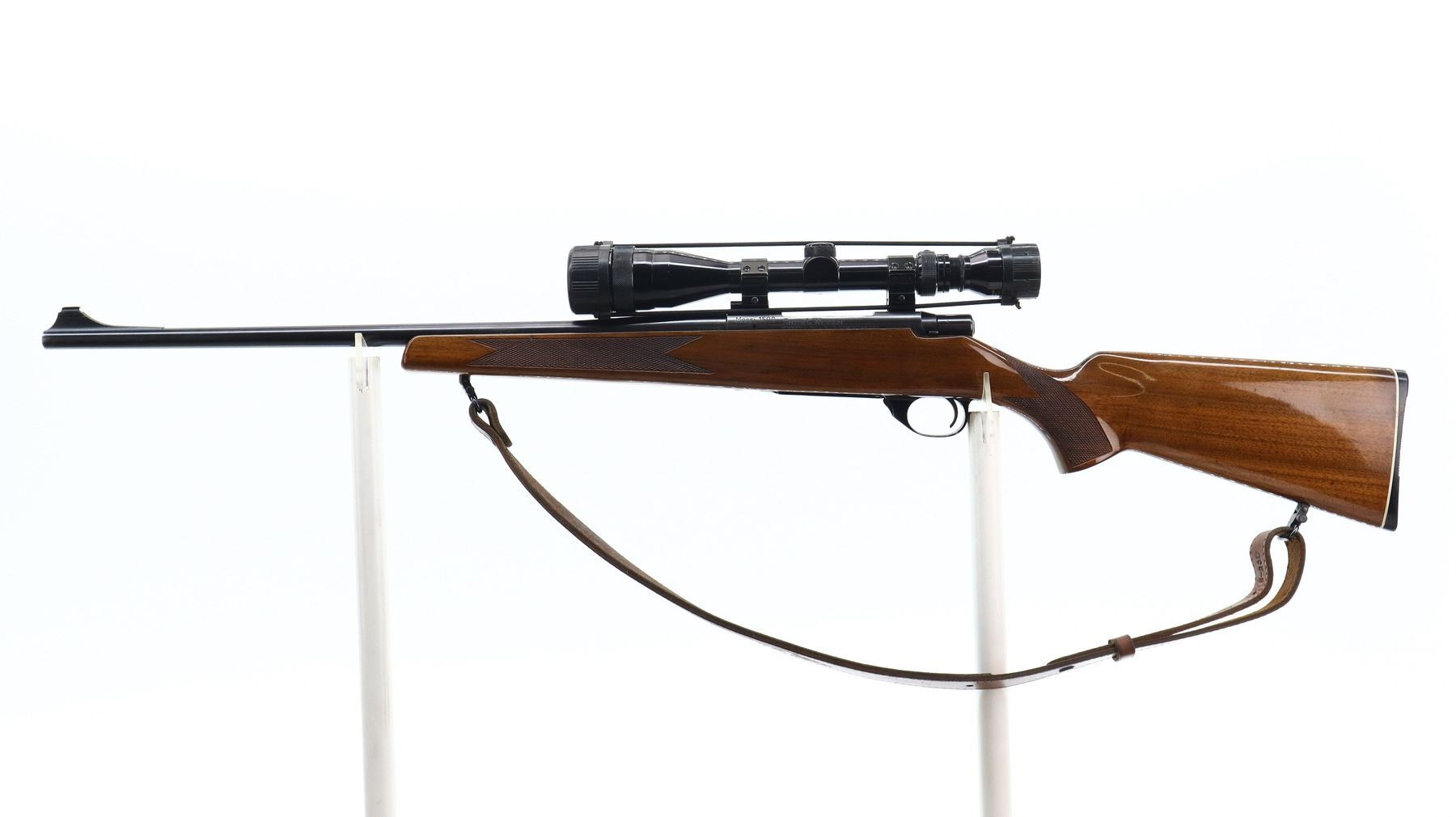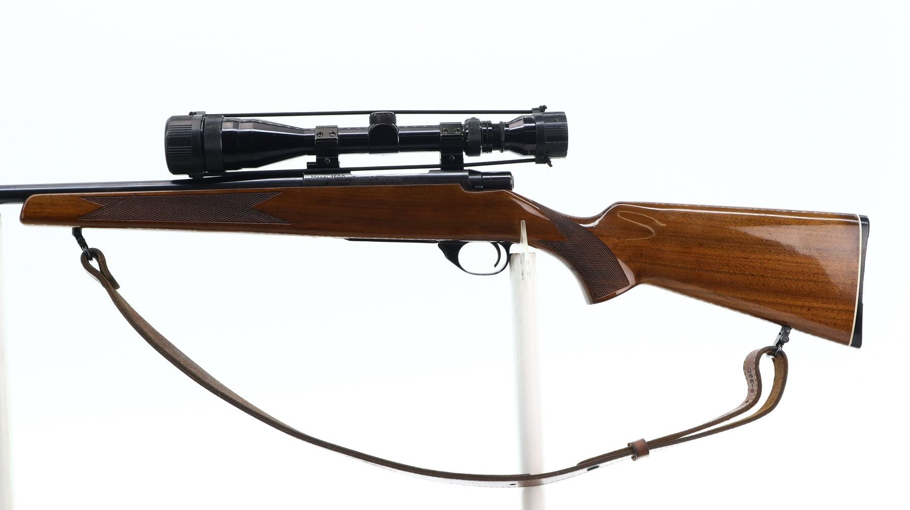 7/10, SMITH & WESSON, MODEL: 1500, CALIBER:222 REM, BORE IS EXCELLENT. BLADE FRONT SIGHT WITH RAMP, REAR SIGHT REMOVED HOLES PRESENT, HAS A TASCO 4-12 X 40 AO SCOPE, CLEAR OPTICS WITH DUPLEX CROSSHAIR. ONE PIECE WOOD STOCK, CHECKERED FOREARM AND PISTOL GRIP, GROOVED BLACK POLYMER BUTT PLATE, HINGED FLOOR PLATE, SWIVELS WITH BROWN LEATHER SLING. METAL FINISH SHOWS SOME SCRATCHES, HANDLING MARKS AND WEAR. STOCKS SHOW SOME MARKS, SCRATCHES AND WEAR. , ACTION: BOLT ACTION RIFLE, BARREL LENGTH: 22", SERIAL # PN59753, CONDITION: 7/10, CLASS: CANADIAN NON RESTRICTED