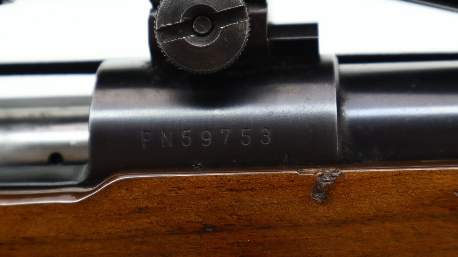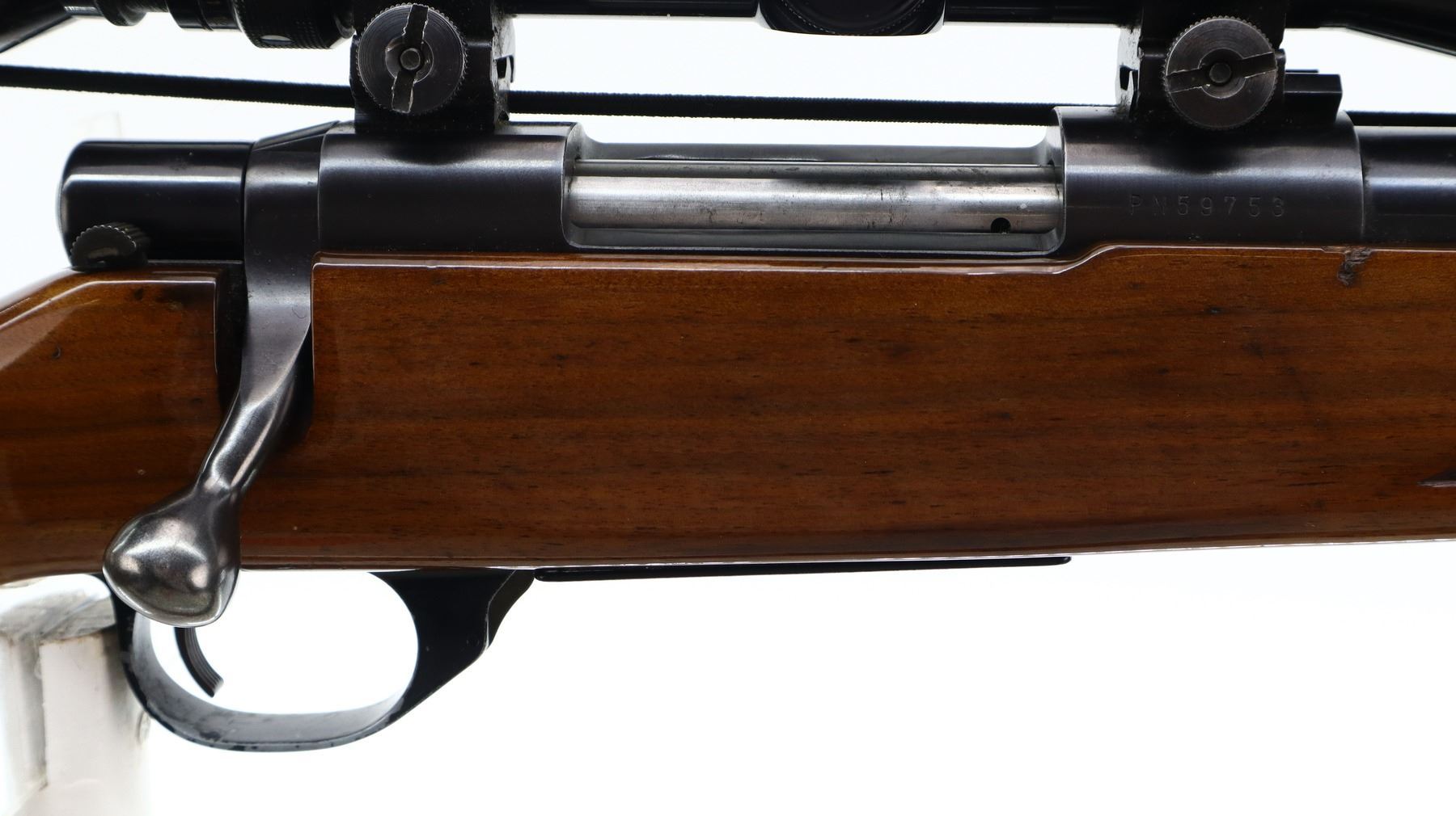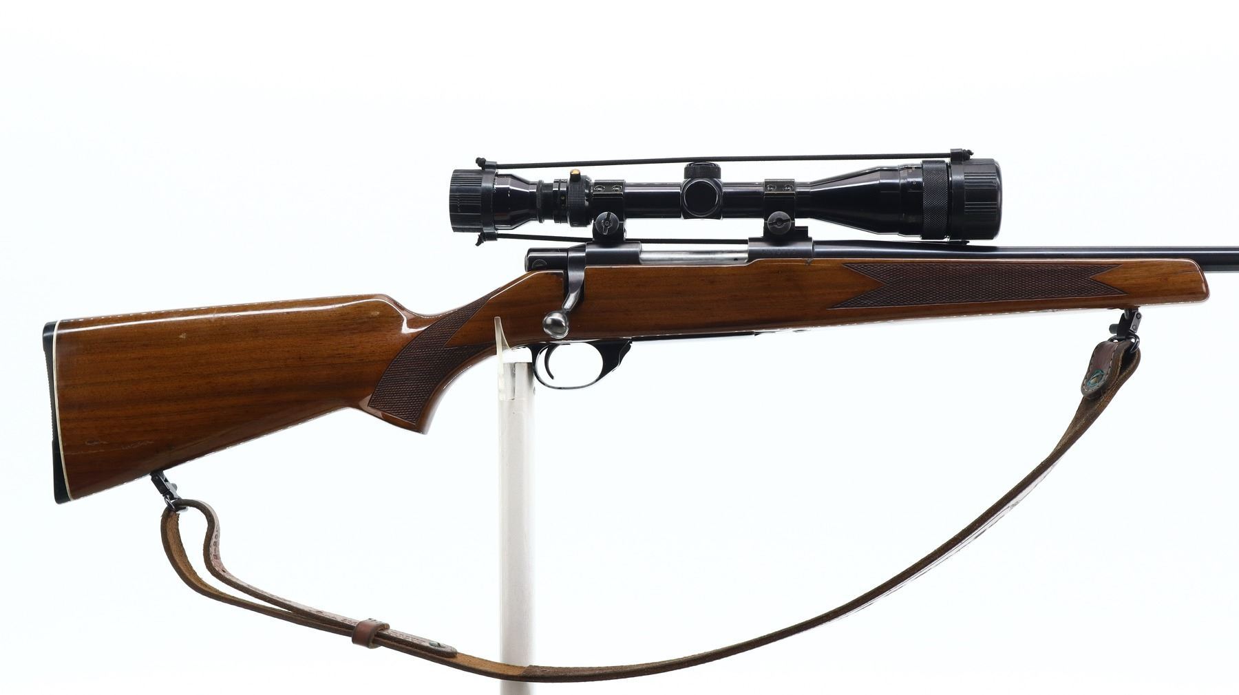 7/10, SMITH & WESSON, MODEL: 1500, CALIBER:222 REM, BORE IS EXCELLENT. BLADE FRONT SIGHT WITH RAMP, REAR SIGHT REMOVED HOLES PRESENT, HAS A TASCO 4-12 X 40 AO SCOPE, CLEAR OPTICS WITH DUPLEX CROSSHAIR. ONE PIECE WOOD STOCK, CHECKERED FOREARM AND PISTOL GRIP, GROOVED BLACK POLYMER BUTT PLATE, HINGED FLOOR PLATE, SWIVELS WITH BROWN LEATHER SLING. METAL FINISH SHOWS SOME SCRATCHES, HANDLING MARKS AND WEAR. STOCKS SHOW SOME MARKS, SCRATCHES AND WEAR. , ACTION: BOLT ACTION RIFLE, BARREL LENGTH: 22", SERIAL # PN59753, CONDITION: 7/10, CLASS: CANADIAN NON RESTRICTED
