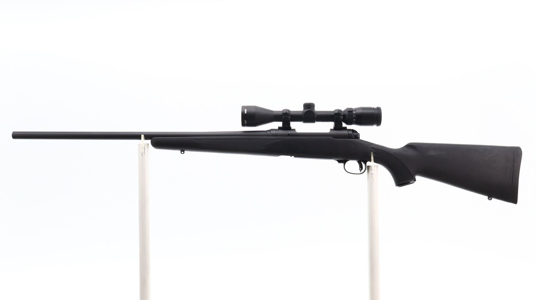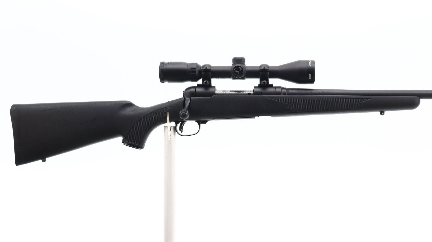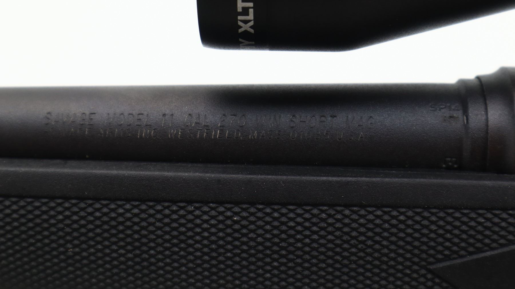 8/10, SAVAGE, MODEL: 11, CALIBER:270 WSM, COMES WITH MAGAZINE, BORE IS EXCELLENT. TAPERED ROUND BARREL, NO SIGHTS, BLACK MATTE FINISH, JEWELLED BOLT, RECEIVER DRILLED AND TAPPED WITH BUSHNELL TROPHY XLT 3-9 X 40 SCOPE, CLEAR OPTICS WITH DUPLEX CROSSHAIR, TANG SAFETY. ONE PIECE BLACK SYNTHETIC STOCK, CHECKERED FOREARM AND PISTOL GRIP, BLACK RUBBER RECOIL PAD, GRIP CAP, ACCU TRIGGER, SWIVEL STUDS. METAL FINISH SHOWS SOME SCRATCHES AND HANDLING MARKS. STOCK SHOWS SOME MARKS AND SCRATCHES. , ACTION: BOLT ACTION RIFLE, BARREL LENGTH: 24", SERIAL # H818127, CONDITION: 8/10, CLASS: CANADIAN NON RESTRICTED