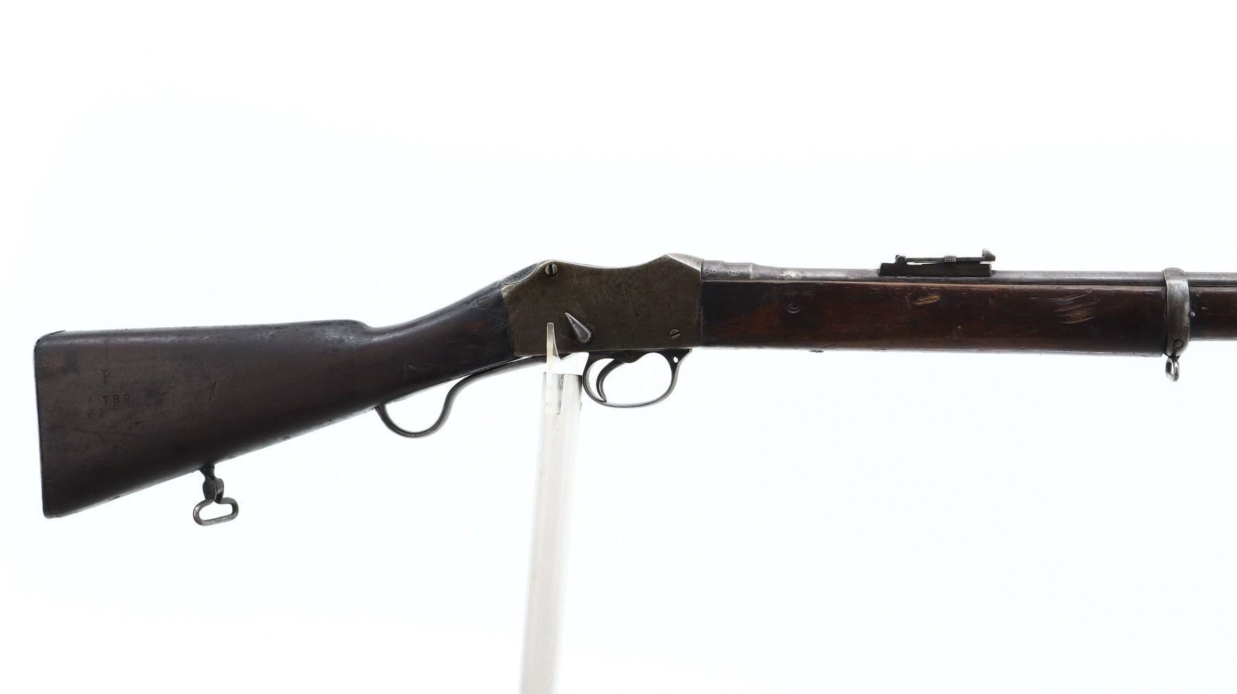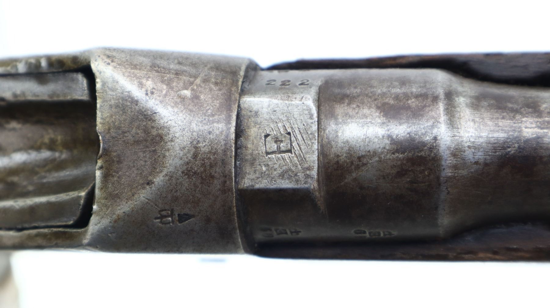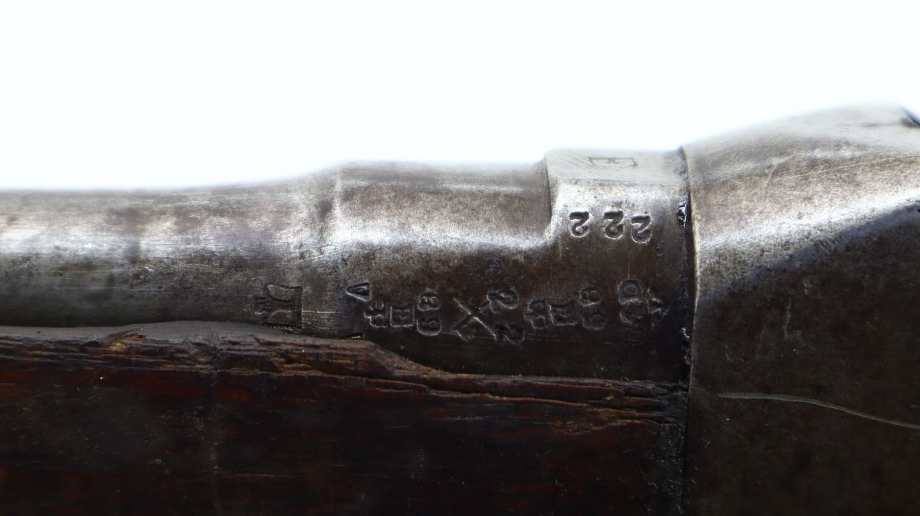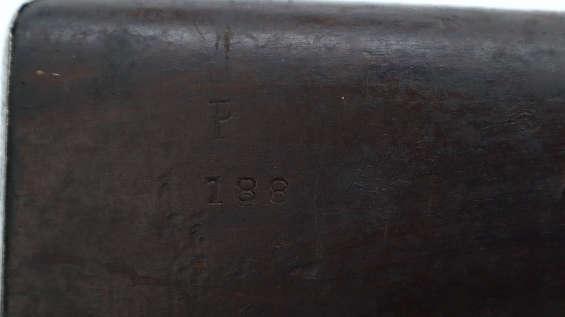 6/10, KHYBER PASS MARTINI ENFIELD, MODEL: MKII, CALIBER:303 BR, BORE IS POOR, VERY WORN, PITTED. THIS RIFLE IS A KHYBER PASS COPY OF A BRITISH ENFIELD RIFLE. NOTE: SEE A GUNSMITH BEFORE FIRING. BLADE FRONT SIGHT WITH RAMP, ADJUSTABLE U NOTCHED REAR SIGHT, VARIOUS IMPROPER COPY BRITISH PROOF MARKS INCLUDING ENFIELD STAMPED UPSIDE DOWN THREE TIMES IN A ROW ON LEFT SIDE OF RECEIVER. TWO PIECE FULL MILITARY WOOD STOCKS, STRAIGHT GRIP, SMOOTH STEEL BUTT PLATE, THREE SLING SWIVELS, NO CLEANING ROD. METAL FINISH TURNING SILVER GREY WITH LIGHT PITTING, RUST SPECKLES, HANDLING MARKS AND WEAR. STOCKS SHOW MARKS, SCRATCHES AND WEAR. , ACTION: SINGLE SHOT DROP BLOCK RIFLE, BARREL LENGTH: 30", SERIAL # 222, CONDITION: 6/10, CLASS: CANADIAN NON RESTRICTED