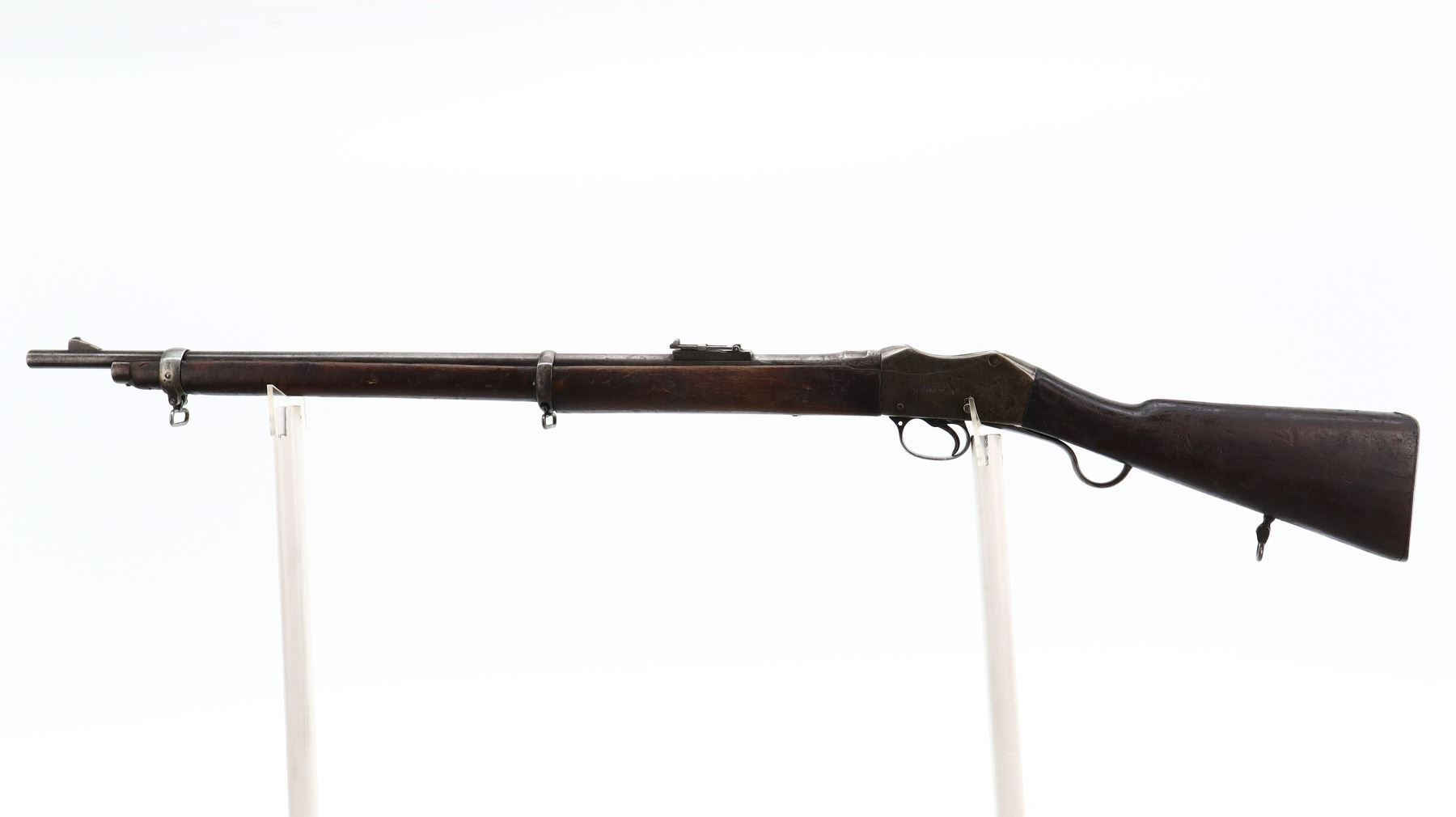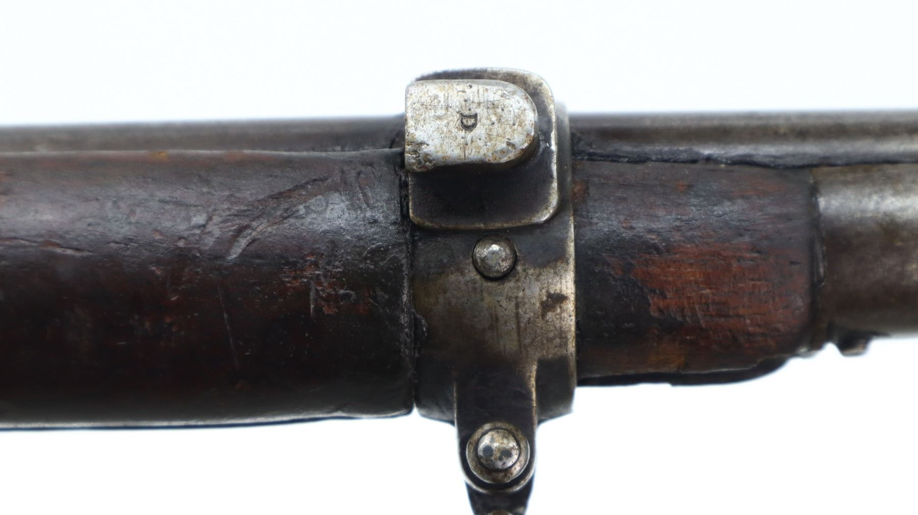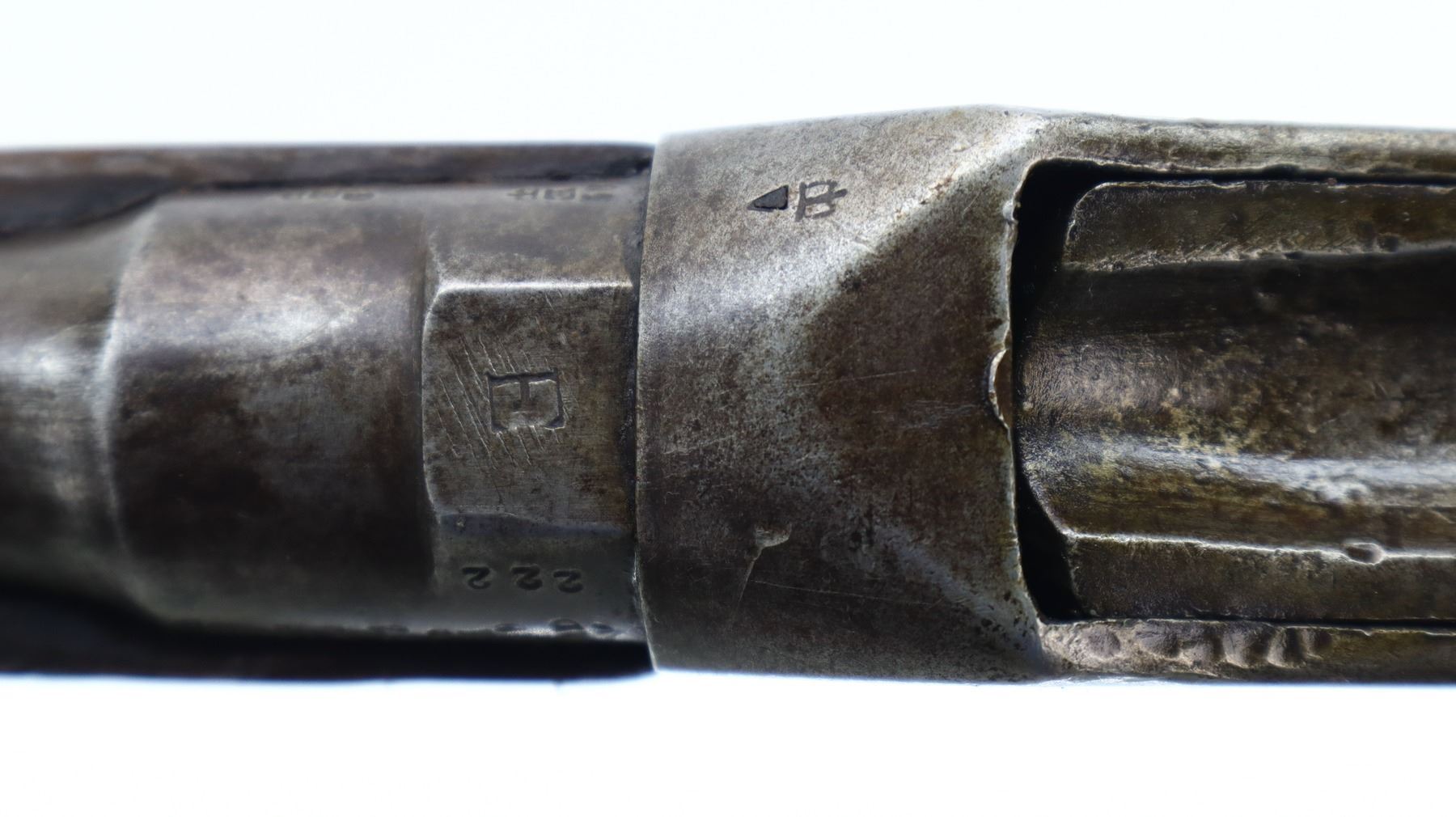 6/10, KHYBER PASS MARTINI ENFIELD, MODEL: MKII, CALIBER:303 BR, BORE IS POOR, VERY WORN, PITTED. THIS RIFLE IS A KHYBER PASS COPY OF A BRITISH ENFIELD RIFLE. NOTE: SEE A GUNSMITH BEFORE FIRING. BLADE FRONT SIGHT WITH RAMP, ADJUSTABLE U NOTCHED REAR SIGHT, VARIOUS IMPROPER COPY BRITISH PROOF MARKS INCLUDING ENFIELD STAMPED UPSIDE DOWN THREE TIMES IN A ROW ON LEFT SIDE OF RECEIVER. TWO PIECE FULL MILITARY WOOD STOCKS, STRAIGHT GRIP, SMOOTH STEEL BUTT PLATE, THREE SLING SWIVELS, NO CLEANING ROD. METAL FINISH TURNING SILVER GREY WITH LIGHT PITTING, RUST SPECKLES, HANDLING MARKS AND WEAR. STOCKS SHOW MARKS, SCRATCHES AND WEAR. , ACTION: SINGLE SHOT DROP BLOCK RIFLE, BARREL LENGTH: 30", SERIAL # 222, CONDITION: 6/10, CLASS: CANADIAN NON RESTRICTED
