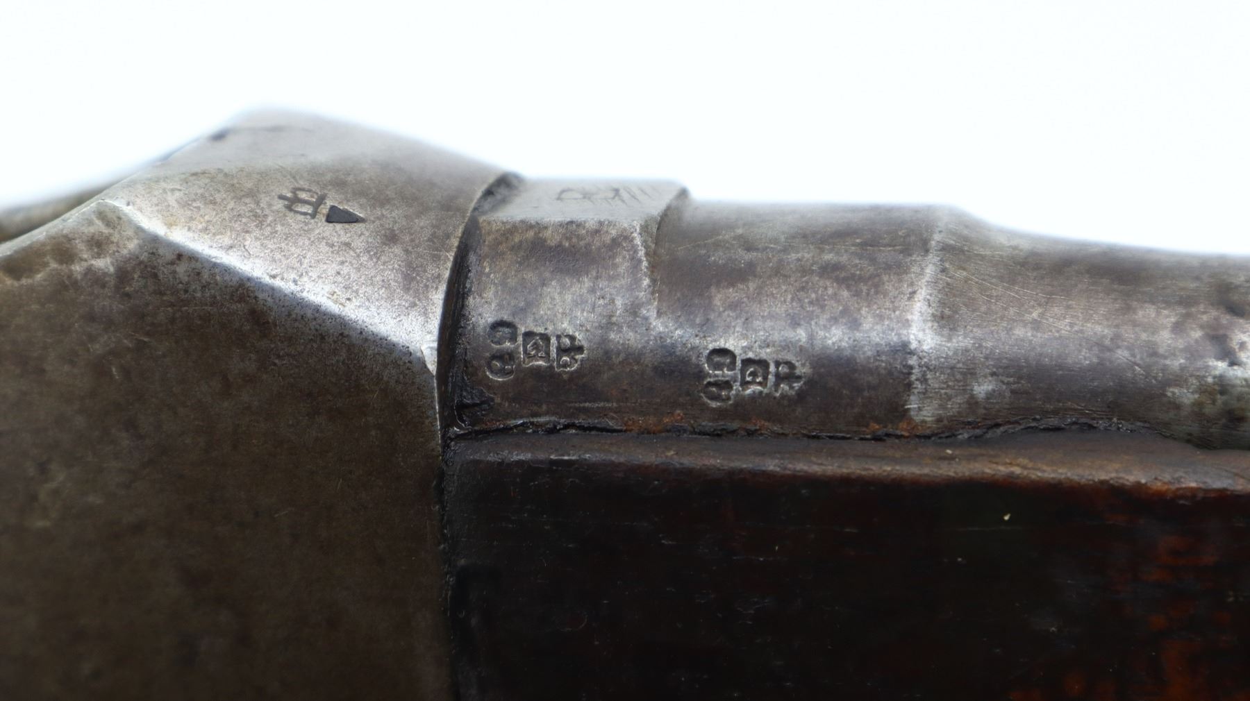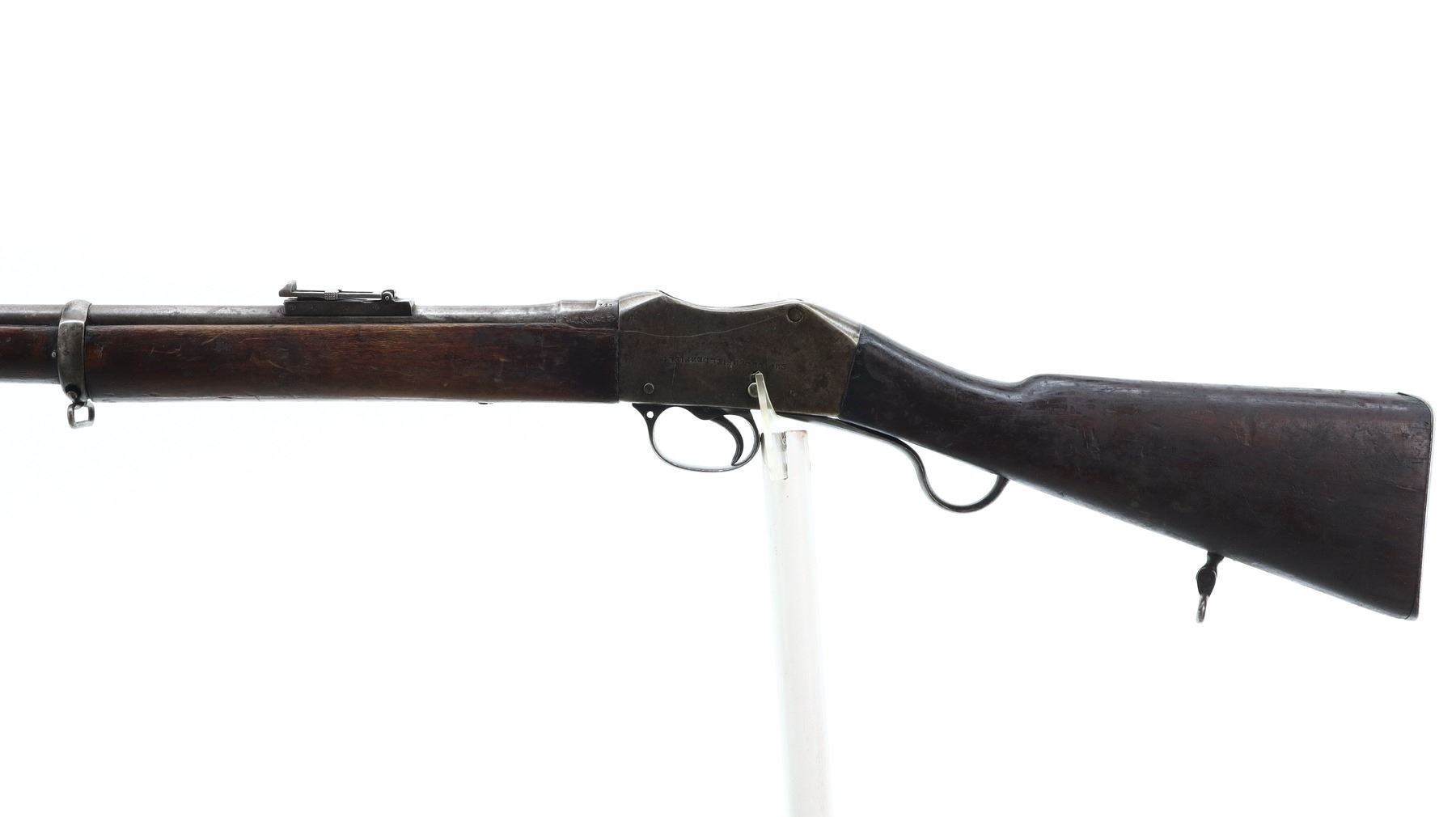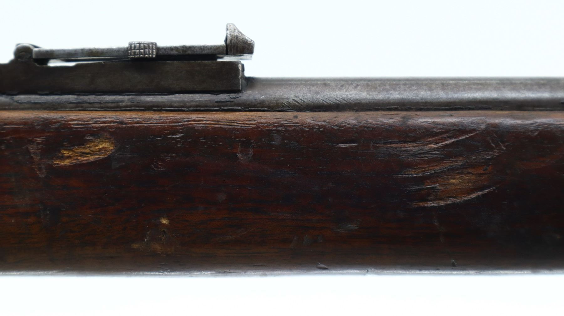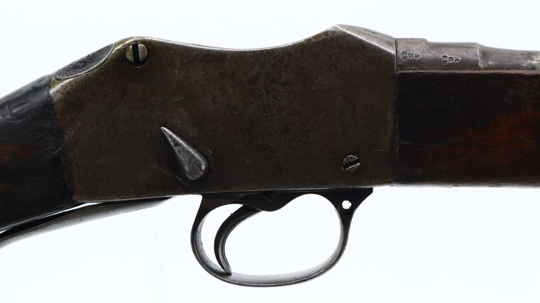 6/10, KHYBER PASS MARTINI ENFIELD, MODEL: MKII, CALIBER:303 BR, BORE IS POOR, VERY WORN, PITTED. THIS RIFLE IS A KHYBER PASS COPY OF A BRITISH ENFIELD RIFLE. NOTE: SEE A GUNSMITH BEFORE FIRING. BLADE FRONT SIGHT WITH RAMP, ADJUSTABLE U NOTCHED REAR SIGHT, VARIOUS IMPROPER COPY BRITISH PROOF MARKS INCLUDING ENFIELD STAMPED UPSIDE DOWN THREE TIMES IN A ROW ON LEFT SIDE OF RECEIVER. TWO PIECE FULL MILITARY WOOD STOCKS, STRAIGHT GRIP, SMOOTH STEEL BUTT PLATE, THREE SLING SWIVELS, NO CLEANING ROD. METAL FINISH TURNING SILVER GREY WITH LIGHT PITTING, RUST SPECKLES, HANDLING MARKS AND WEAR. STOCKS SHOW MARKS, SCRATCHES AND WEAR. , ACTION: SINGLE SHOT DROP BLOCK RIFLE, BARREL LENGTH: 30", SERIAL # 222, CONDITION: 6/10, CLASS: CANADIAN NON RESTRICTED