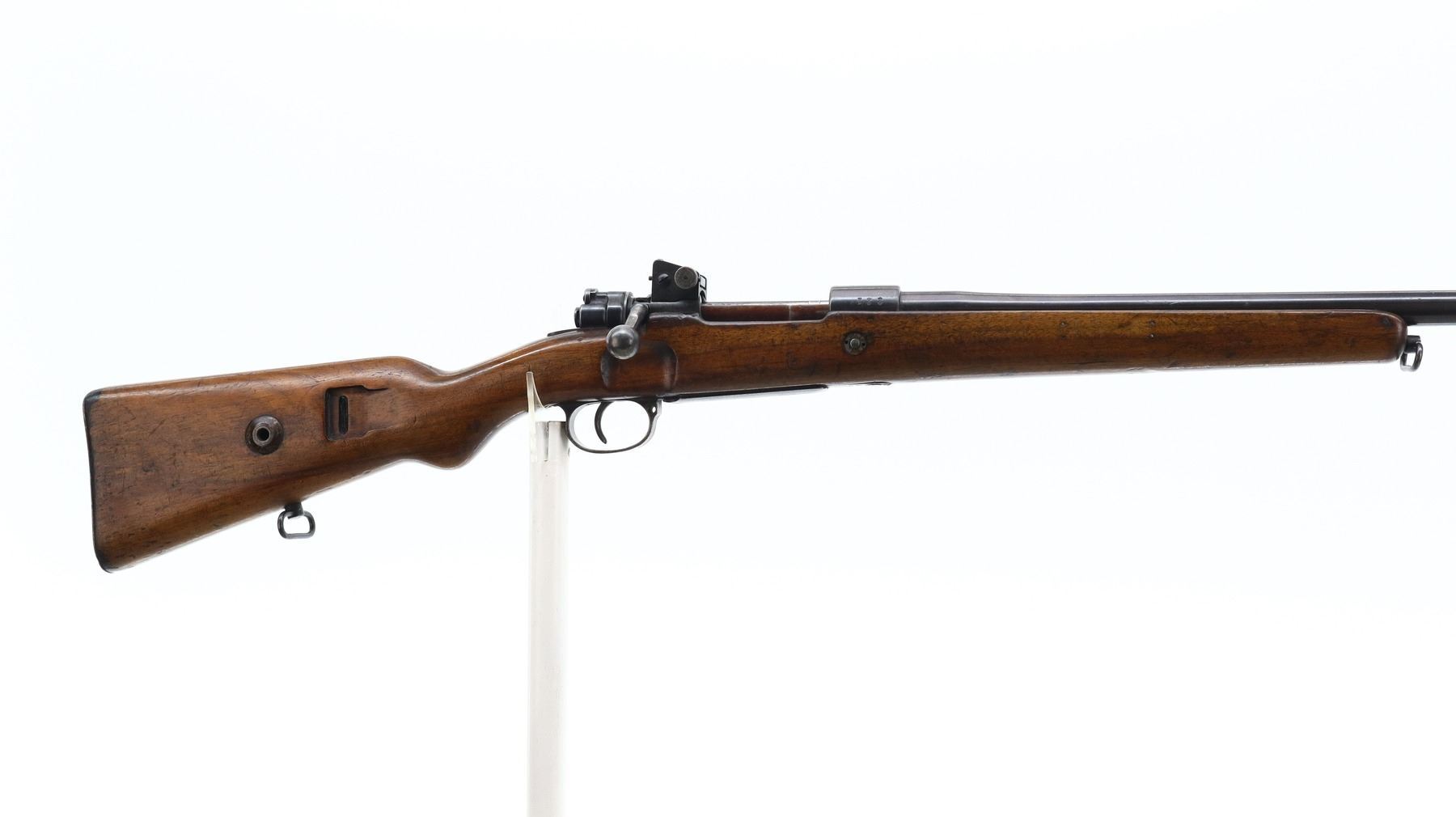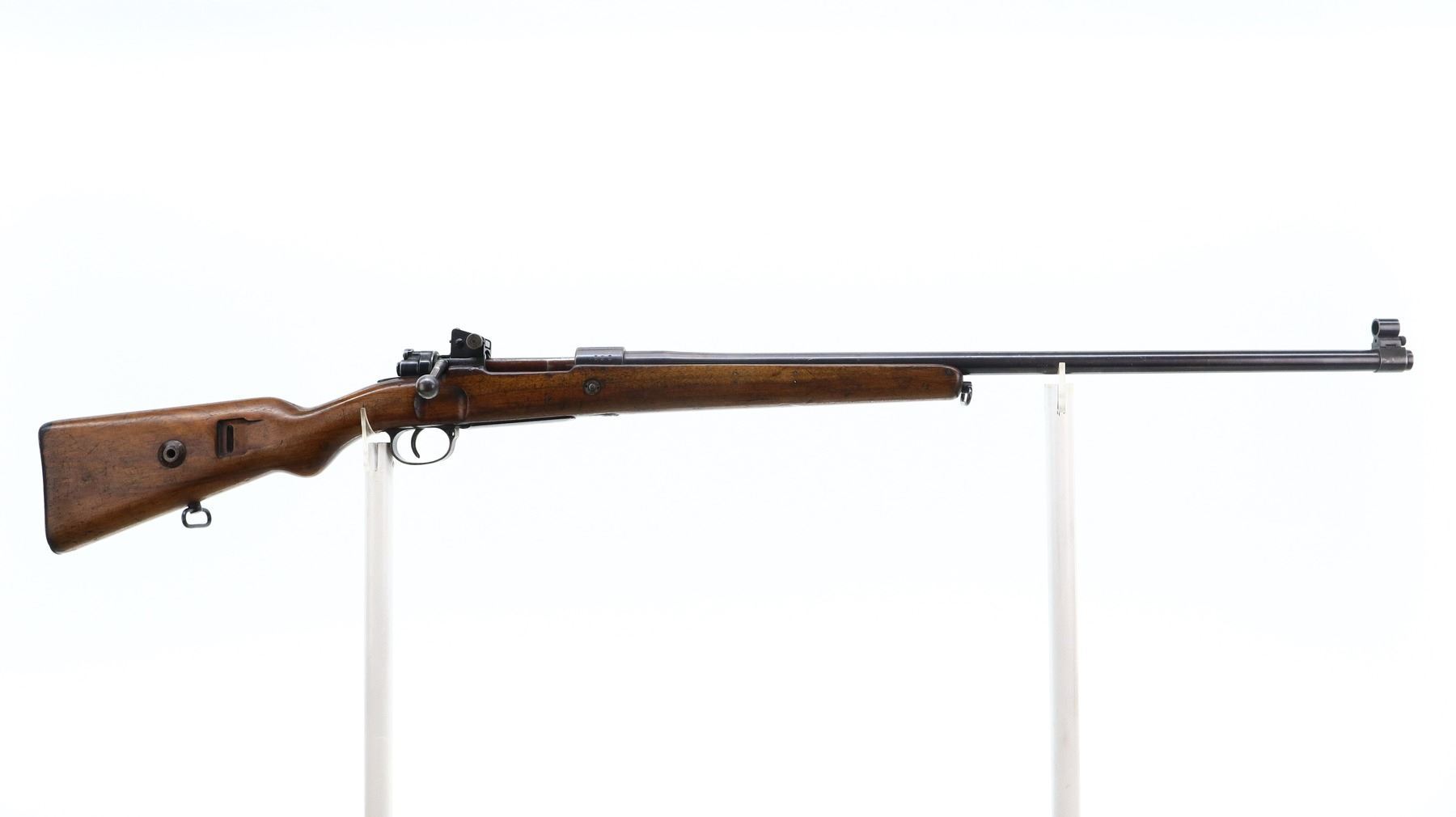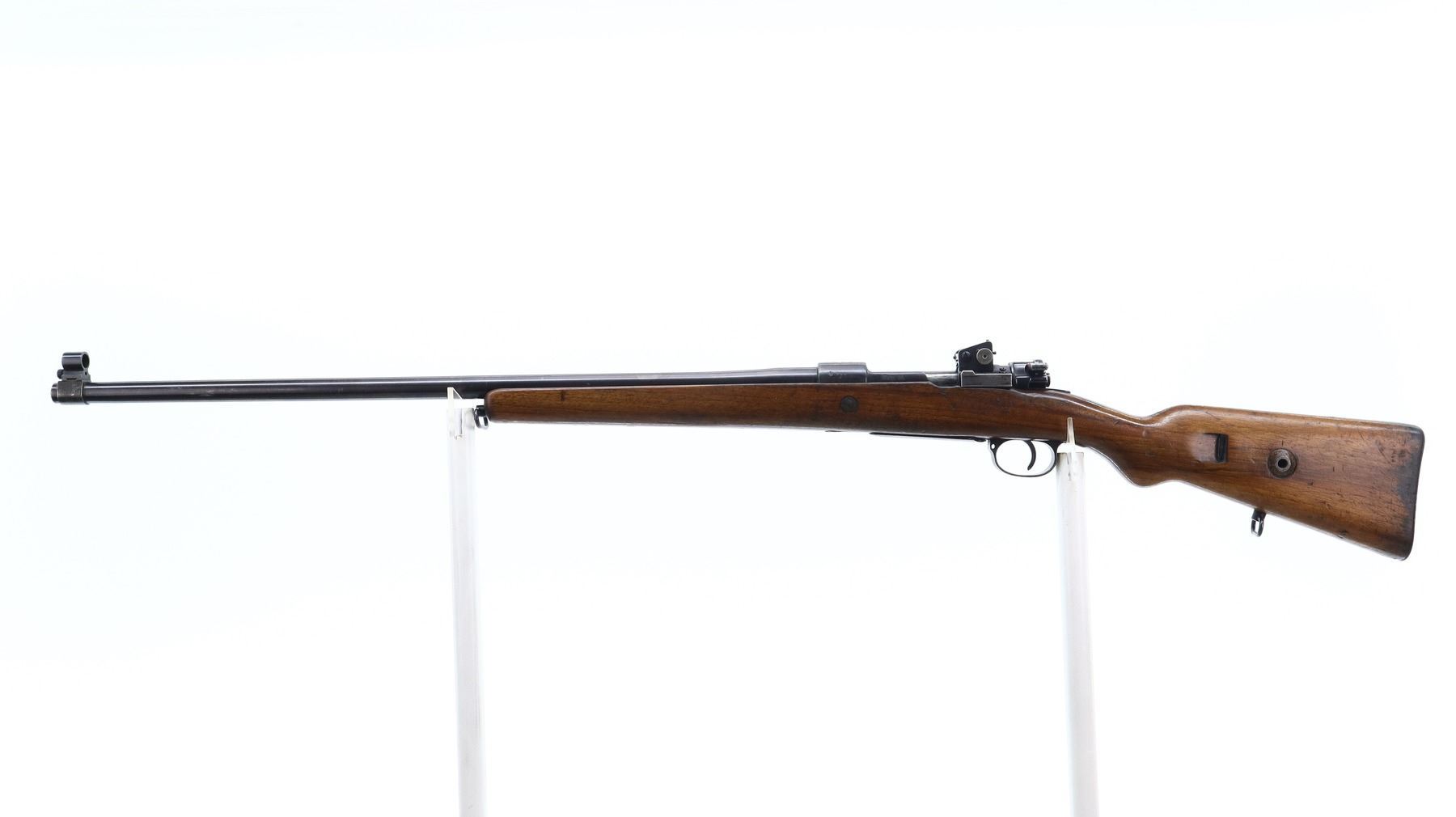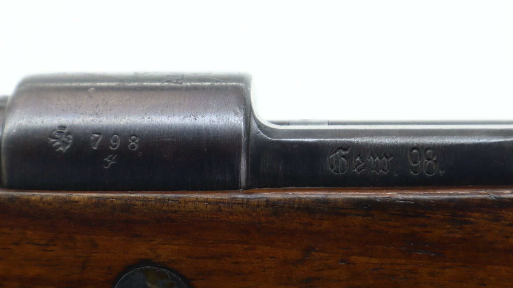7/10, GERMAN MAUSER, MODEL: 98 TARGET SCHULTZ & LARSEN, CALIBER:6.5 X 55, BORE IS FAIR, WORN, LIGHT PITTING. MANUFACTURED BY AMBERG 1918, BOLT MISMATCHED. GLOBE FRONT SIGHT WITH INSERT AND RAMP, ADJUSTABLE REAR PEEP SIGHT ON REAR RECEIVER BRIDGE, MEDIUM WEIGHT BARREL, MODIFIED BOLT HANDLE. ONE PIECE SPORTERIZED WOOD STOCK, PISTOL GRIP, STEEL STOCK DISK, SLING SWIVELS. METAL FINISH SHOWS SOME SCRATCHES, HANDLING MARKS AND WEAR. STOCKS SHOW SOME MARKS, SCRATCHES AND WEAR. , ACTION: BOLT ACTION RIFLE, BARREL LENGTH: 27.5", SERIAL # 798G, CONDITION: 7/10, CLASS: CANADIAN NON RESTRICTED