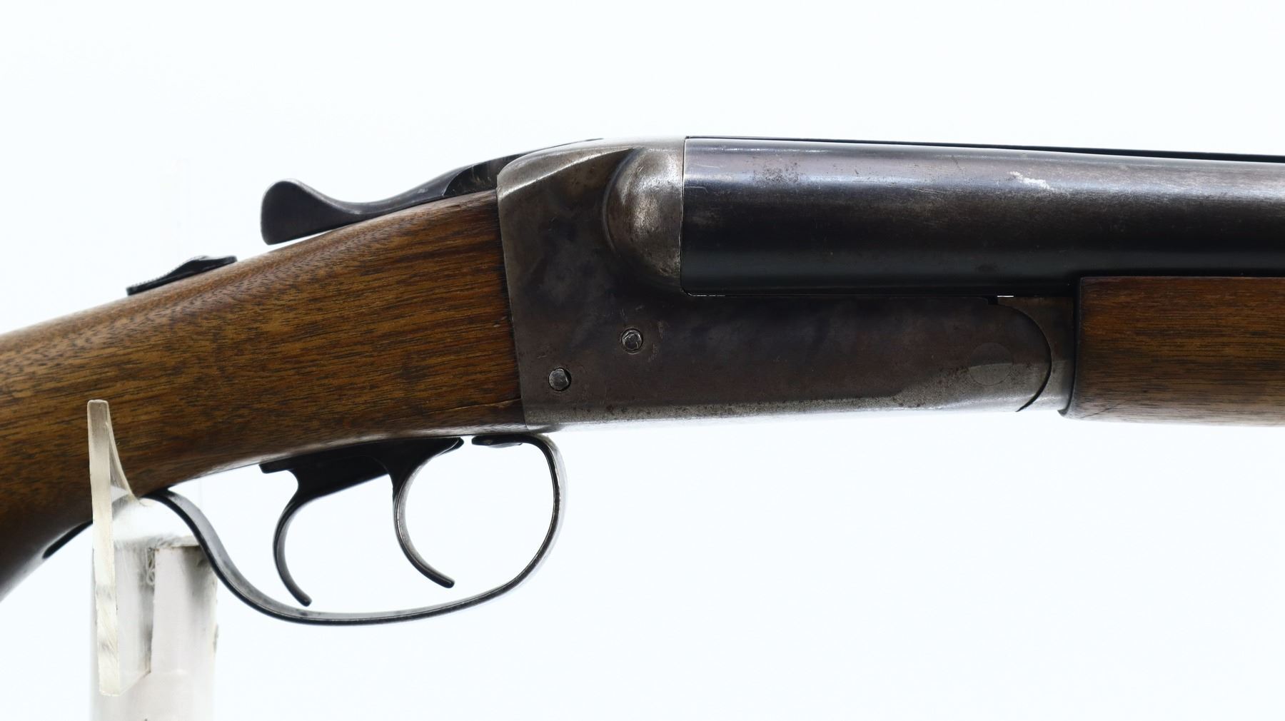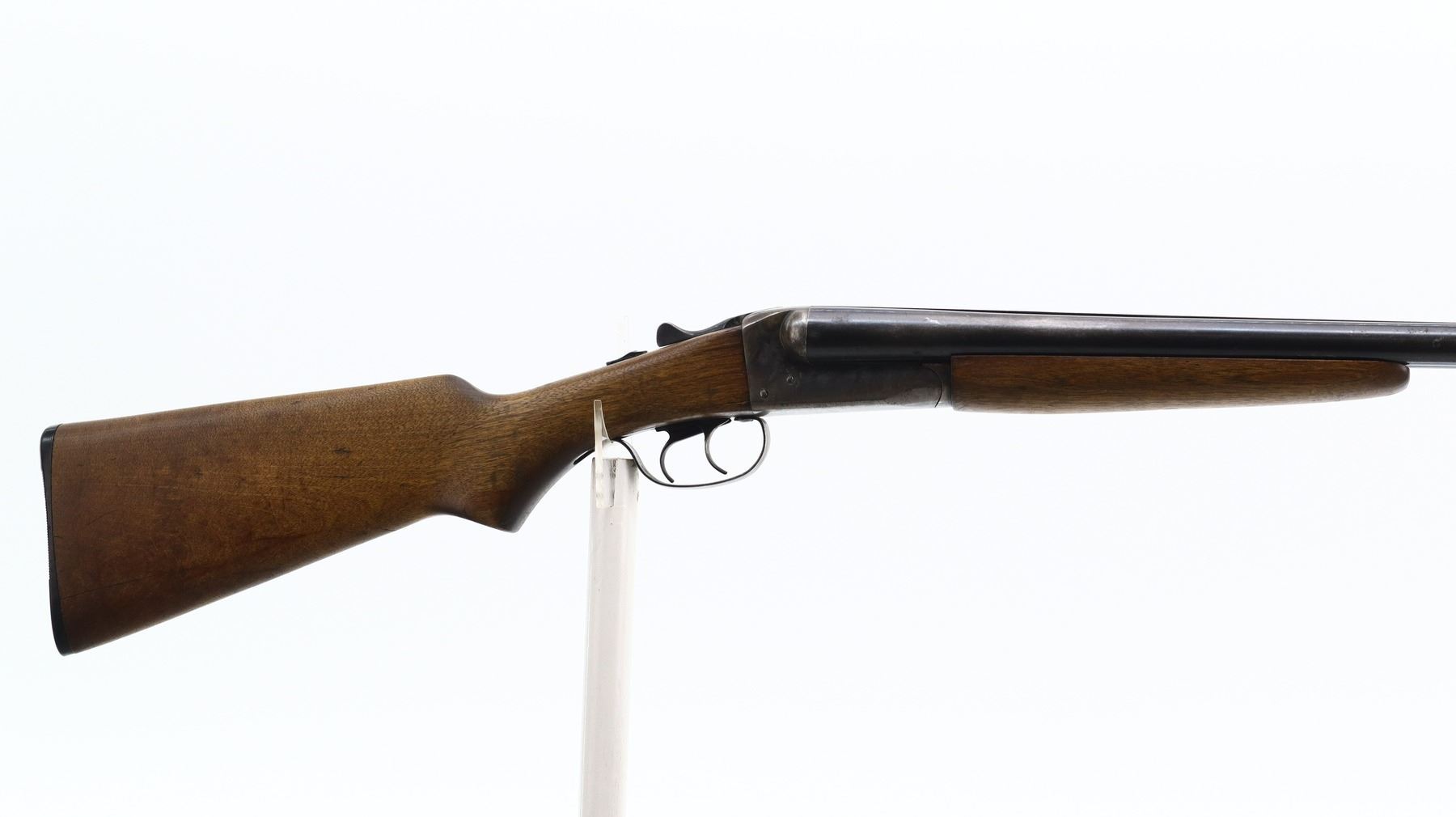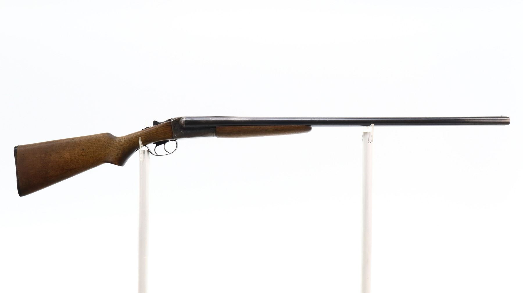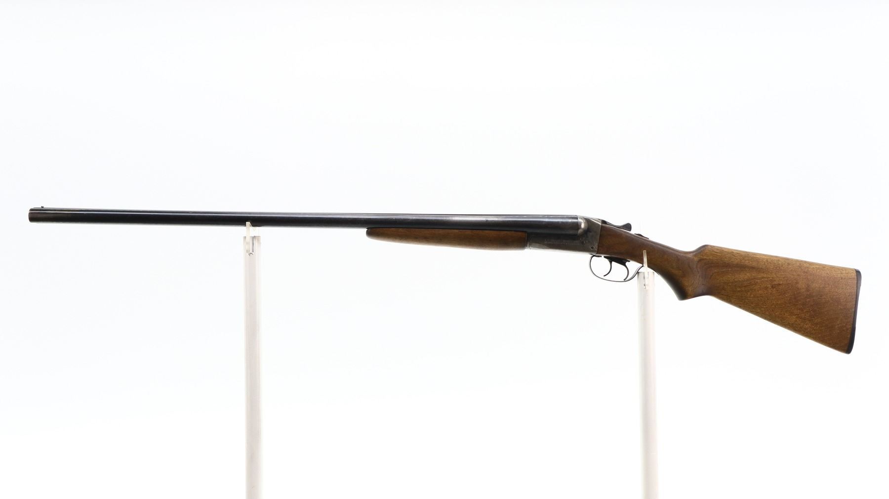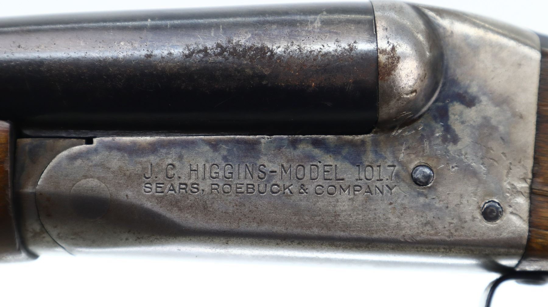 6/10, JC HIGGINS, MODEL: 101.7, CALIBER:12 G X 2 3/4", BORES ARE VERY GOOD. FIXED FULL AND IM CHOKES. SILVER BEAD, BLUED BARRELS WITH RAISED RIB, COLOUR CASE HARDENED RECEIVER, AUTOMATIC SAFETY, EXTRACTOR, DOUBLE TRIGGERS. TWO PIECE SMOOTH WOOD STOCKS, PISTOL GRIP, GROOVED BLACK POLYMER BUTT PLATE. METAL FINISH SHOWS SOME LIGHT PITTING, RUST SPECKLES, HANDLING MARKS AND WEAR. STOCK CRACKED BEHIND RECEIVER BOTH SIDES, SHOWS SOME MARKS, SCRATCHES AND WEAR. , ACTION: HINGED SIDE BY SIDE SHOTGUN, BARREL LENGTH: 30", SERIAL # NA, CONDITION: 6/10, CLASS: CANADIAN NON RESTRICTED