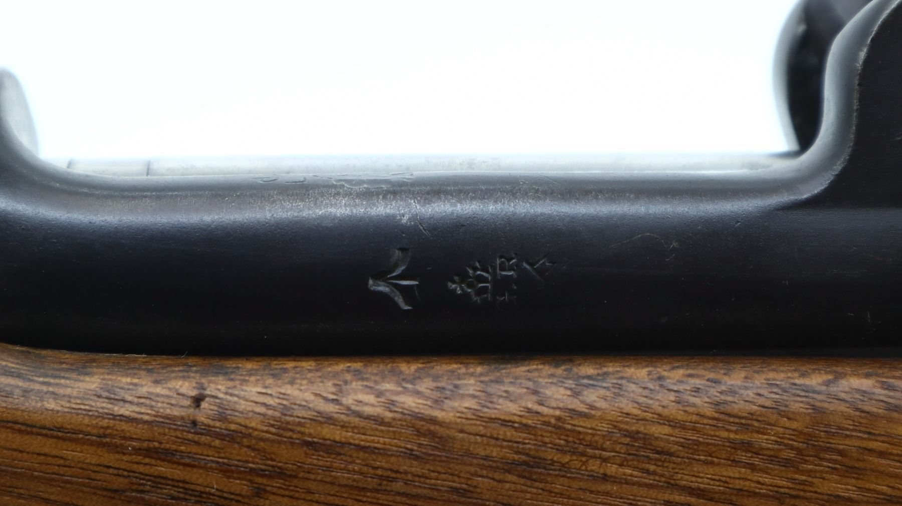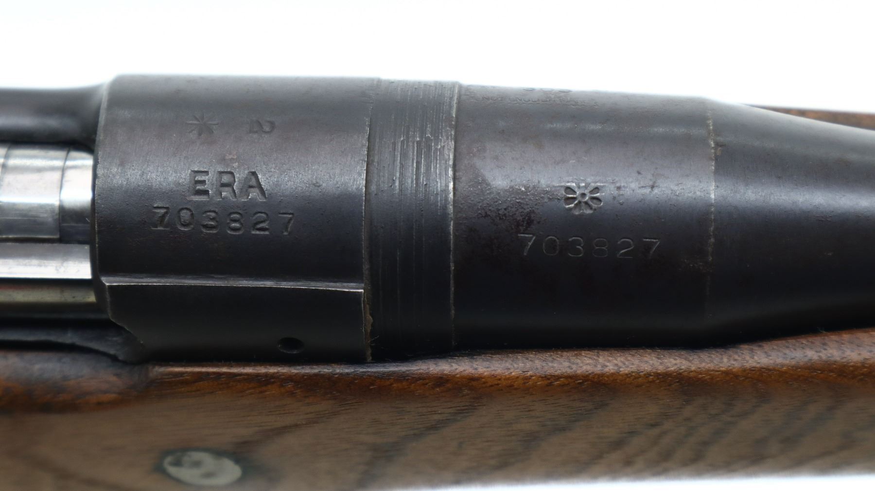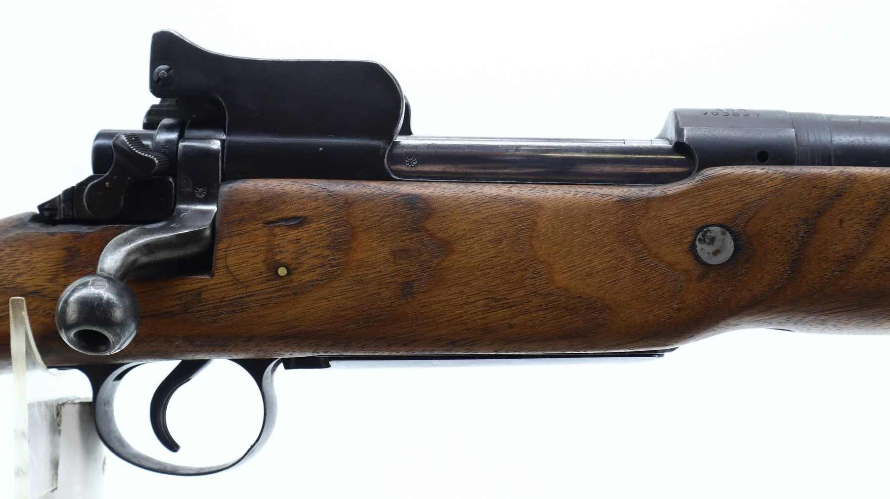 7/10, ENFIELD, MODEL: P14 SPORTER, CALIBER:303 BR, BORE IS FAIR, WORN, LIGHT PITTING. MANUFACTURED BY ERA, VISIBLE NUMBERS MATCH. BLADE FRONT SIGHT WITH EARS AND RAMP, ADJUSTABLE REAR PEEP SIGHT WITH EARS, BOLT STOP SPRING BROKEN. ONE PIECE SPORTERIZED WOOD STOCK, PISTOL GRIP, SMOOTH STEEL BUTT PLATE WITH TRAP, 25 CENT COIN INLET INTO STOCK, SWIVEL STUDS. METAL FINISH SHOWS SOME SCRATCHES, HANDLING MARKS AND WEAR. STOCK SHOWS SOME MARKS, SCRATCHES AND WEAR. , ACTION: BOLT ACTION RIFLE, BARREL LENGTH: 26", SERIAL # 703827, CONDITION: 7/10, CLASS: CANADIAN NON RESTRICTED