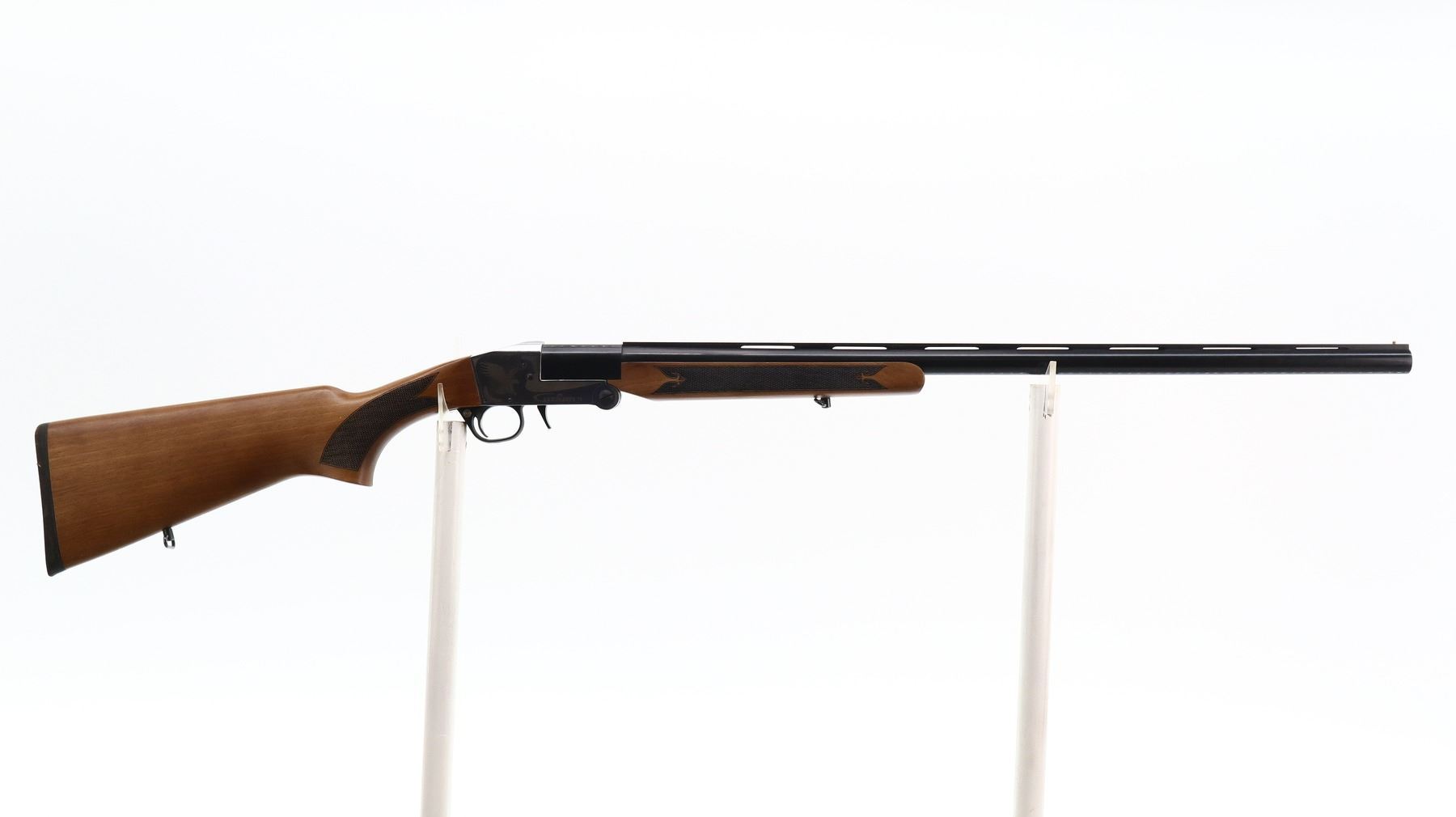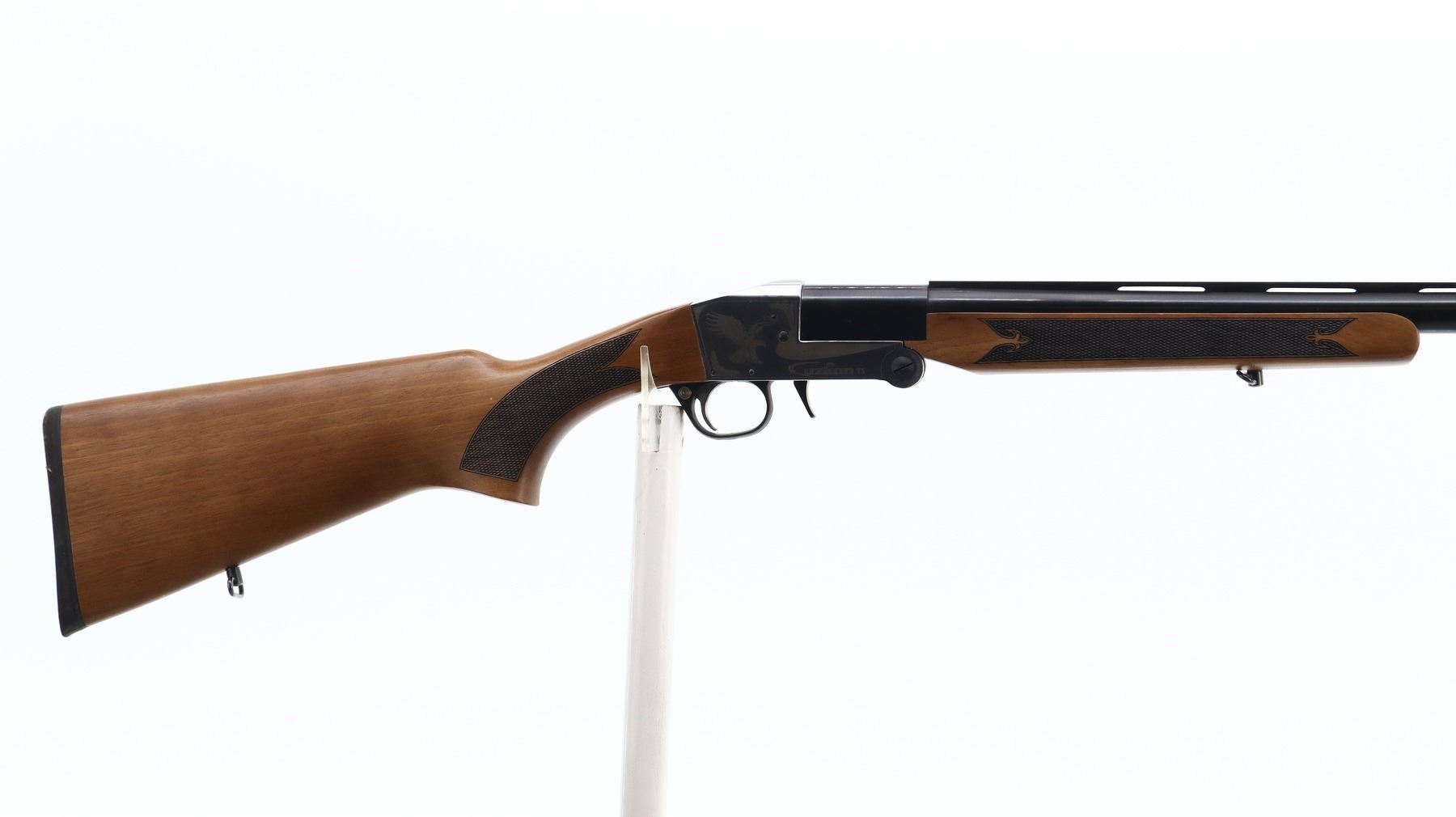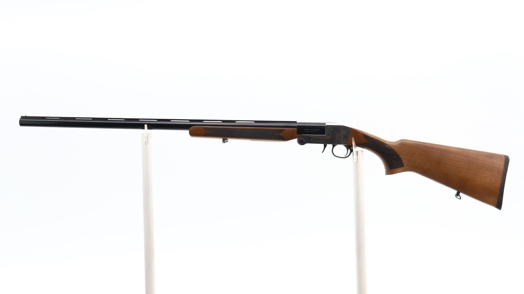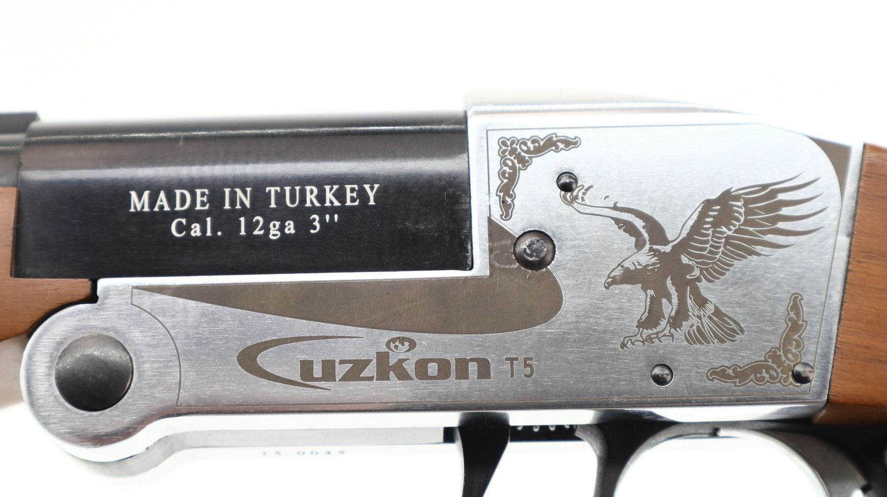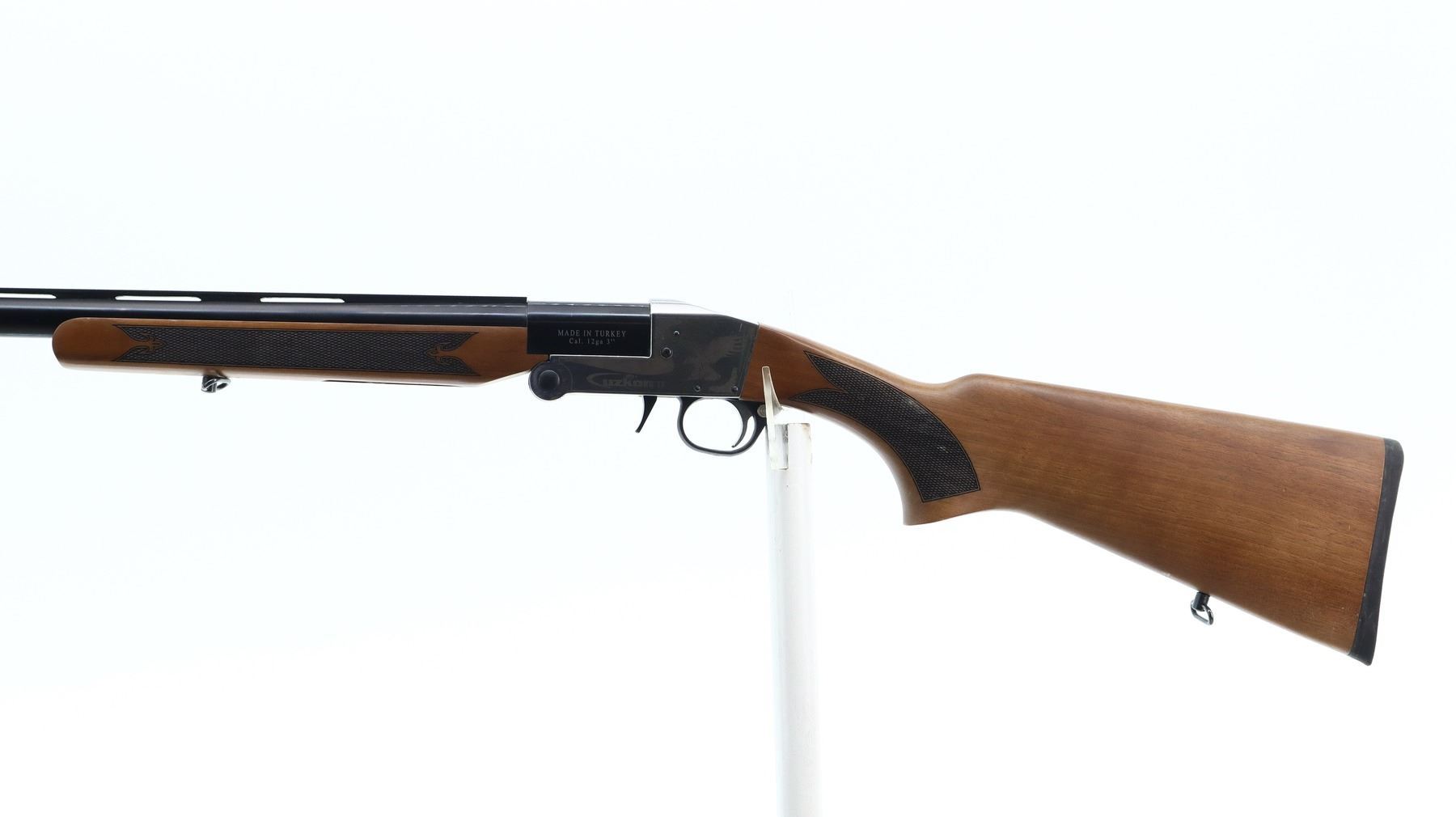 7/10, UZKON, MODEL: T5, CALIBER:12 G X 3", BORE IS VERY GOOD. FIXED IC CHOKE. BRASS BEAD, BLUED VENT RIB BARREL, SILVER RECEIVER WITH LAZER ETCHING, CROSS BOLT SAFETY, EXTRACTOR. TWO PIECE WOOD STOCKS, CHECKERED FOREARM AND PISTOL GRIP, BLACK RUBBER RECOIL PAD, SLING SWIVELS. METAL FINISH SHOWS SOME SCRATCHES AND HANDLING MARKS. STOCKS SHOW SOME MARKS, SCRATCHES AND WEAR. , ACTION: HINGED SINGLE SHOT SHOTGUN, BARREL LENGTH: 28", SERIAL # 150045, CONDITION: 7/10, CLASS: CANADIAN NON RESTRICTED