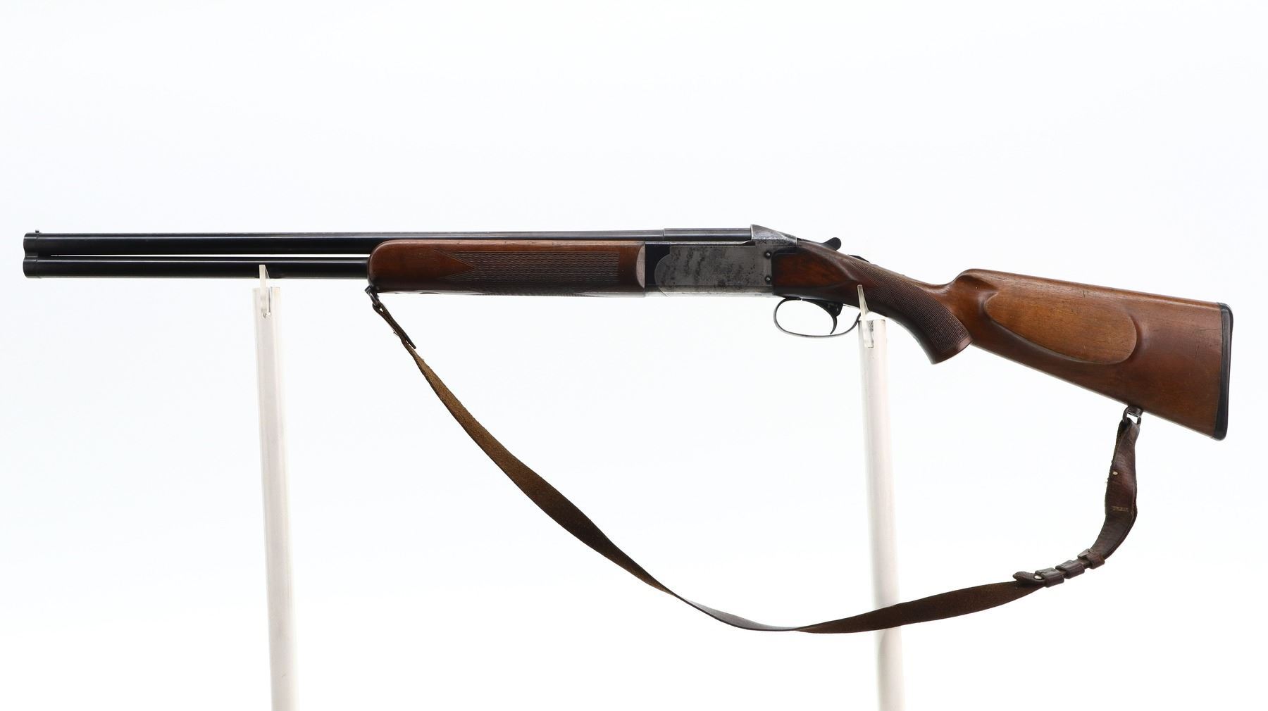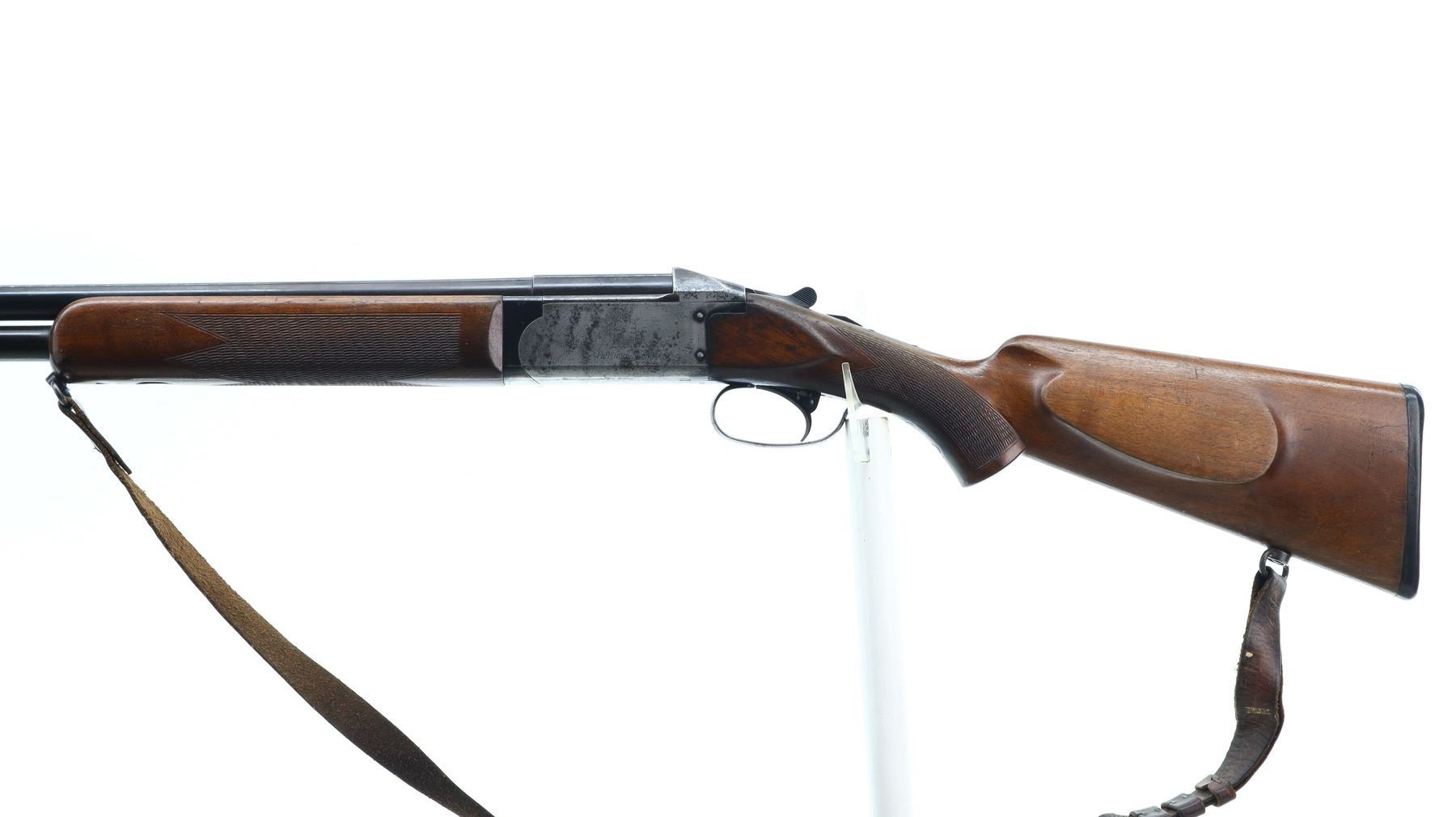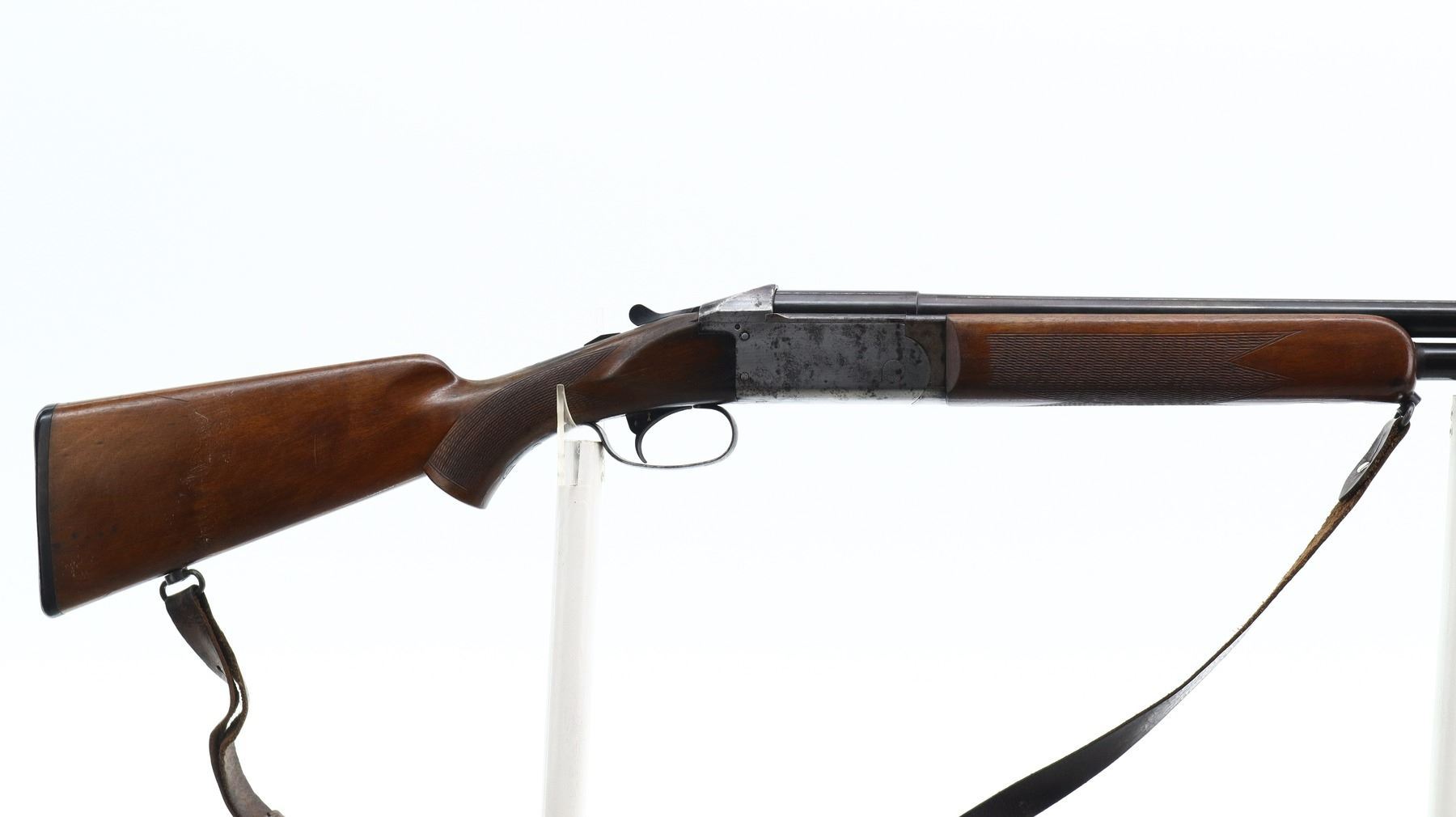 6/10, VALMET, MODEL: LION, CALIBER:12 G X 2 3/4", BORES ARE VERY GOOD. FIXED FULL CHOKES. SILVER BEAD, ROUND BARRELS, BLUED FINISH, AUTOMATIC SAFETY, EXTRACTOR, SINGLE SELECTIVE MECHANICAL TRIGGER. TWO PIECE WOOD STOCKS, CHECKERED FOREARM AND PISTOL GRIP, CHEEK REST, SMOOTH BLACK POLYMER BUTT PLATE, SWIVELS WITH BROWN LEATHER SLING. METAL FINISH SHOWS SOME LIGHT PITTING, SCRATCHES, HANDLING MARKS AND WEAR. STOCKS SHOW SOME MARKS, SCRATCHES AND WEAR. , ACTION: HINGED OVER UNDER SHOTGUN, BARREL LENGTH: 25.75", SERIAL # H1950, CONDITION: 6/10, CLASS: CANADIAN NON RESTRICTED