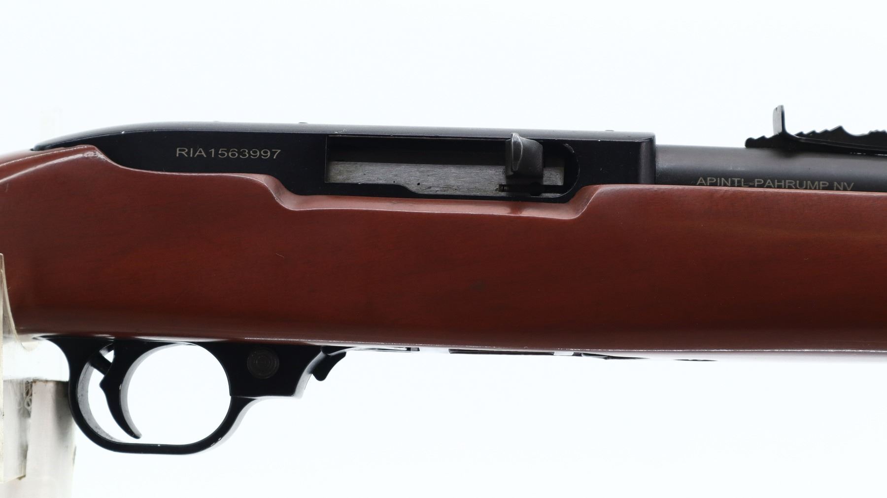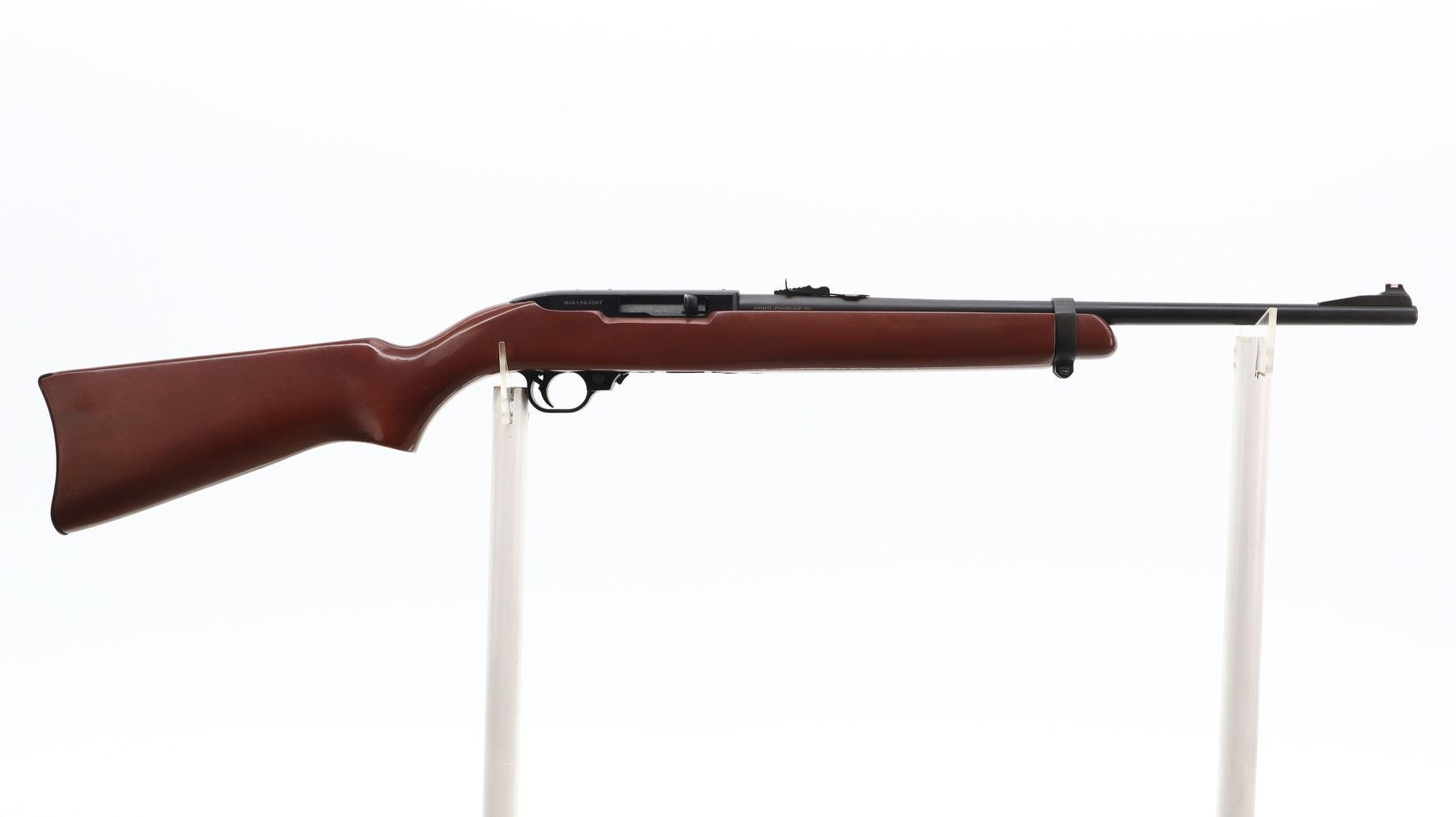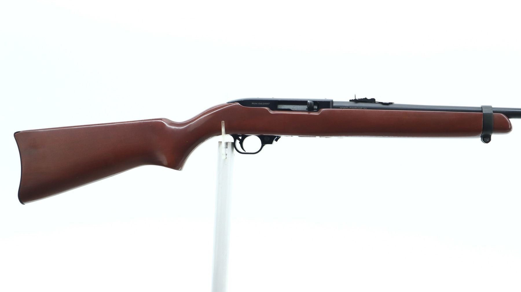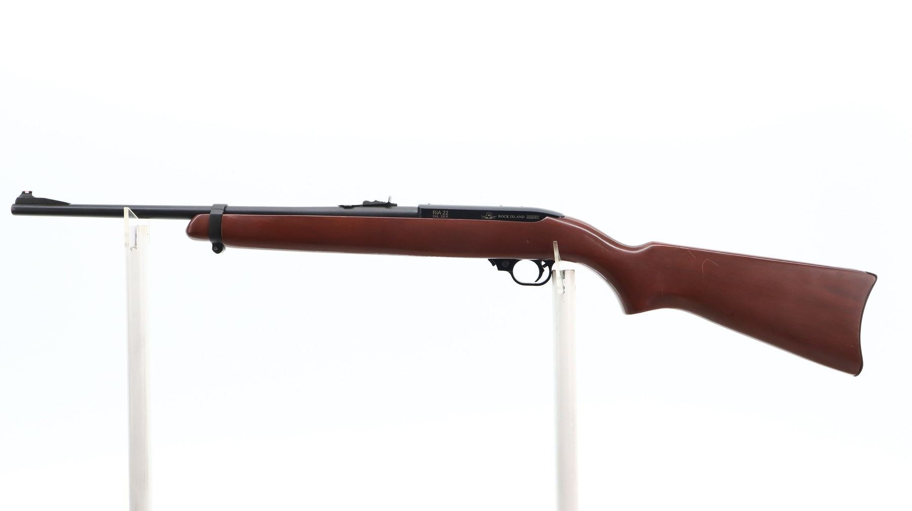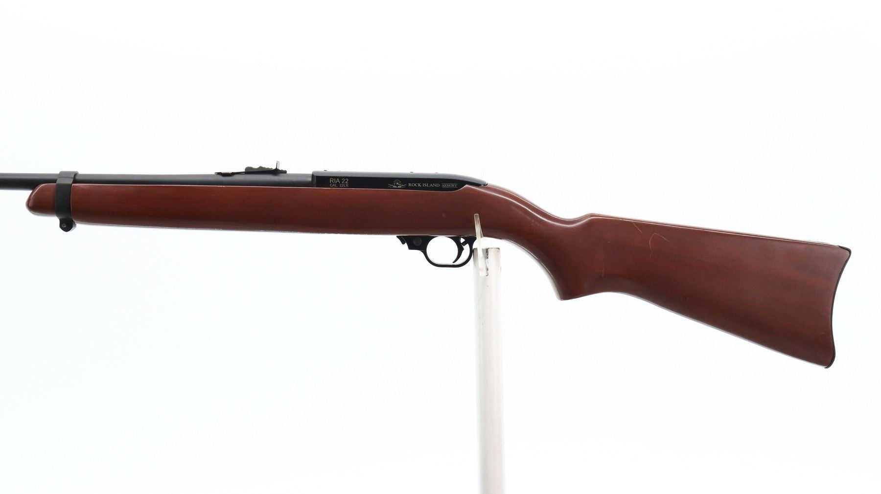 7/10, RIA, MODEL: RIA 22, CALIBER:22 LR, COMES WITH MAGAZINE, BORE IS VERY GOOD. RIFLE IS A COPY OF A RUGER 10/22. RED FIBER OPTIC BLADE FRONT SIGHT WITH RAMP, ADJUSTABLE U NOTCHED REAR SIGHT, BLACK MATTE FINISH STEEL BARREL, BLACK ALLOY RECEIVER DRILLED AND TAPPED FOR SCOPE MOUNT. ONE PIECE SMOOTH WOOD STOCK, PISTOL GRIP, SMOOTH CURVED STEEL BUTT PLATE, SINGLE BARREL BAND. METAL FINISH SHOWS SOME SCRATCHES, HANDLING MARKS AND WEAR. STOCK SHOWS SOME MARKS, SCRATCHES AND WEAR. , ACTION: SEMI AUTOMATIC RIFLE, BARREL LENGTH: 18.5", SERIAL # RIA1563997, CONDITION: 7/10, CLASS: CANADIAN NON RESTRICTED