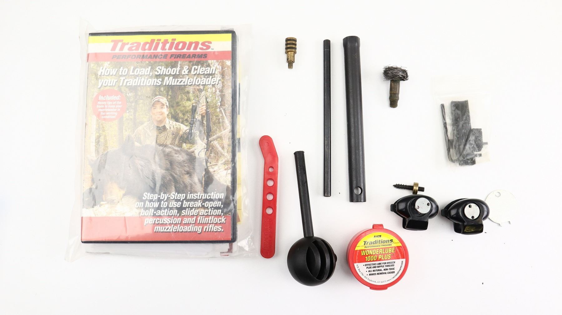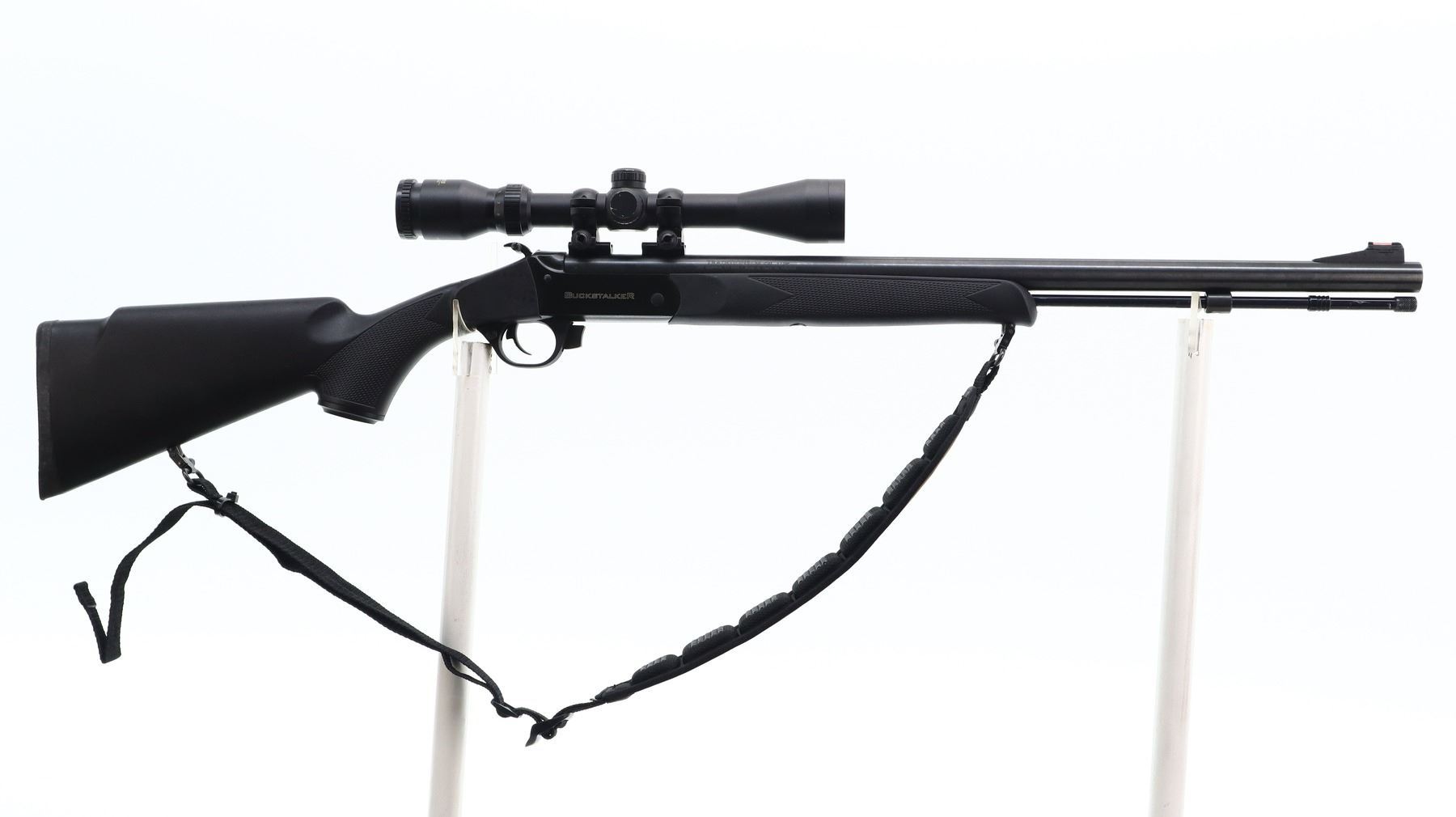 7+/10, TRADITIONS, MODEL: BUCK STOCKER, CALIBER:50 CAL, COMES WITH TOOLS, ACC, BORE IS EXCELLENT. RED FIBER OPTIC FRONT SIGHT WITH RAMP, GREEN FIBER OPTIC REAR SIGHT REMOVED BUT INCLUDED WITH ACCESSORIES, BLUED ROUND STEEL BARREL, BLACK ALLOY RECEIVER, GROOVED SPUR HAMMER WITH EXTENSION, 209 PRIMING SYSTEM, BARREL DRILLED AND TAPPED WITH TRADITIONS 3-9 X 32 SCOPE, CLEAR OPTICS WITH CIRCLE X RETICLE. TWO PIECE BLACK SYNTHETIC STOCKS, CHECKERED FOREARM AND PISTOL GRIP, CHECKERED BLACK RUBBER RECOIL PAD, GRIP CAP, SLING SWIVELS WITH CAMO NYLON SLING, ALUMINUM RAMROD. ACCESSORIES INCLUDE: MANUAL, DVD, BULLET STARTER, CAPPER, BREECH PLUG TOOLS, JAGS AND TRIGGER LOCK. METAL FINISH SHOWS SOME SCRATCHES, HANDLING MARKS AND WEAR. STOCKS SHOW SOME MARKS AND SCRATCHES. , ACTION: INLINE PERCUSSION RIFLE, BARREL LENGTH: 24", SERIAL # 141300606210, CONDITION: 7+/10, CLASS: CANADIAN NON RESTRICTED