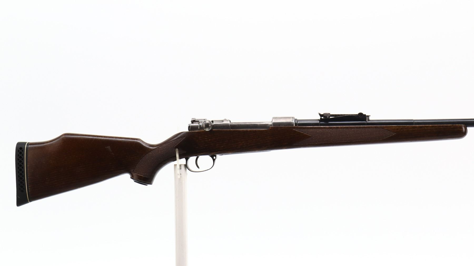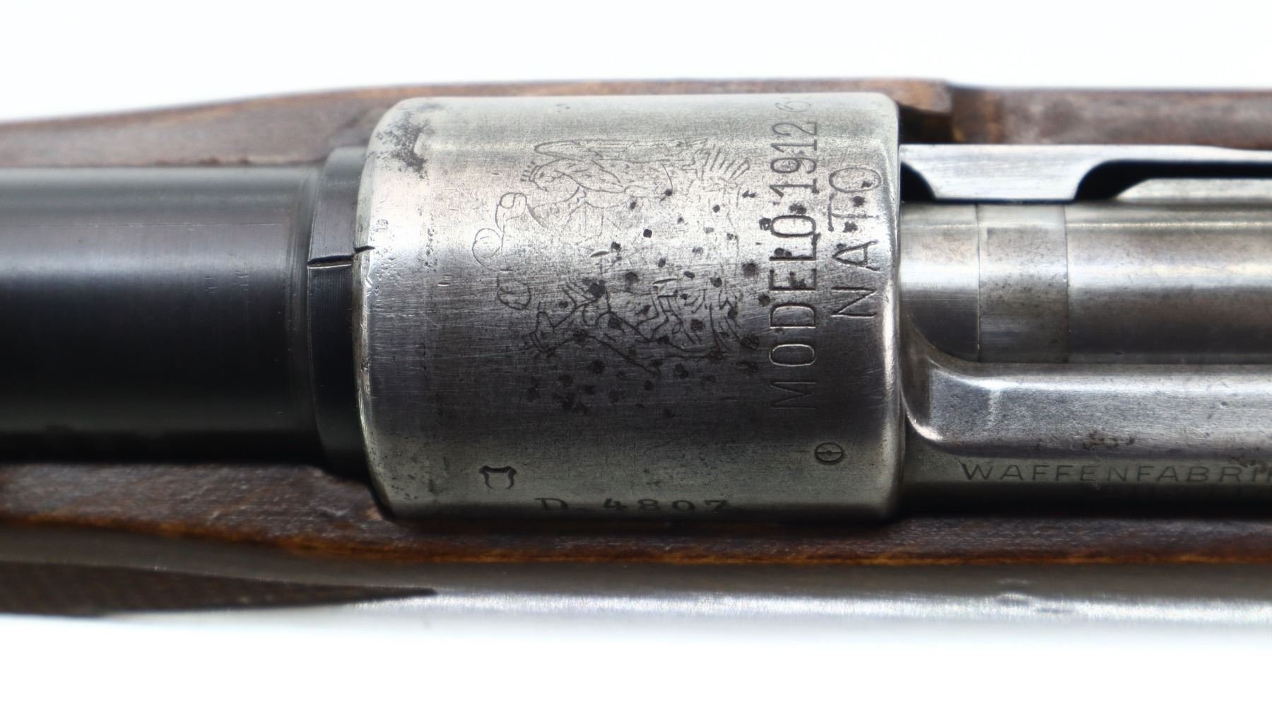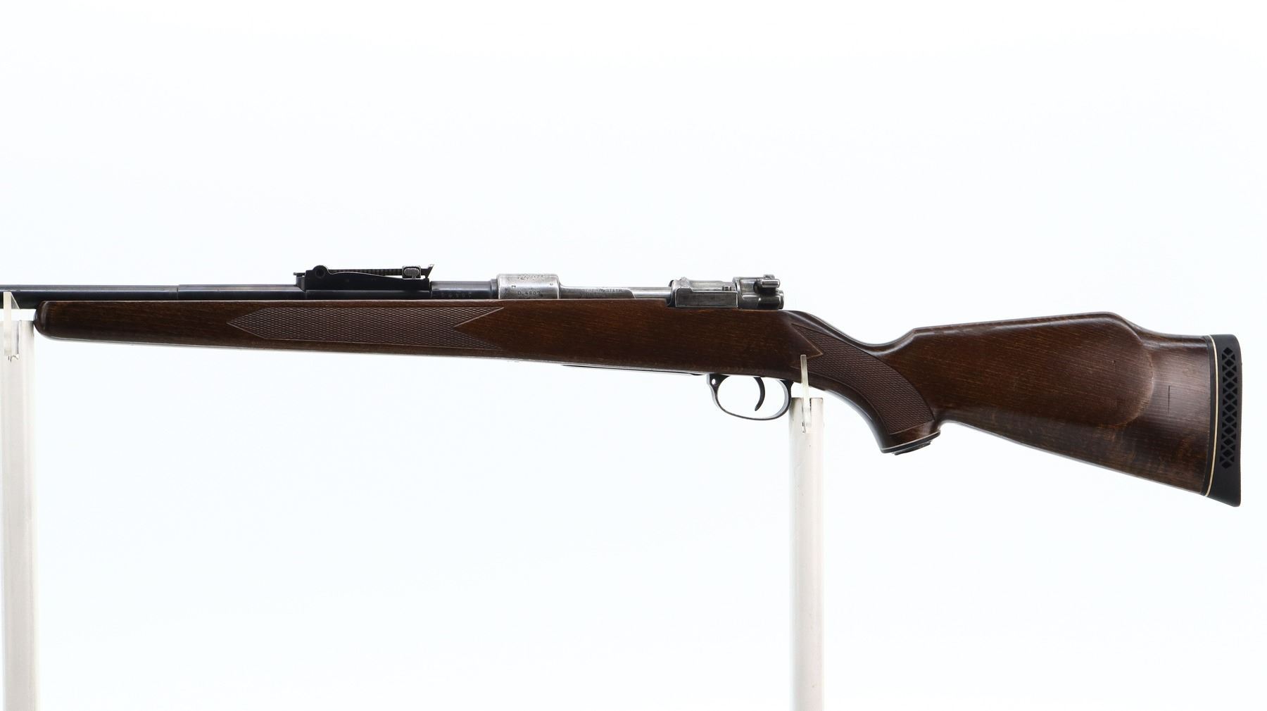 6/10, CHILEAN MAUSER, MODEL: 1912 SPORTER, CALIBER:7.62N, BORE IS GOOD. MANUFACTURED BY STEYR, BOLT MISMATCHED. BARLEY CORN FRONT SIGHT WITH RAMP, ADJUSTABLE U NOTCHED REAR SIGHT, CHILEAN CREST ON RECEIVER RING, STRAIGHT BOLT HANDLE. ONE PIECE WOOD STOCK, CHECKERED FOREARM AND PISTOL GRIP, CHEEK REST, BLACK VENTED RUBBER RECOIL PAD, GRIP CAP. METAL FINISH SHOWS SOME PITTING, LIGHT RUST SPECKLES, HANDLING MARKS AND WEAR. STOCK SHOWS SOME MARKS, SCRATCHES AND WEAR. , ACTION: BOLT ACTION RIFLE, BARREL LENGTH: 23.75", SERIAL # D4807, CONDITION: 6/10, CLASS: CANADIAN NON RESTRICTED