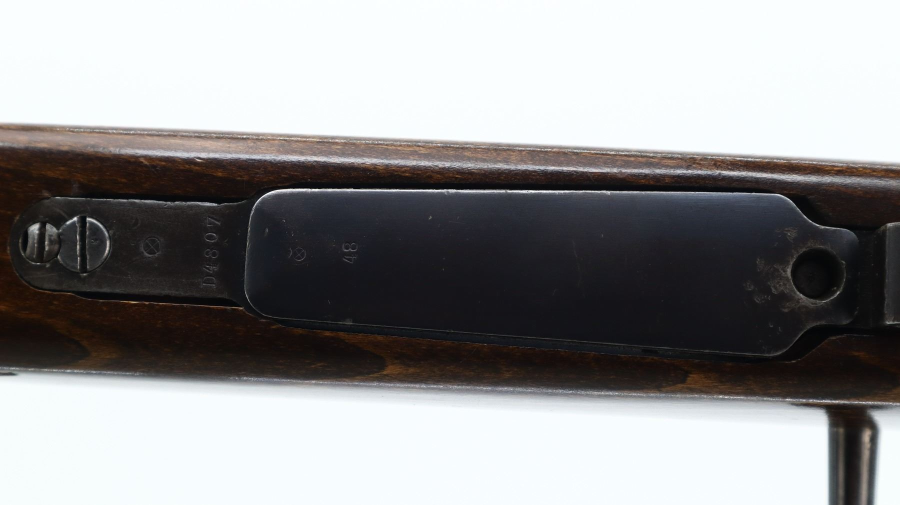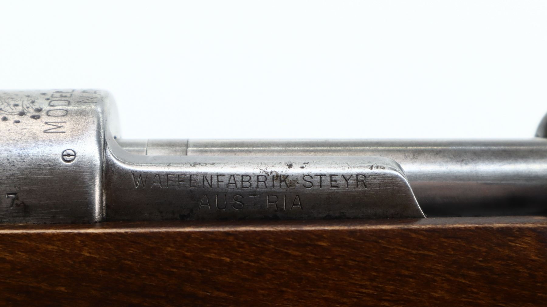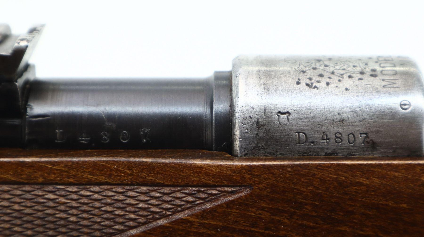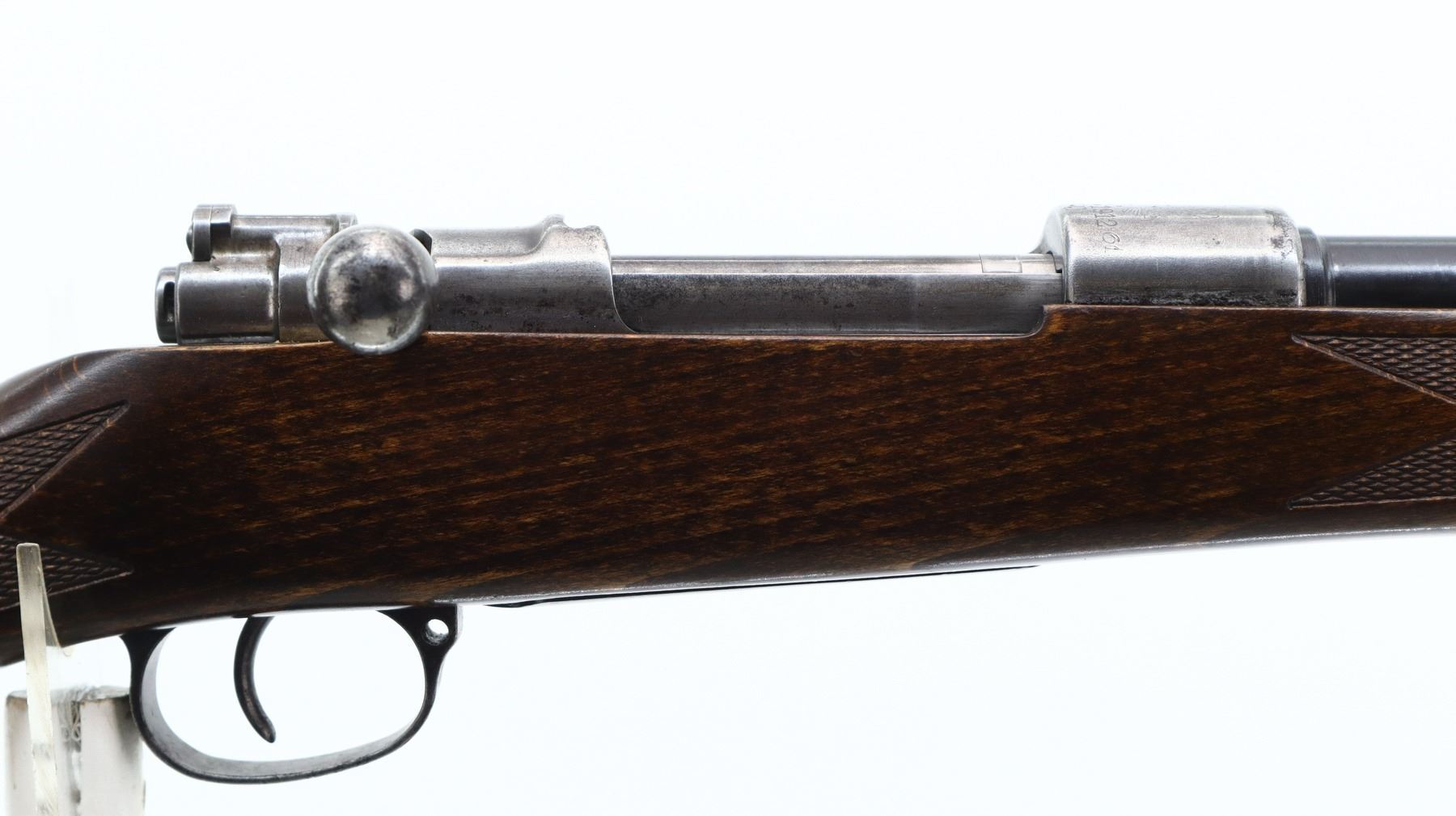 6/10, CHILEAN MAUSER, MODEL: 1912 SPORTER, CALIBER:7.62N, BORE IS GOOD. MANUFACTURED BY STEYR, BOLT MISMATCHED. BARLEY CORN FRONT SIGHT WITH RAMP, ADJUSTABLE U NOTCHED REAR SIGHT, CHILEAN CREST ON RECEIVER RING, STRAIGHT BOLT HANDLE. ONE PIECE WOOD STOCK, CHECKERED FOREARM AND PISTOL GRIP, CHEEK REST, BLACK VENTED RUBBER RECOIL PAD, GRIP CAP. METAL FINISH SHOWS SOME PITTING, LIGHT RUST SPECKLES, HANDLING MARKS AND WEAR. STOCK SHOWS SOME MARKS, SCRATCHES AND WEAR. , ACTION: BOLT ACTION RIFLE, BARREL LENGTH: 23.75", SERIAL # D4807, CONDITION: 6/10, CLASS: CANADIAN NON RESTRICTED