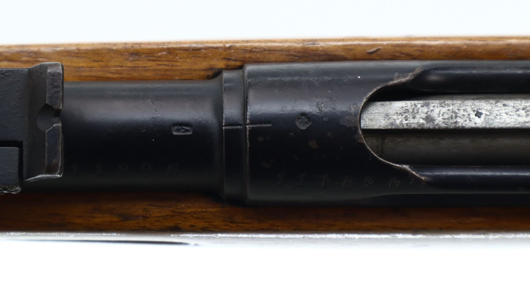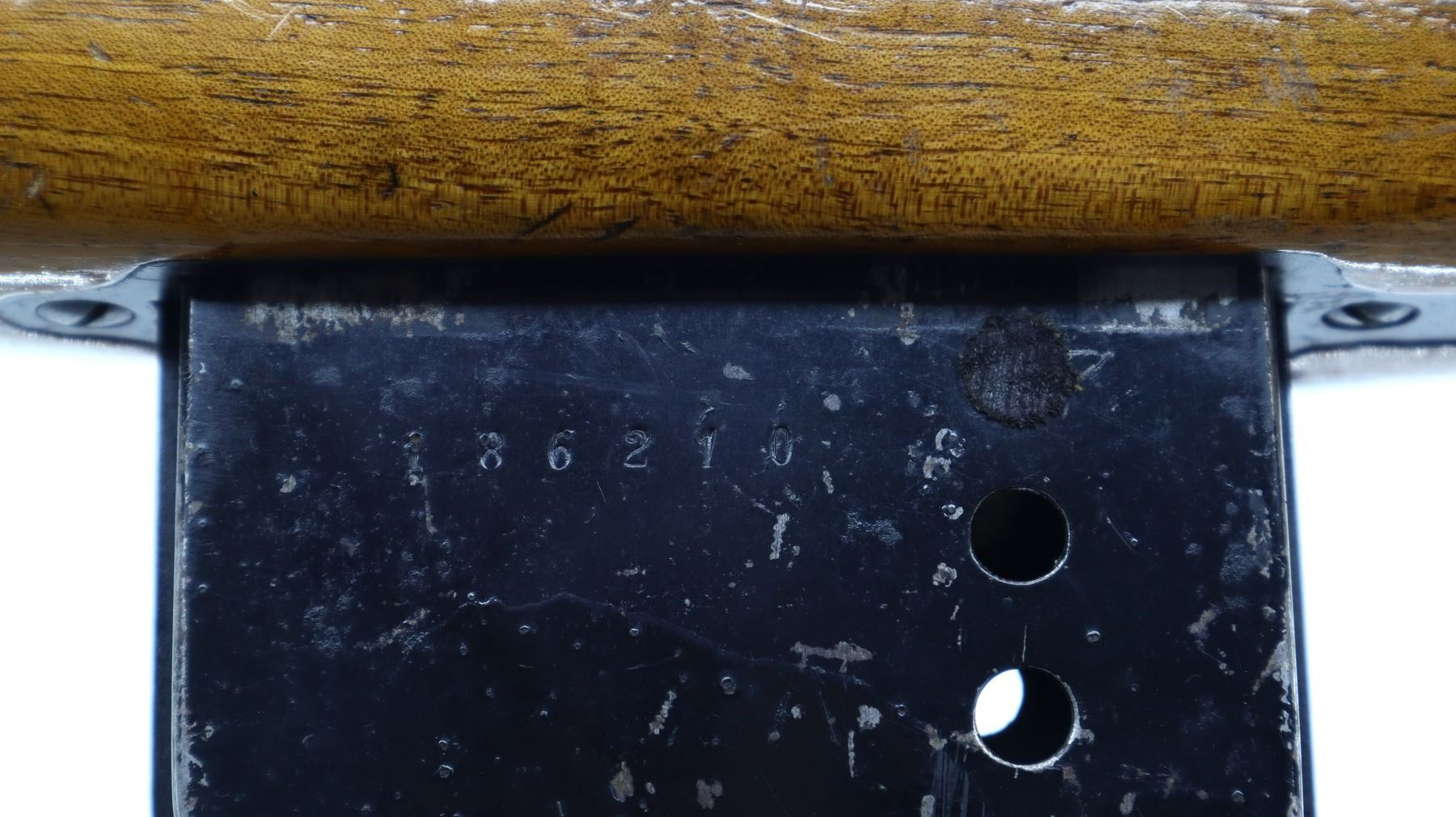 6/10, SWISS SCHMIDT RUBIN, MODEL: 1889 SPORTER, CALIBER:7.5 X 53.5, COMES WITH MAGAZINE, BORE IS GOOD, LIGHT PITTING. MANUFACTURED 1892, VISIBLE NUMBERS MATCH EXCEPT MAGAZINE. BARLEY CORN FRONT SIGHT WITH RAMP, ADJUSTABLE U NOTCHED REAR SIGHT, BLACK PAINTED FINISH, BOLT KNOBS DAMAGED. ONE PIECE SPORTERIZED WOOD STOCK, FINGER GROOVED FOREND, STRAIGHT GRIP, SMOOTH STEEL BUTT PLATE, REAR SWIVEL ONLY. METAL FINISH SHOWS SCRATCHES, HANDLING MARKS AND WEAR. STOCK SHOWS SOME MARKS, SCRATCHES AND WEAR. , ACTION: STRAIGHT PULL RIFLE, BARREL LENGTH: 30.75", SERIAL # 111896, CONDITION: 6/10, CLASS: CANADIAN NON RESTRICTED