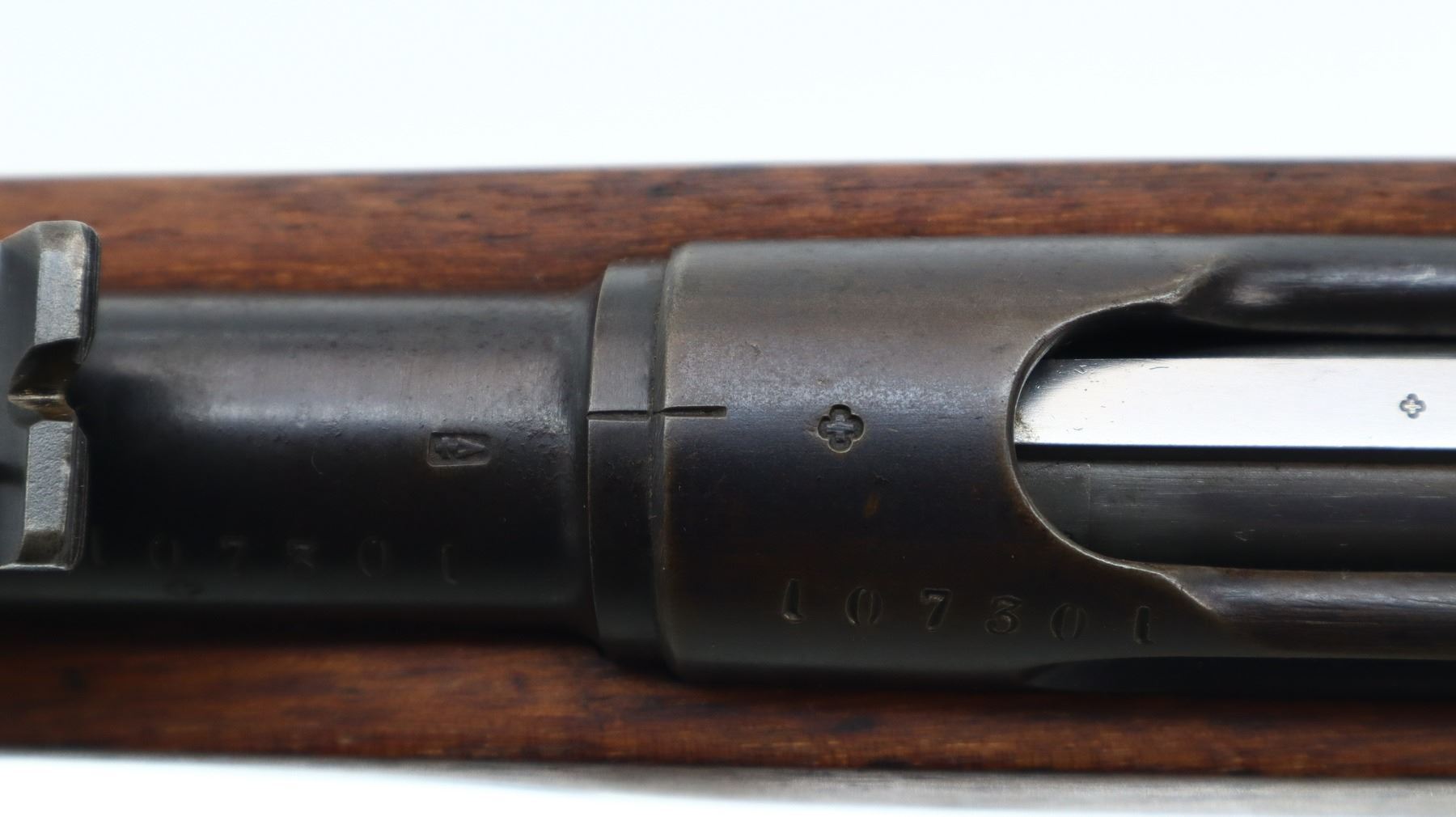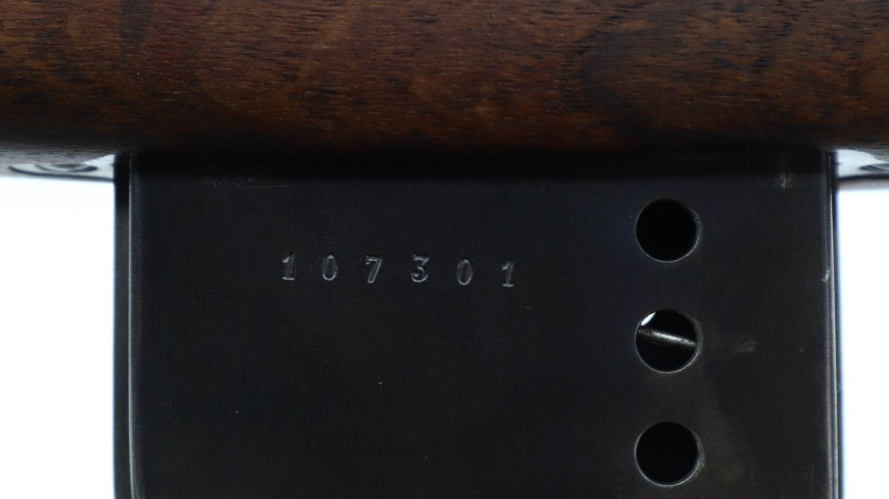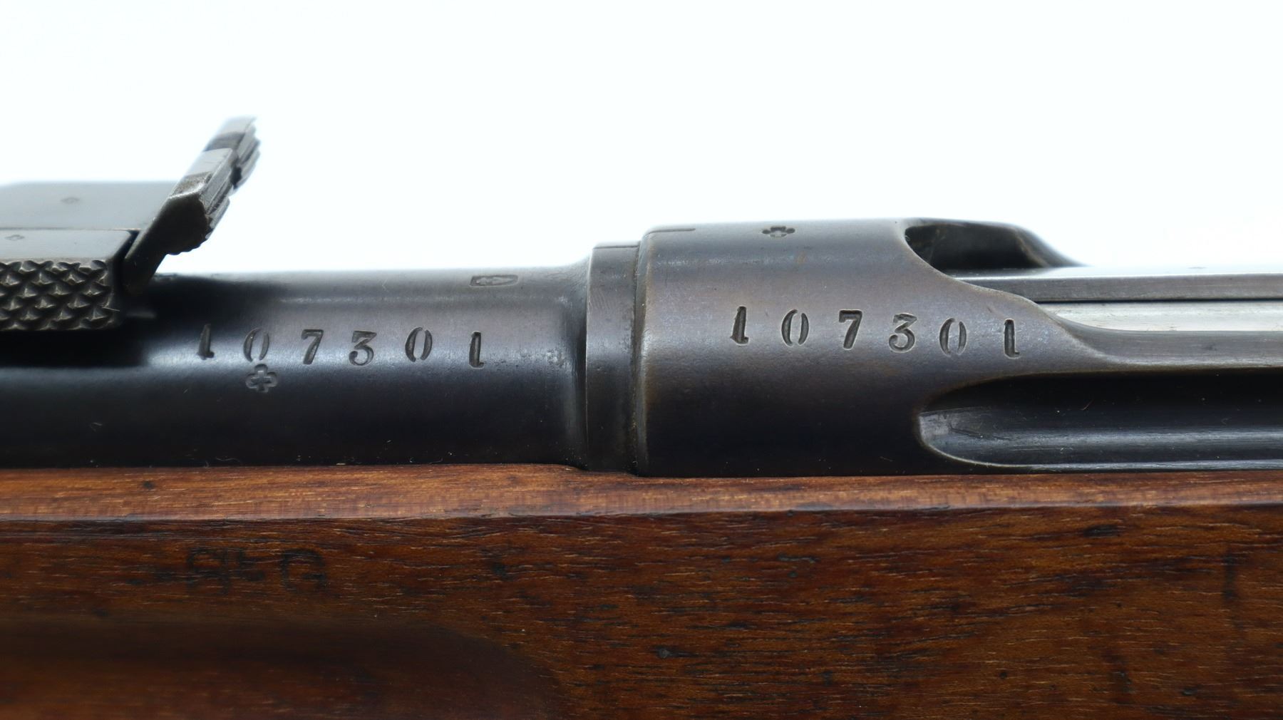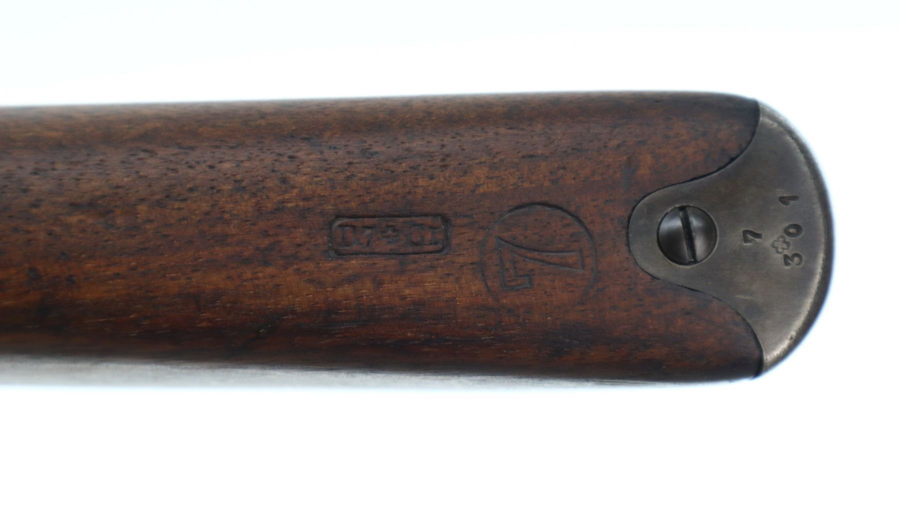 7/10, SWISS SCHMIDT RUBIN, MODEL: 1889 SPORTER, CALIBER:7.5 X 53.5, COMES WITH MAGAZINE, BORE IS GOOD, SHINY. MANUFACTURED 1892, VISIBLE NUMBERS MATCH. BARLEY CORN FRONT SIGHT WITH RAMP, ADJUSTABLE U NOTCHED REAR SIGHT, BLUED FINISH. TWO PIECE SPORTERIZED WOOD STOCK, FINGER GROOVED FOREND, STRAIGHT GRIP, SMOOTH STEEL BUTT PLATE, SLING SWIVELS. METAL FINISH SHOWS SCRATCHES, HANDLING MARKS AND WEAR. STOCKS SHOW SOME MARKS, SCRATCHES AND WEAR. , ACTION: STRAIGHT PULL RIFLE, BARREL LENGTH: 30.75", SERIAL # 107301, CONDITION: 7/10, CLASS: CANADIAN NON RESTRICTED
