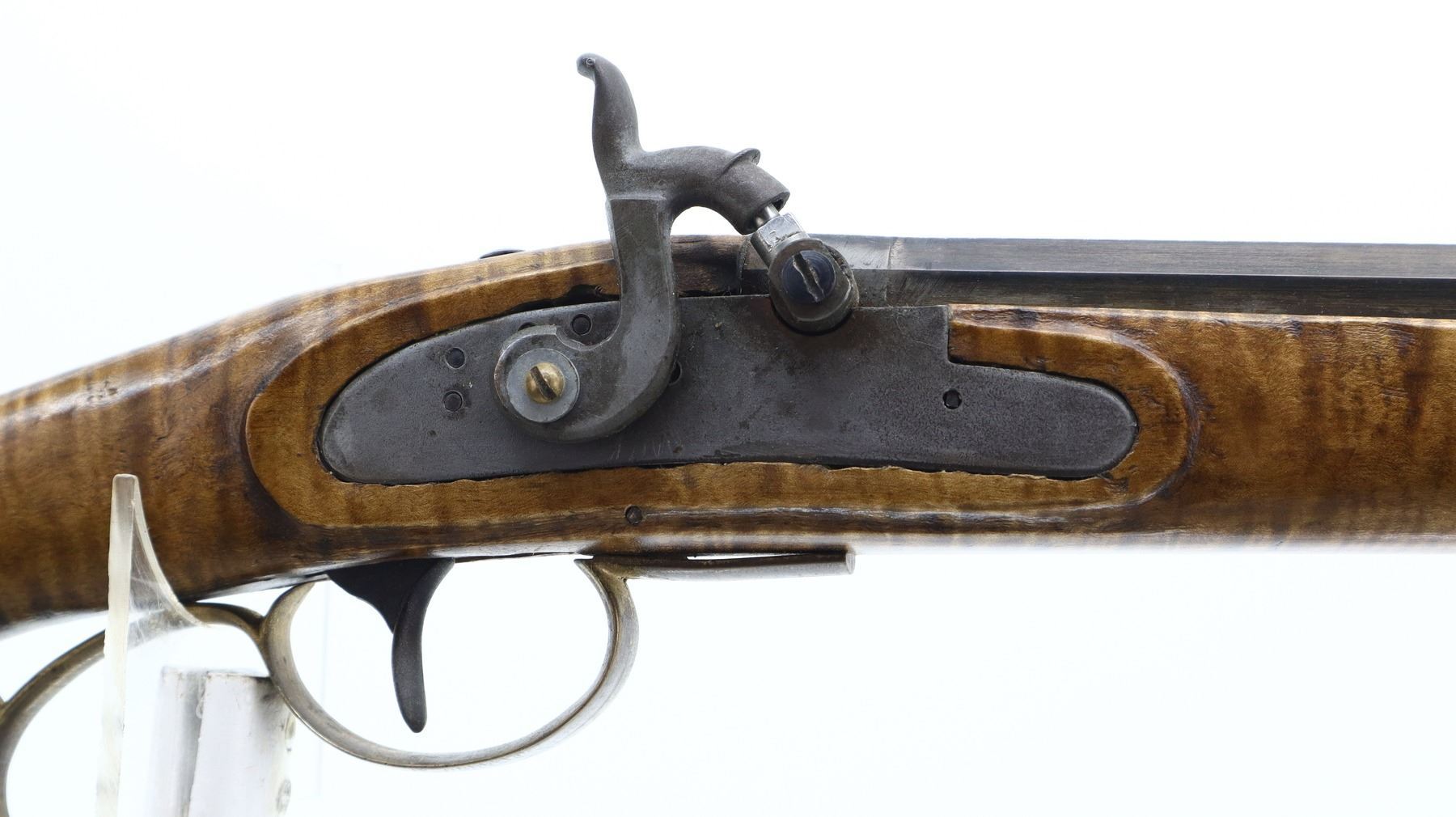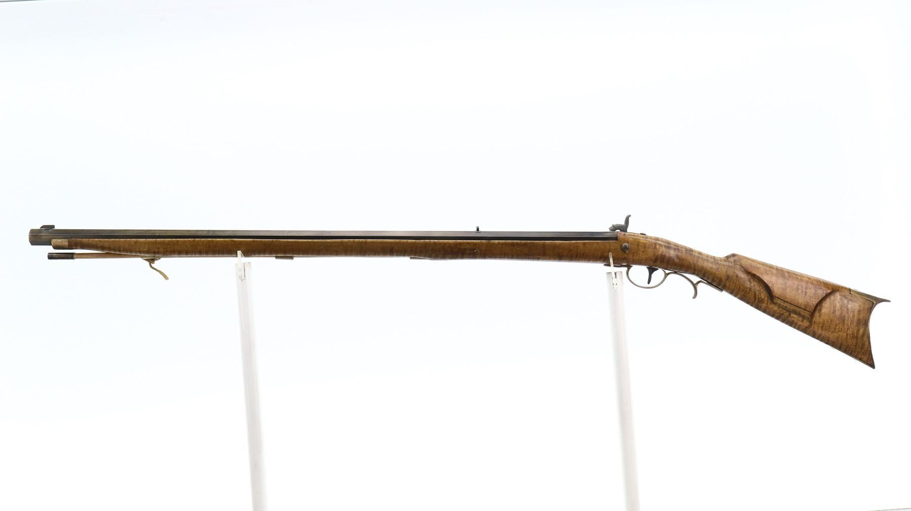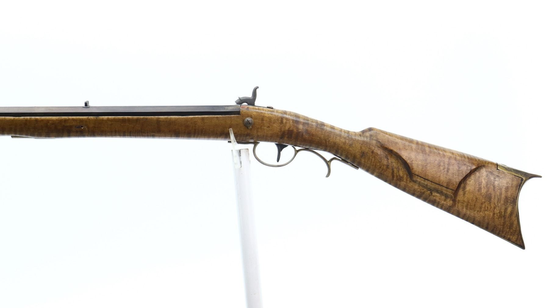 6/10, UNKNOWN , MODEL: KENTUCKY RIFLE, CALIBER:50 CAL APPROX, BORE IS FAIR, LIGHT PITTING, SOME SHINE. BLADE FRONT SIGHT, U NOTCHED REAR SIGHT, OCTAGON BARREL, UNMARKED LOCK, HAMMER SCREW REPLACED. ONE PIECE SMOOTH FULL LENGTH WOOD STOCK, STRAIGHT GRIP, CHEEK REST, SMOOTH CURVED BRASS BUTT PLATE, PATCH BOX, FINGER REST TRIGGER GUARD, NOSE CAP, WOOD RAMROD WITH BRASS TIP. METAL FINISH TURNING SILVER GREY WITH SCRATCHES, HANDLING MARKS AND WEAR. STOCK SHOWS SOME MARKS, SCRATCHES AND WEAR. , ACTION: PERCUSSION RIFLE, BARREL LENGTH: 34", SERIAL # NA, CONDITION: 6/10, CLASS: CANADIAN NON RESTRICTED