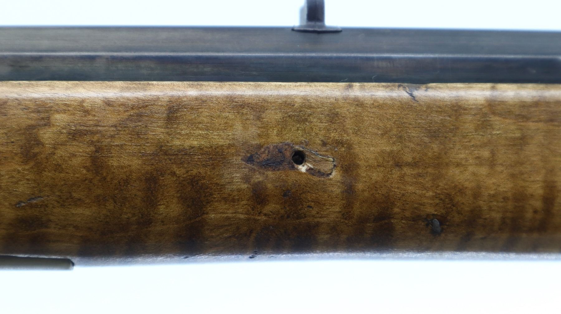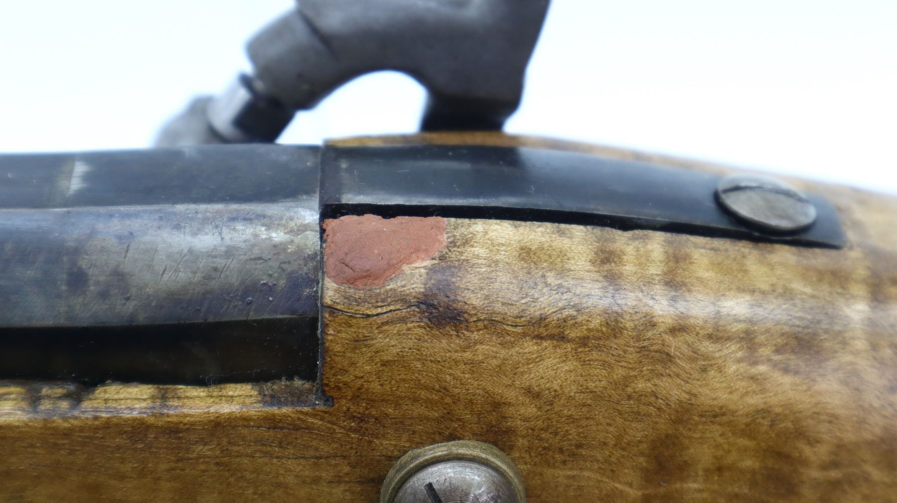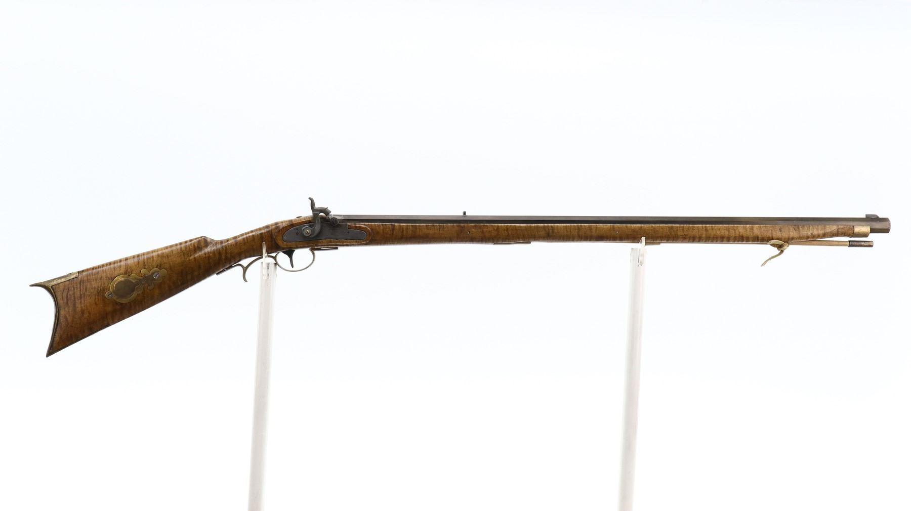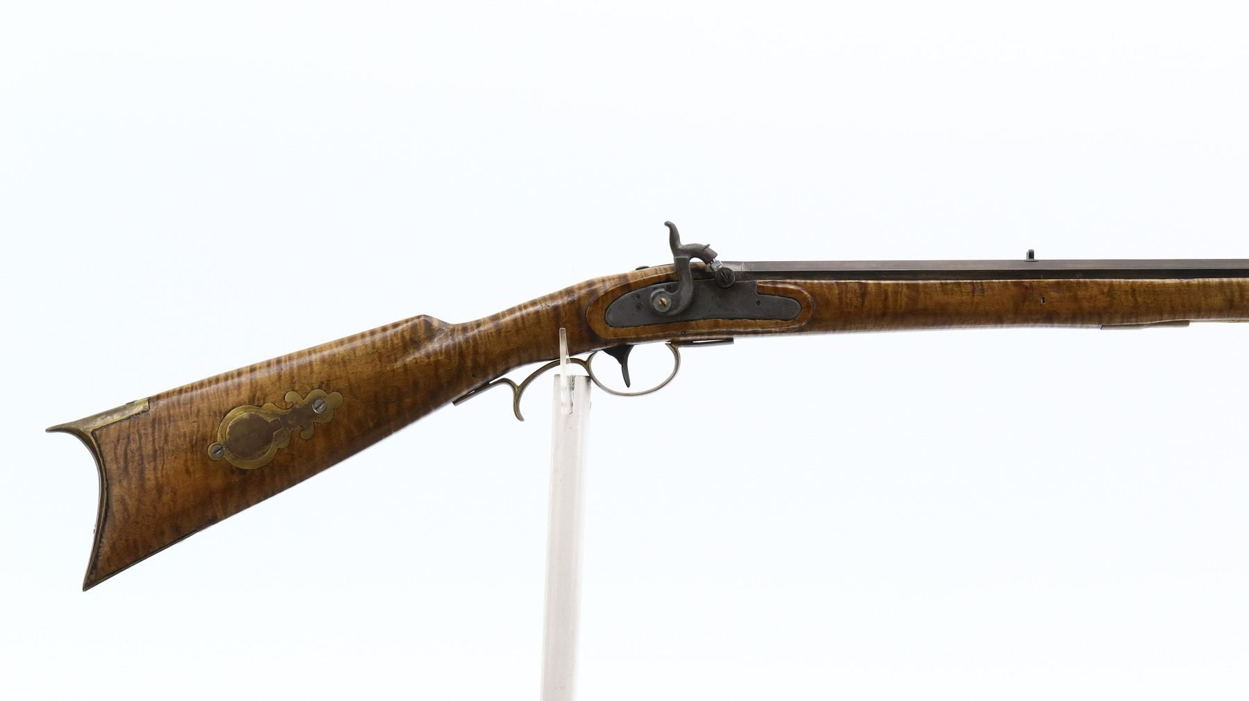 6/10, UNKNOWN , MODEL: KENTUCKY RIFLE, CALIBER:50 CAL APPROX, BORE IS FAIR, LIGHT PITTING, SOME SHINE. BLADE FRONT SIGHT, U NOTCHED REAR SIGHT, OCTAGON BARREL, UNMARKED LOCK, HAMMER SCREW REPLACED. ONE PIECE SMOOTH FULL LENGTH WOOD STOCK, STRAIGHT GRIP, CHEEK REST, SMOOTH CURVED BRASS BUTT PLATE, PATCH BOX, FINGER REST TRIGGER GUARD, NOSE CAP, WOOD RAMROD WITH BRASS TIP. METAL FINISH TURNING SILVER GREY WITH SCRATCHES, HANDLING MARKS AND WEAR. STOCK SHOWS SOME MARKS, SCRATCHES AND WEAR. , ACTION: PERCUSSION RIFLE, BARREL LENGTH: 34", SERIAL # NA, CONDITION: 6/10, CLASS: CANADIAN NON RESTRICTED
