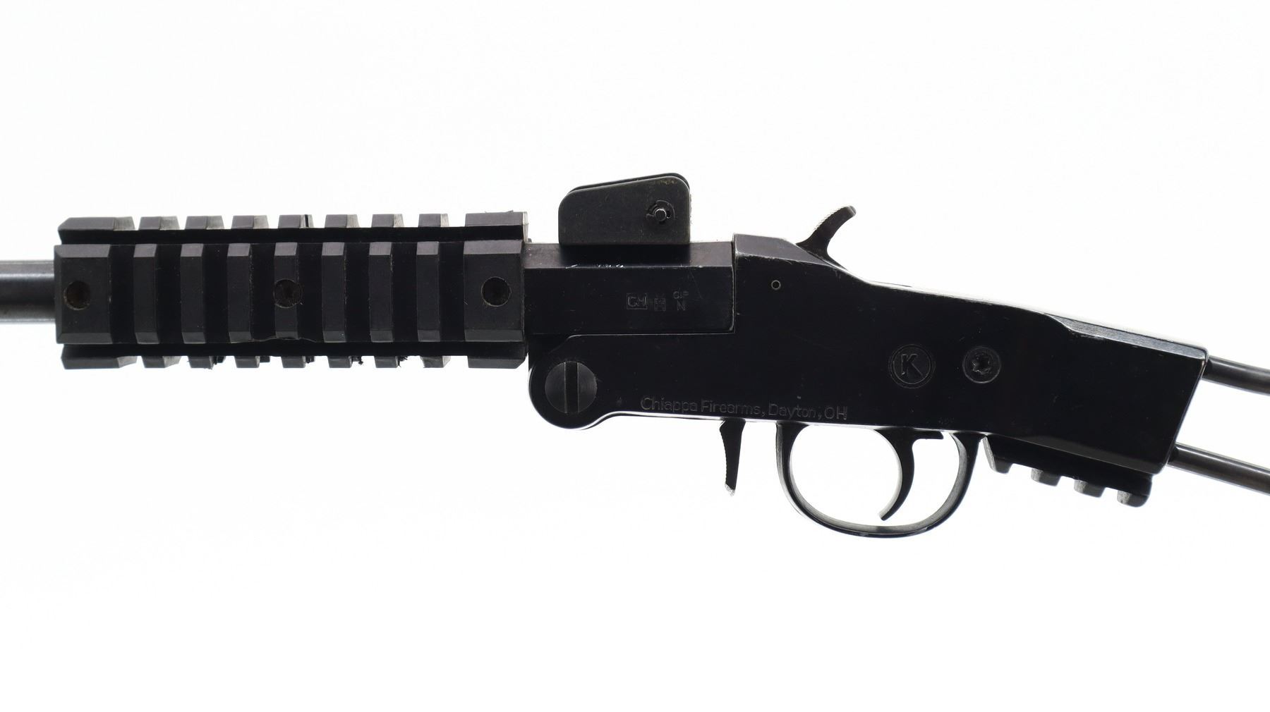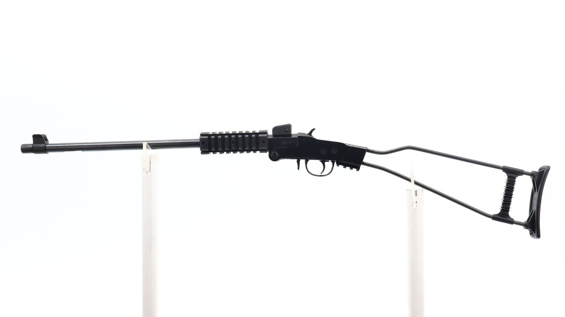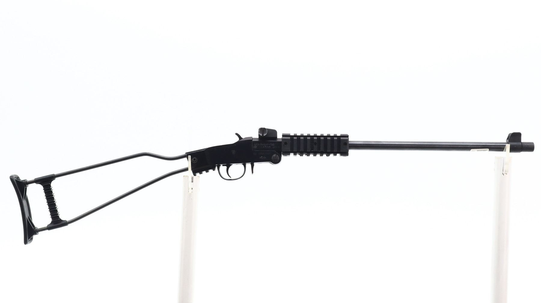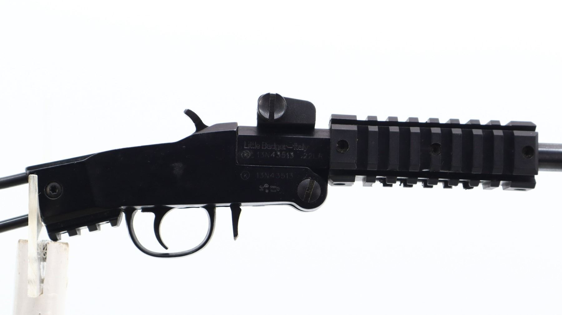 5/10, CHIAPPA, MODEL: LITTLE BADGER, CALIBER:22 LR, COMES WITH SOFT CASE, BORE IS VERY GOOD. BLADE FRONT SIGHT WITH EARS, PEEP SIGHT ABOVE CHAMBER MISSING PARTS, FOUR RAILS BOTTOM ONE HAS BEEN MODIFIED INCLUDING ROUGHED MACHINE AREA ON BOTTOM OF BARREL, GROOVED SPUR HAMMER, STRAIGHT GRIP. WIRE BUTTSTOCK WITH GROOVED BUTT PLATE, DOUBLE SHELL HOLDER. METAL FINISH SHOWS SOME SCRATCHES, HANDLING MARKS AND WEAR. , ACTION: HINGED SINGLE SHOT RIFLE, BARREL LENGTH: 16.5", SERIAL # 13N43513, CONDITION: 5/10, CLASS: CANADIAN NON RESTRICTED