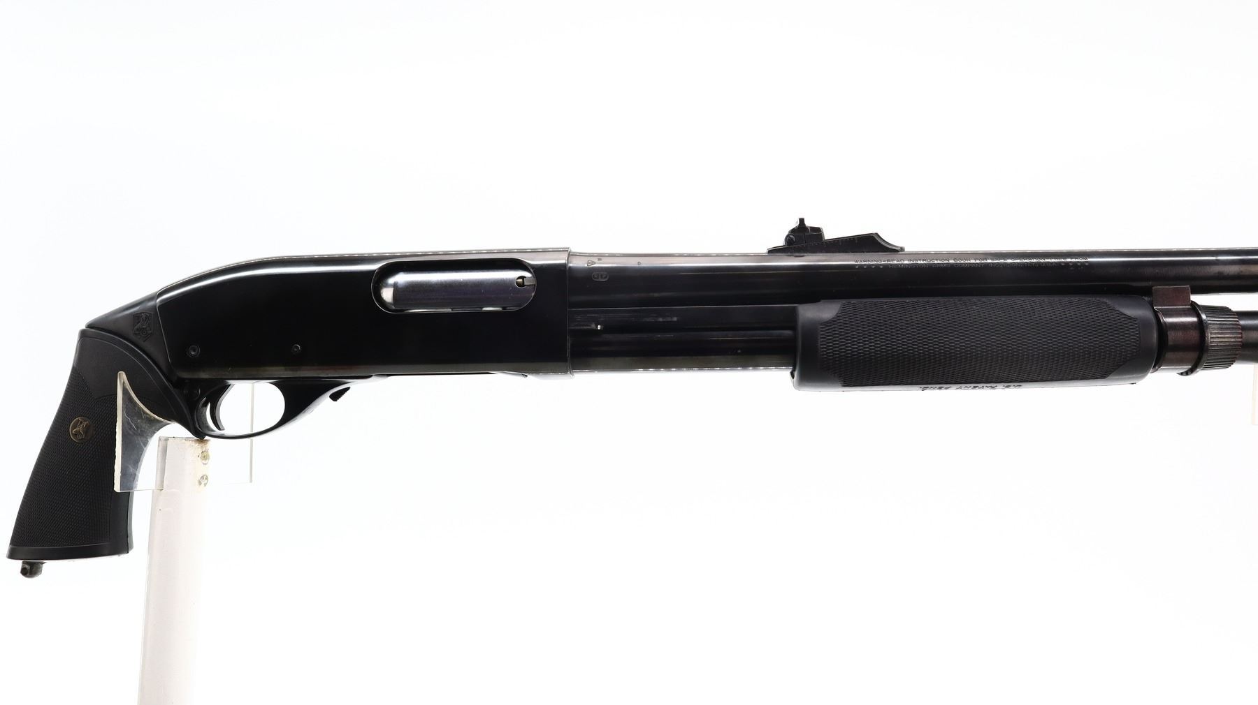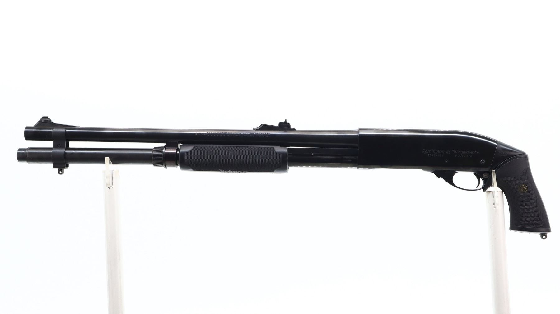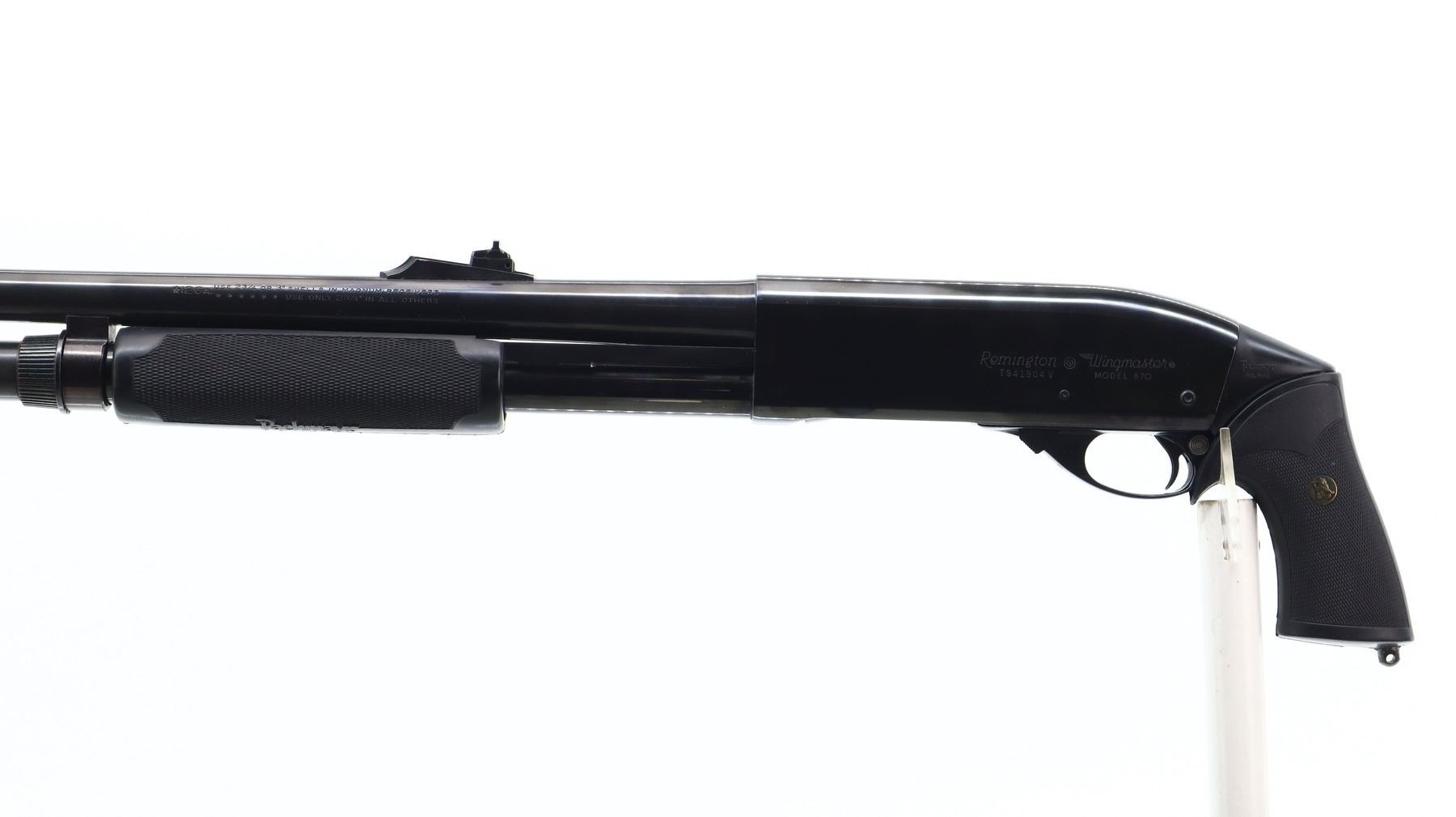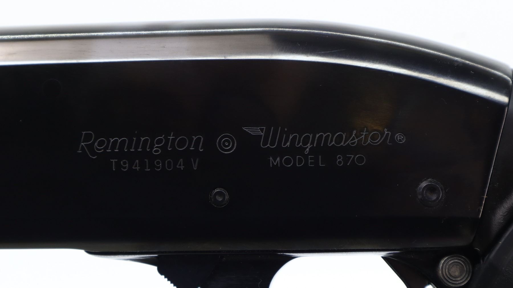 7+/10, REMINGTON, MODEL: 870 WINGMASTER, CALIBER:12 G X 2 3/4", COMES WITH HARD CASE, BORE IS EXCELLENT. FIXED IC CHOKE. BLADE FRONT SIGHT WITH RAMP, ADJUSTABLE U NOTCHED REAR SIGHT, ROUND BARREL, POLISH BLUED FINISH. TWO PIECE BLACK RUBBER PACHMAYR GRIPS, CHECKERED FORESTOCK AND PISTOL GRIP, SWIVEL STUDS, EXTENDED MAG TUBE. METAL FINISH SHOWS SOME SCRATCHES, HANDLING MARKS AND WEAR. STOCKS SHOW SOME SLIGHT MARKS AND SCRATCHES. , ACTION: PUMP ACTION SHOTGUN, BARREL LENGTH: 20", SERIAL # T941904V, CONDITION: 7+/10, CLASS: CANADIAN NON RESTRICTED