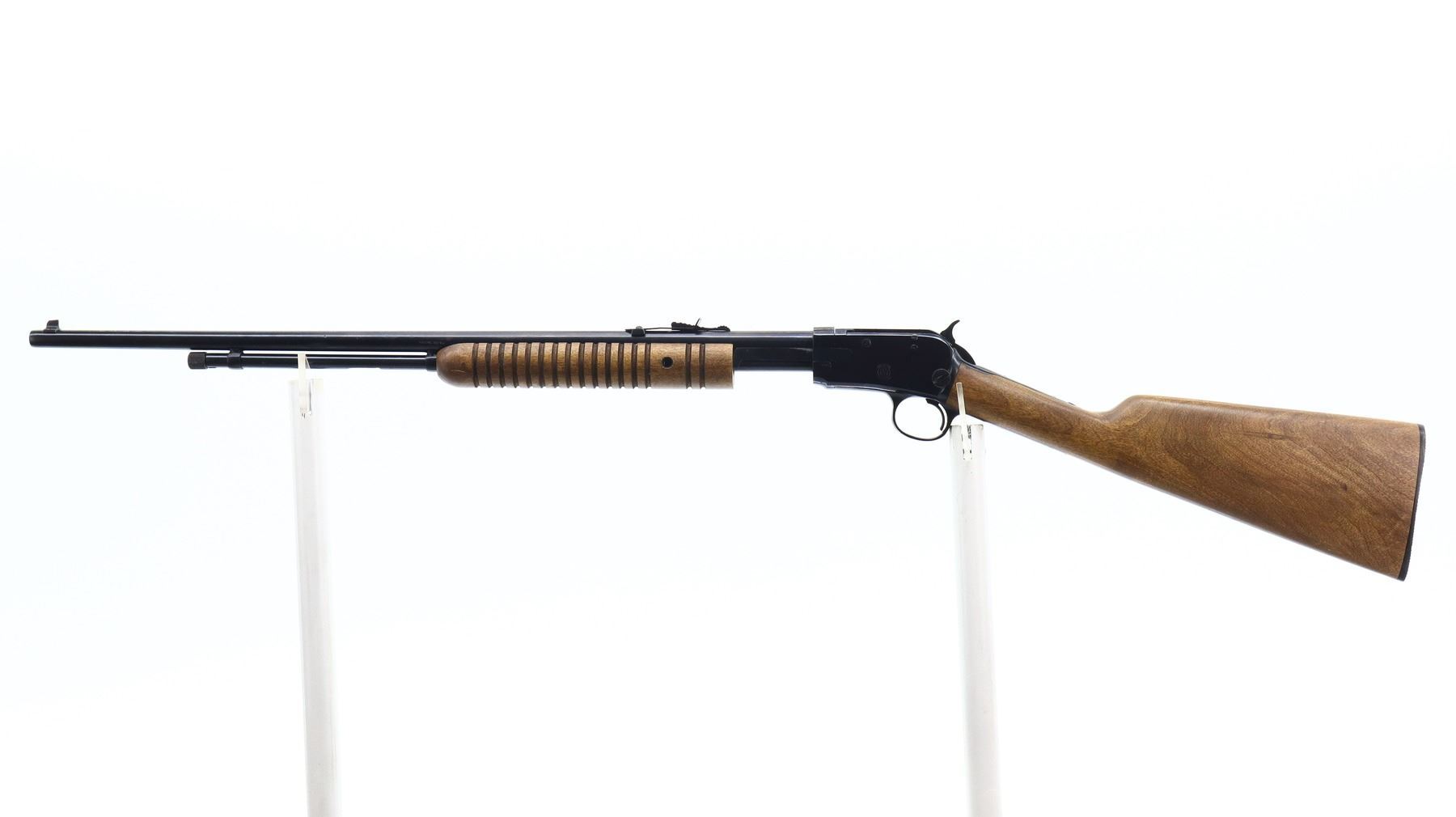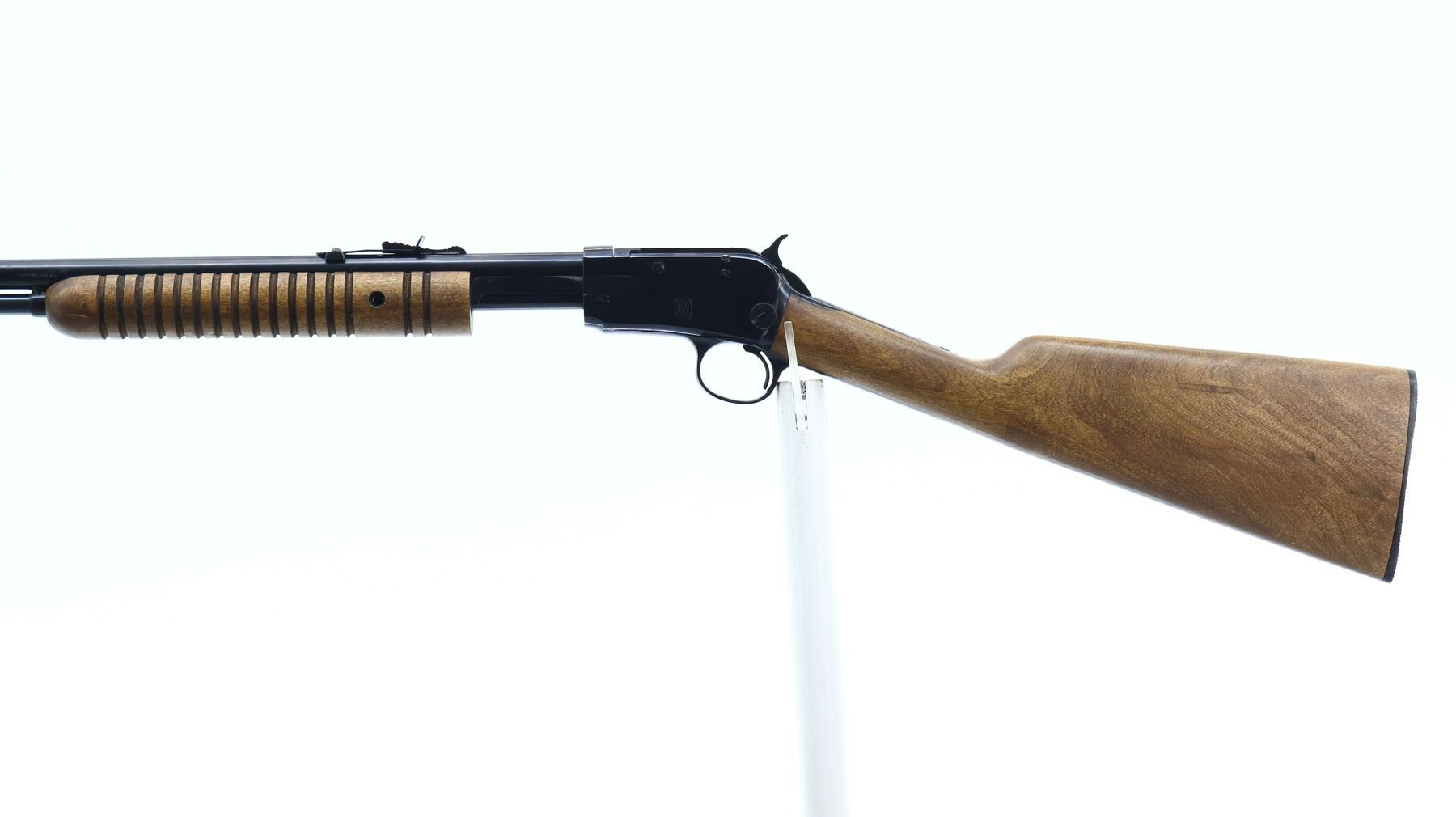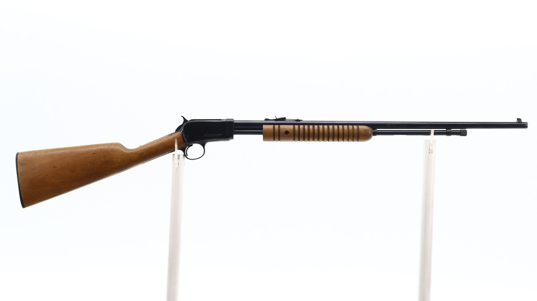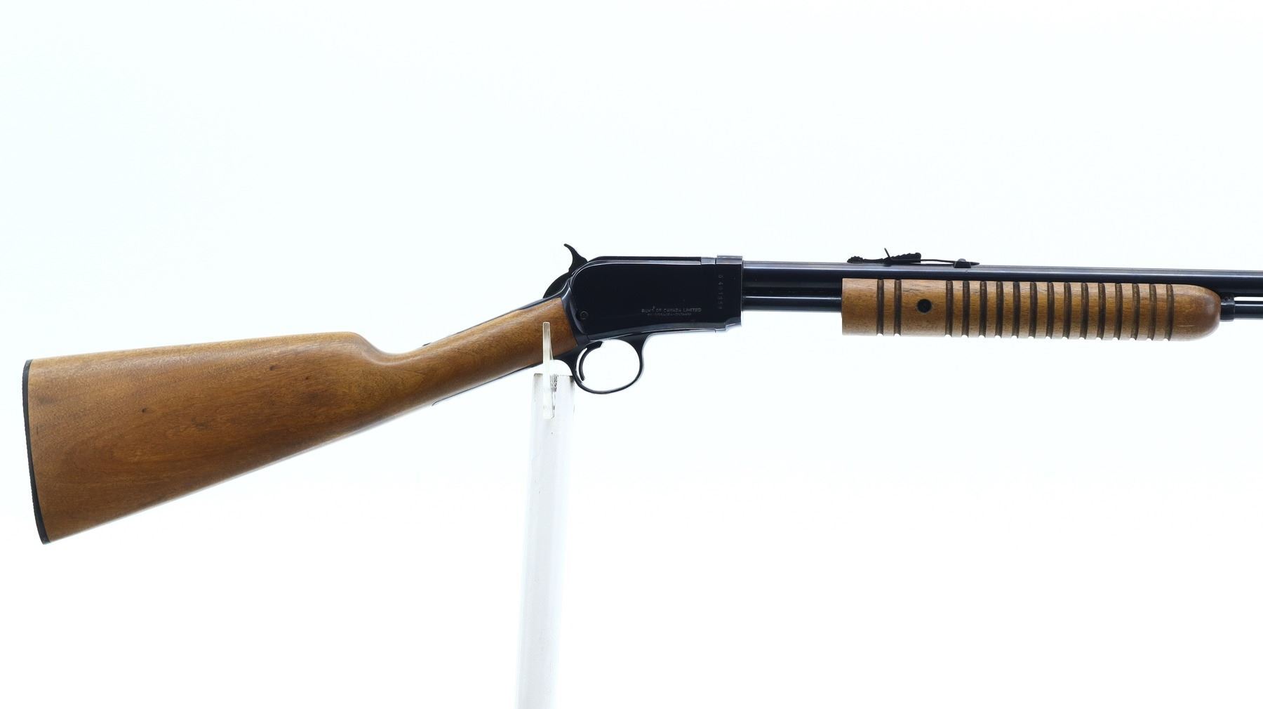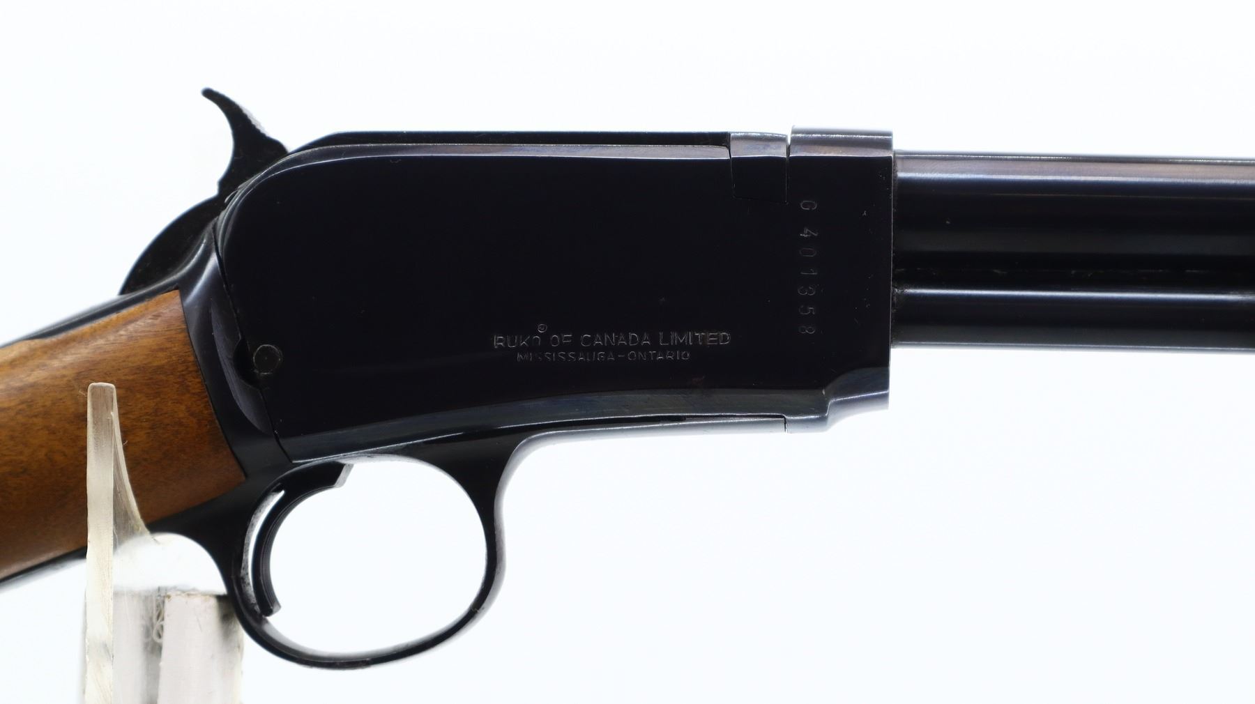 7/10, RUKO, MODEL: 62, CALIBER:22 LR, BORE IS VERY GOOD. BLADE FRONT SIGHT, ADJUSTABLE U NOTCHED REAR SIGHT, ROUND BARREL, BLUED FINISH, CHECKERED SPUR HAMMER, RECEIVER TANG DRILLED AND TAPPED FOR PEEP SIGHT. TWO PIECE WOOD STOCKS, GROOVED FOREND MISSING SCREW ON LEFT SIDE, STRAIGHT GRIP, GROOVED BLACK POLYMER BUTT PLATE, 3/4 LENGTH MAG TUBE. METAL FINISH SHOWS SOME SCRATCHES, HANDLING MARKS AND WEAR. STOCKS SHOW SOME MARKS, SCRATCHES AND WEAR. , ACTION: PUMP ACTION RIFLE, BARREL LENGTH: 23", SERIAL # G401358, CONDITION: 7/10, CLASS: CANADIAN NON RESTRICTED