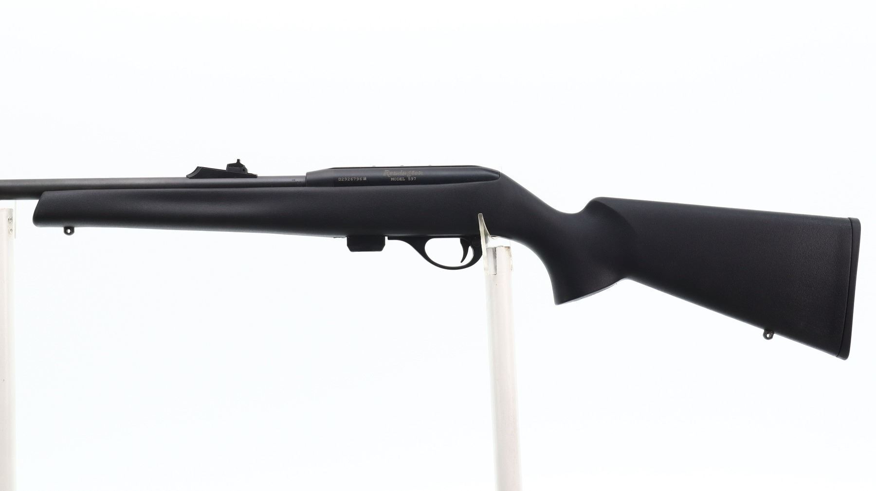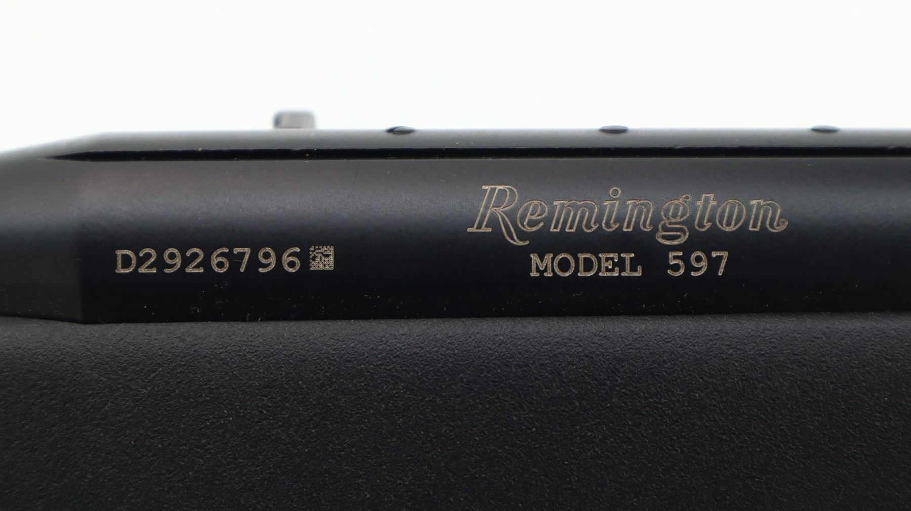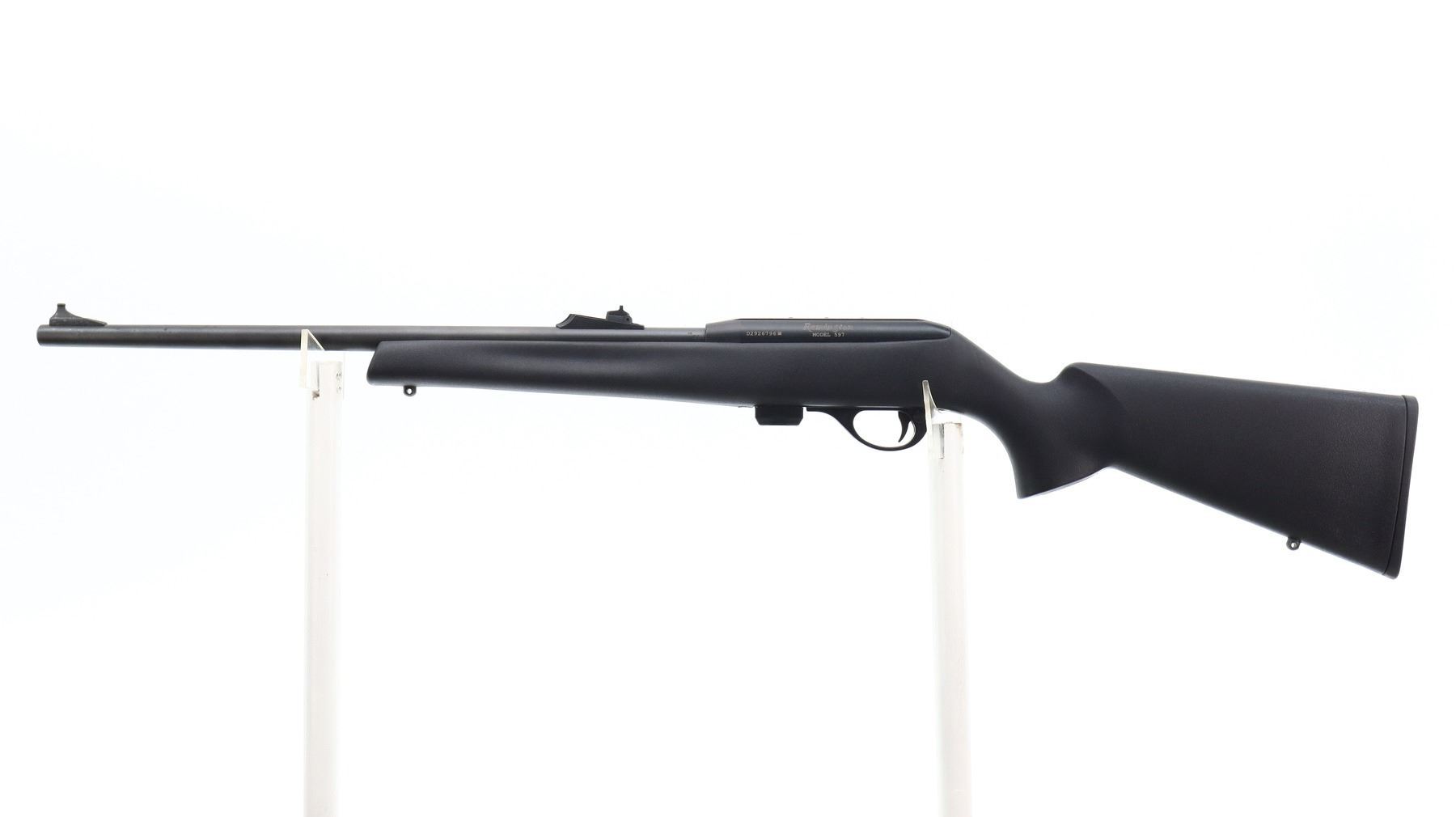 7/10, REMINGTON, MODEL: 597, CALIBER:22 LR, COMES WITH MAGAZINE, BORE IS VERY GOOD. BLADE FRONT SIGHT WITH RAMP, ADJUSTABLE U NOTCHED REAR SIGHT, BLACK MATTE FINISH, STEEL BARREL, BLACK ALLOY RECEIVER GROOVED AND DRILLED AND TAPPED FOR SCOPE MOUNT. ONE PIECE TEXTURED BLACK SYNTHETIC STOCK, FINGER GROOVED FOREND, PISTOL GRIP, CHECKERED BLACK POLYMER BUTT PLATE, SWIVEL STUDS. METAL FINISH SHOWS SOME SCRATCHES, HANDLING MARKS AND WEAR. STOCK SHOWS SOME MARKS, SCRATCHES AND WEAR. , ACTION: SEMI AUTOMATIC RIFLE, BARREL LENGTH: 20", SERIAL # D2926796, CONDITION: 7/10, CLASS: CANADIAN NON RESTRICTED