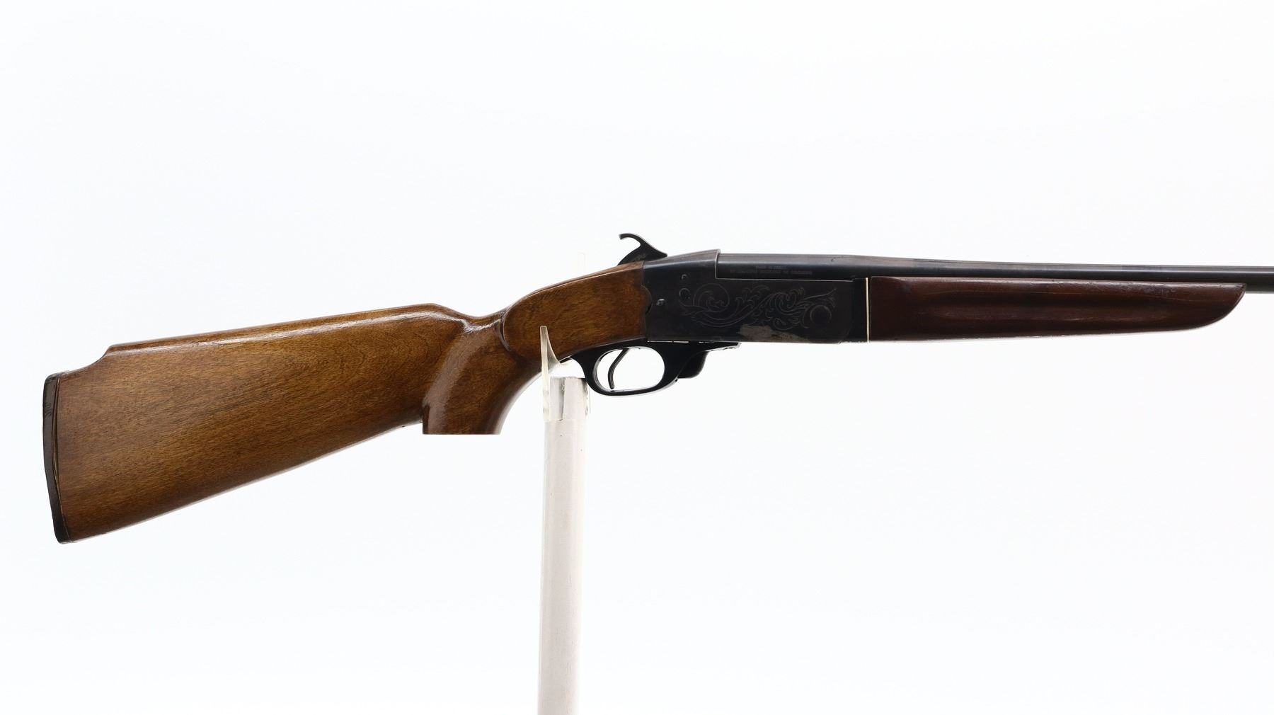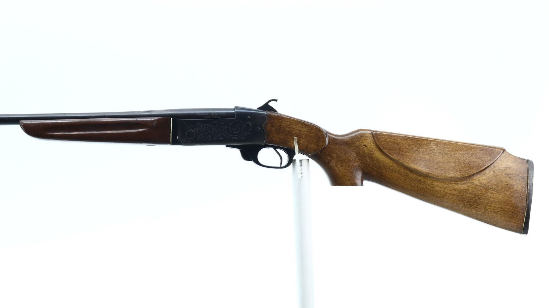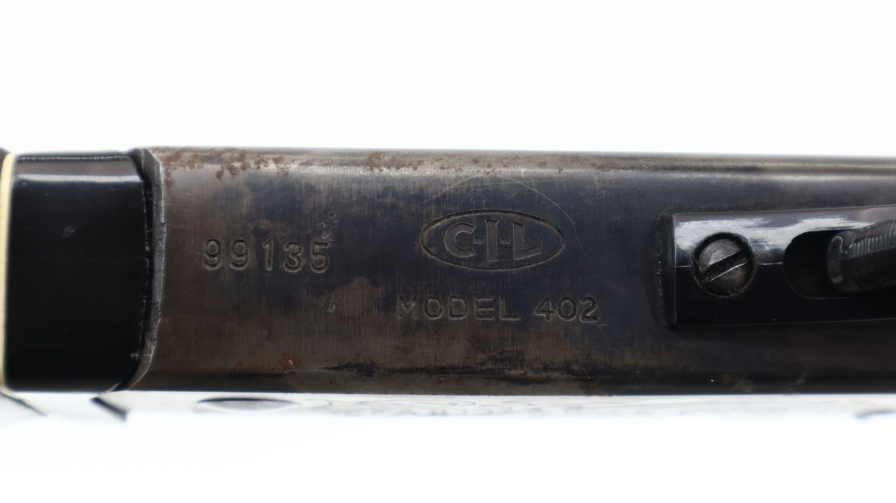 6/10, CIL, MODEL: 402, CALIBER:410 G X 3", BORE IS VERY GOOD. FIXED FULL CHOKE. BRASS BEAD, ROUND BARREL, GROOVED SPUR HAMMER, EJECTOR, ENGRAVED RECEIVER. TWO PIECE WOOD STOCKS, FINGER GROOVED FOREND, PISTOL GRIP, REPLACEMENT BUTT STOCK, CHEEK REST, GROOVED BLACK POLYMER BUTT PLATE. METAL FINISH SHOWS SOME LIGHT RUST SPECKLES, SCRATCHES, HANDLING MARKS AND WEAR. STOCKS SHOW SOME MARKS, SCRATCHES AND WEAR. , ACTION: HINGED SINGLE SHOT SHOTGUN, BARREL LENGTH: 28", SERIAL # 99135, CONDITION: 6/10, CLASS: CANADIAN NON RESTRICTED