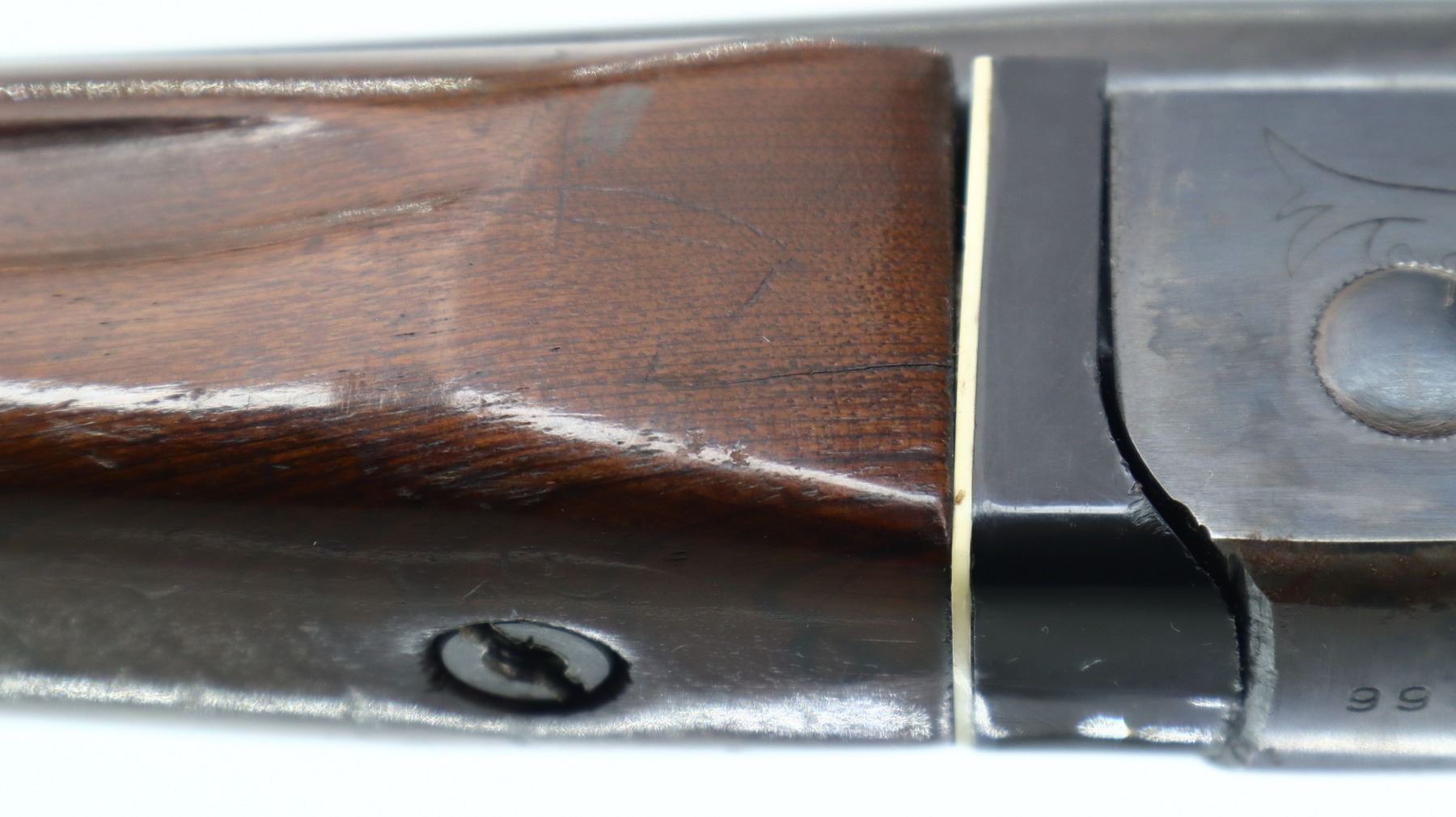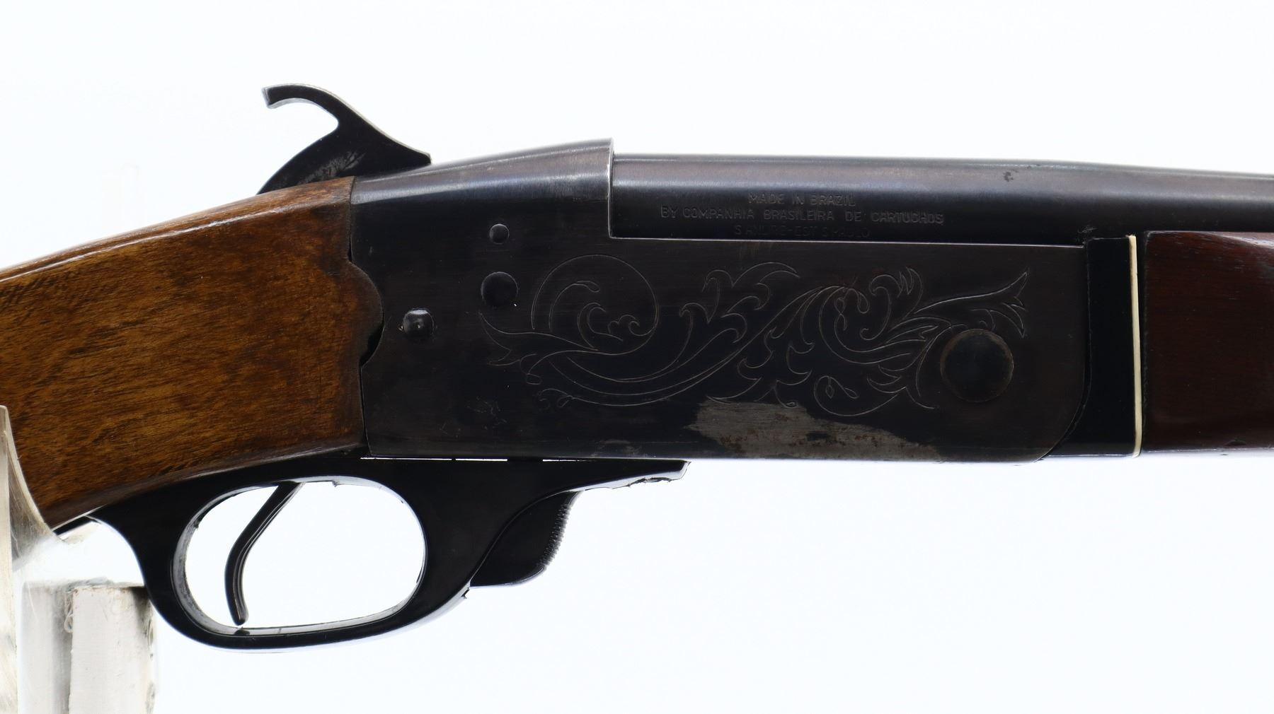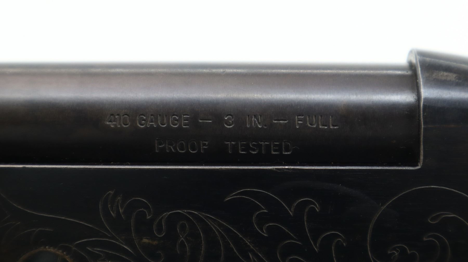 6/10, CIL, MODEL: 402, CALIBER:410 G X 3", BORE IS VERY GOOD. FIXED FULL CHOKE. BRASS BEAD, ROUND BARREL, GROOVED SPUR HAMMER, EJECTOR, ENGRAVED RECEIVER. TWO PIECE WOOD STOCKS, FINGER GROOVED FOREND, PISTOL GRIP, REPLACEMENT BUTT STOCK, CHEEK REST, GROOVED BLACK POLYMER BUTT PLATE. METAL FINISH SHOWS SOME LIGHT RUST SPECKLES, SCRATCHES, HANDLING MARKS AND WEAR. STOCKS SHOW SOME MARKS, SCRATCHES AND WEAR. , ACTION: HINGED SINGLE SHOT SHOTGUN, BARREL LENGTH: 28", SERIAL # 99135, CONDITION: 6/10, CLASS: CANADIAN NON RESTRICTED