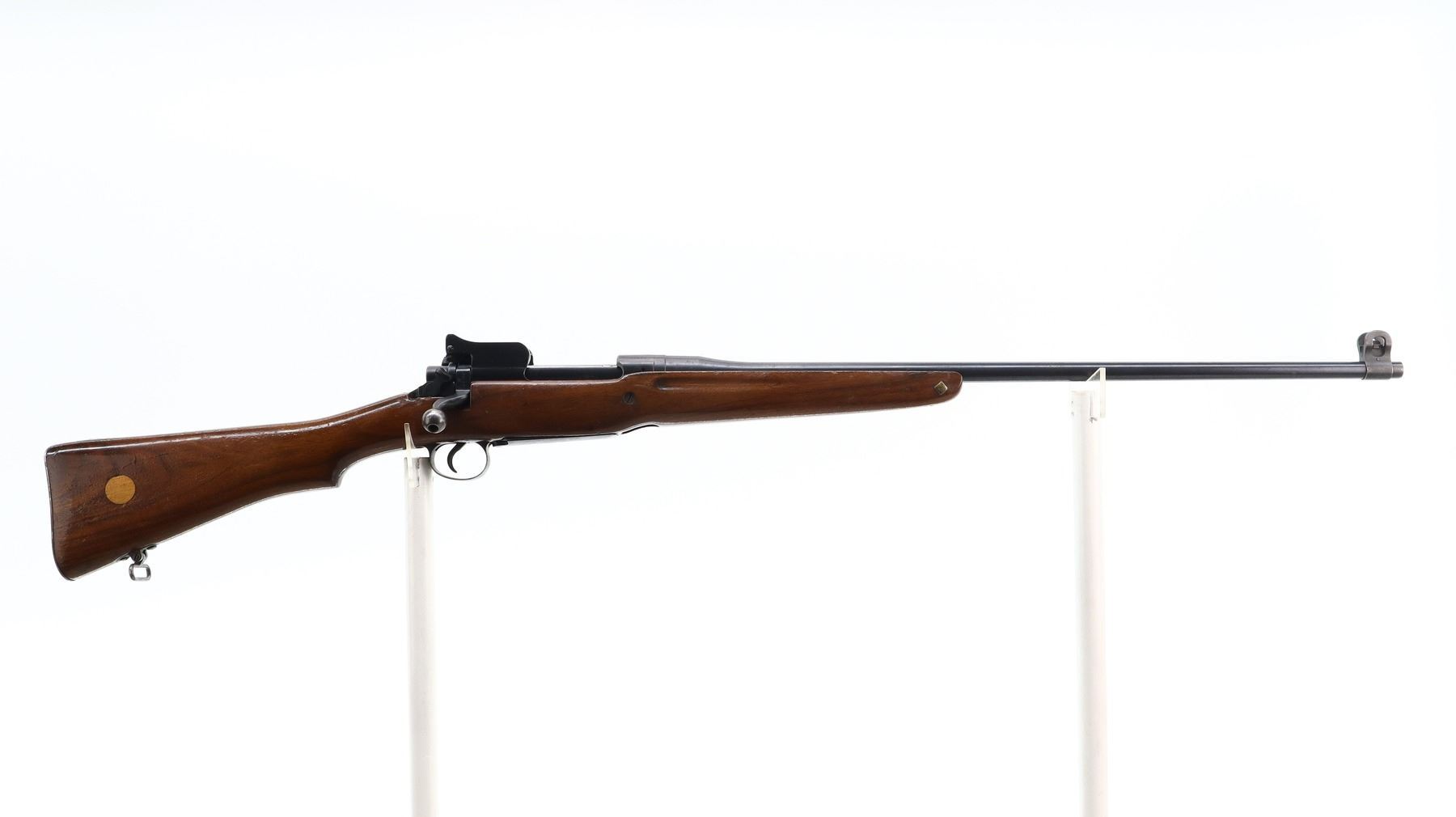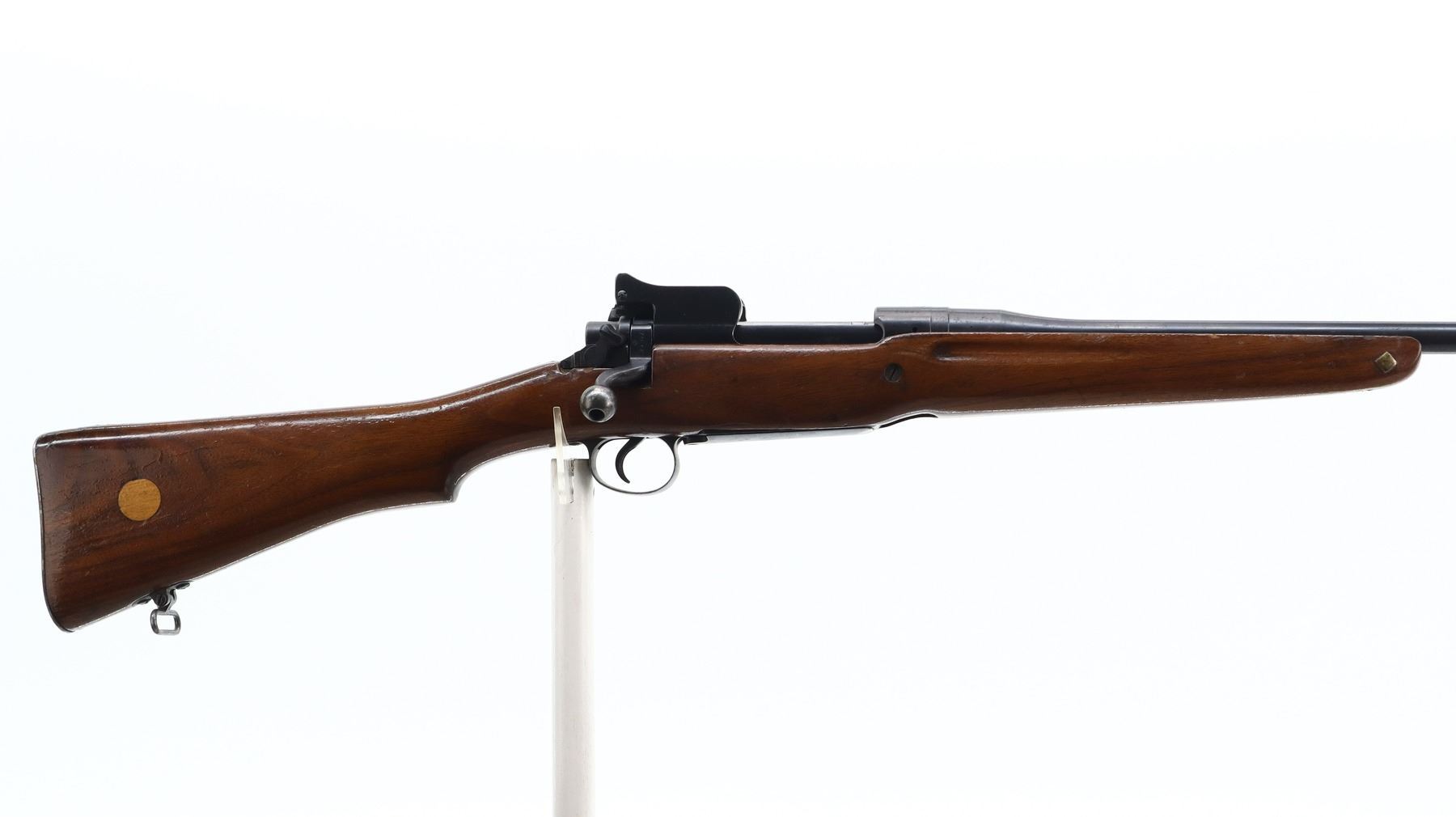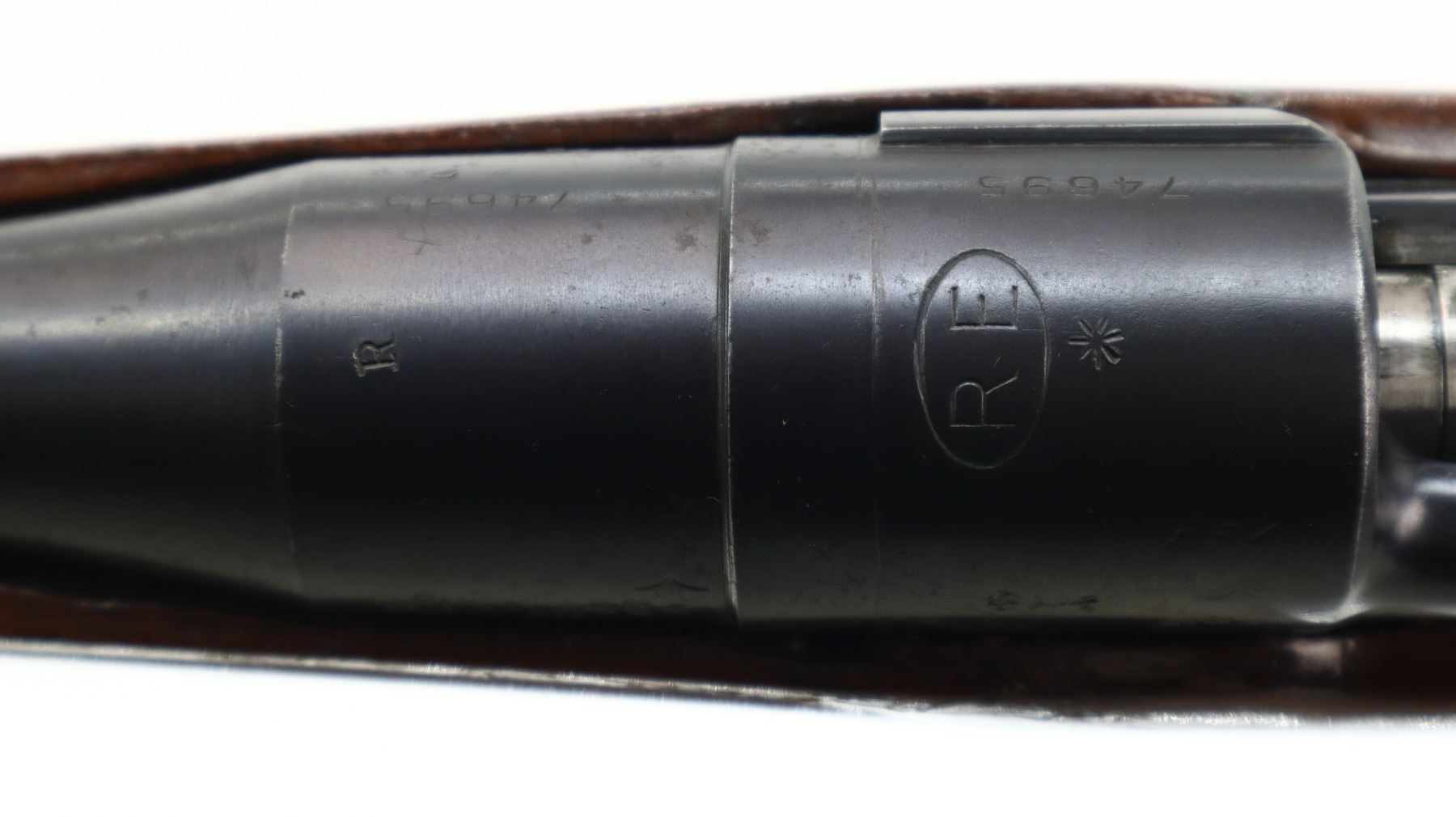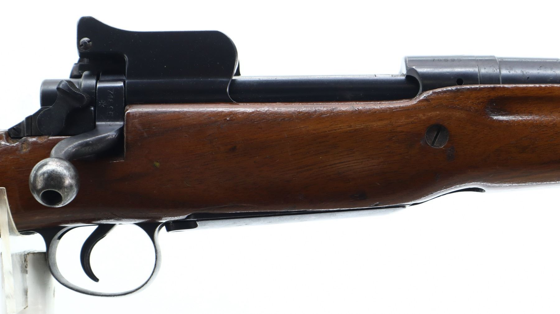 7/10, ENFIELD, MODEL: P14 SPORTER, CALIBER:303 BR, BORE IS VERY GOOD. MANUFACTURED BY REMINGTON, VISIBLE NUMBERS MATCH. BLADE FRONT SIGHT WITH EARS AND RAMP, ADJUSTABLE REAR PEEP SIGHT WITH EARS. ONE PIECE SPORTERIZED WOOD STOCK, FINGER GROOVED FOREND, PISTOL GRIP, SMOOTH STEEL BUTT PLATE WITH TRAP, STOCK DISK REPLACED, REAR SLING SWIVEL ONLY. METAL FINISH SHOWS A FEW LIGHT RUST SPECKLES, SCRATCHES, HANDLING MARKS AND WEAR. STOCK SHOWS SOME MARKS, SCRATCHES AND WEAR. , ACTION: BOLT ACTION RIFLE, BARREL LENGTH: 26", SERIAL # 74695, CONDITION: 7/10, CLASS: CANADIAN NON RESTRICTED