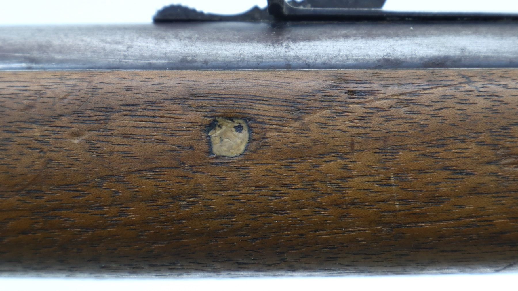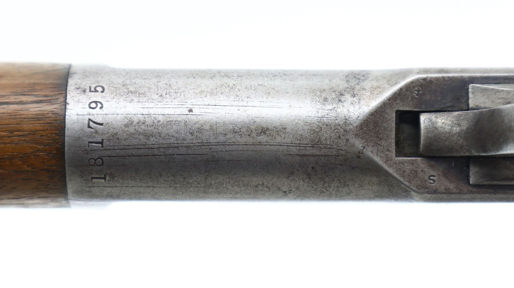 5+/10, WINCHESTER, MODEL: 1892 RIFLE, CALIBER:44-40 WCF, BORE IS GOOD, LIGHT PITTING, SOME SHINE. MANUFACTURED 1901. BLADE FRONT SIGHT, ADJUSTABLE U NOTCHED REAR SIGHT, ROUND BARREL, CHECKERED SPUR HAMMER. TWO PIECE SMOOTH WOOD STOCKS, STRAIGHT GRIP, SMOOTH CURVED STEEL BUTT PLATE, LEFT SIDE OF STOCK HAS BUNDESREPUBLIK DEUTSCHLAND 1981 COIN INSET INTO IT, FULL LENGTH MAG TUBE. METAL FINISH SILVER GREY WITH LIGHT PITTING, SCRATCHES, HANDLING MARKS AND WEAR. STOCKS SHOW MARKS, SCRATCHES AND WEAR. , ACTION: LEVER ACTION RIFLE, BARREL LENGTH: 24", SERIAL # 181795, CONDITION: 5+/10, CLASS: CANADIAN NON RESTRICTED