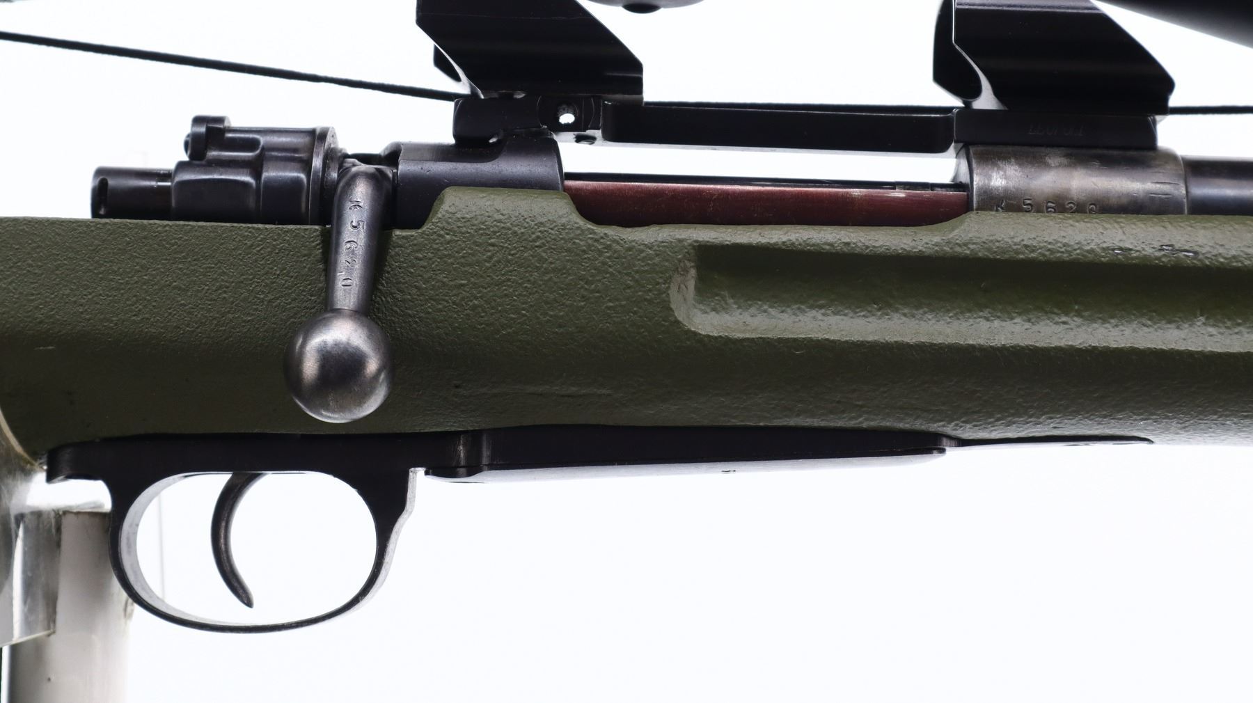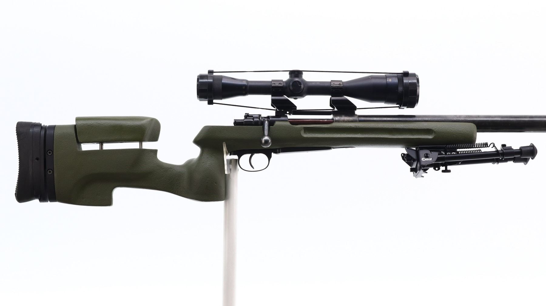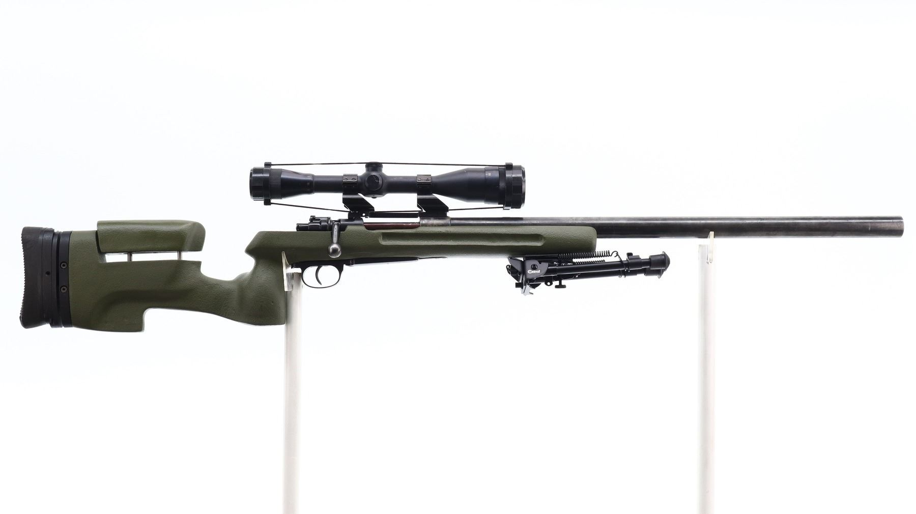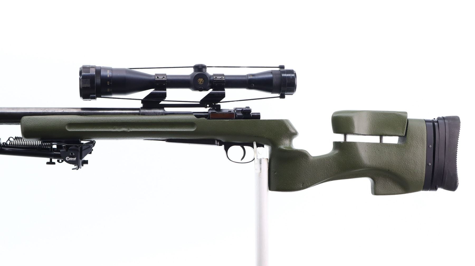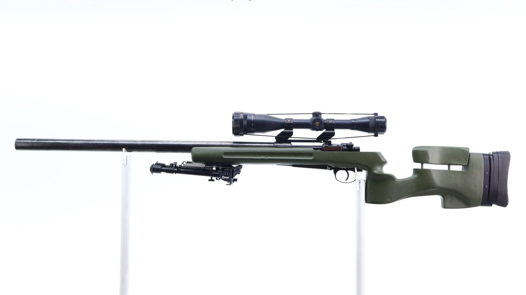 7/10, CUSTOM MAUSER, MODEL: 98 TARGET, CALIBER:308 WIN, BORE IS EXCELLENT. MANUFACTURED IN YUGOSLAVIA, BOLT MATCHES. RIFLE IS A CUSTOM TARGET WITH NOT COMPLETELY FITTED STOCK. HEAVY 1.25" TARGET BARREL WITH RECESSED CROWN AND NO SIGHTS. RECEIVER DRILLED AND TAPPED WITH CABELA'S 4.5 - 14 X 42 AO SCOPE, CLEAR OPTICS WITH RANGE FINDING FINE RETICLE, TURNED DOWN BOLT HANDLE. ONE PIECE GREEN FIBERGLASS STOCK, FINGER GROOVED FOREND, THUMB REST PISTOL GRIP, ADJUSTABLE CHEEK REST, FULLY ADJUSTABLE GROOVED BLACK RUBBER RECOIL PAD, ATTACHED ADJUSTABLE FOLDING CALDWELL BIPOD. METAL FINISH SILVER GREY WITH SCRATCHES, HANDLING MARKS AND WEAR. STOCK SHOWS SOME MARKS, SCRATCHES AND WEAR. , ACTION: BOLT ACTION RIFLE, BARREL LENGTH: 26", SERIAL # K5620, CONDITION: 7/10, CLASS: CANADIAN NON RESTRICTED