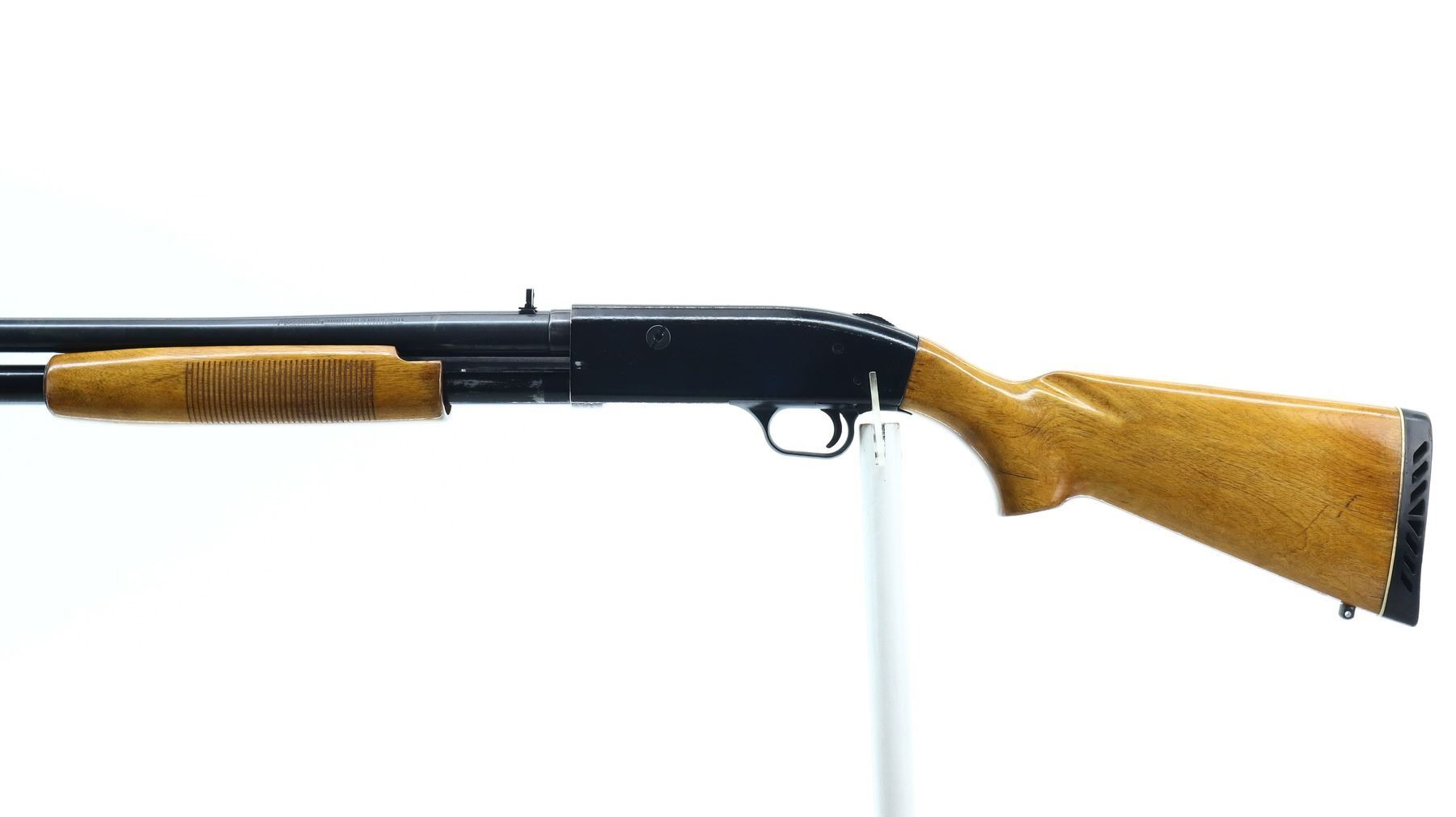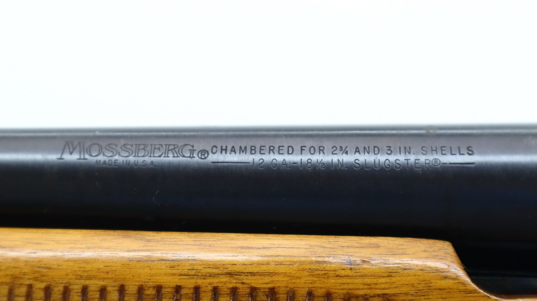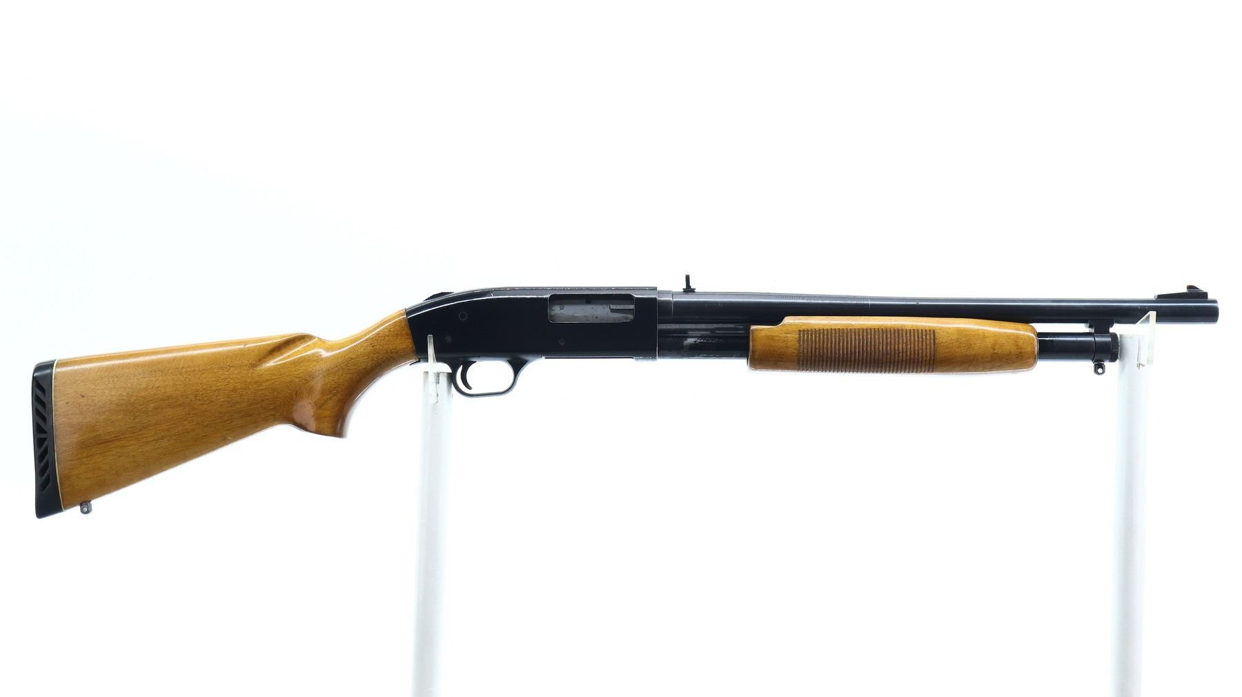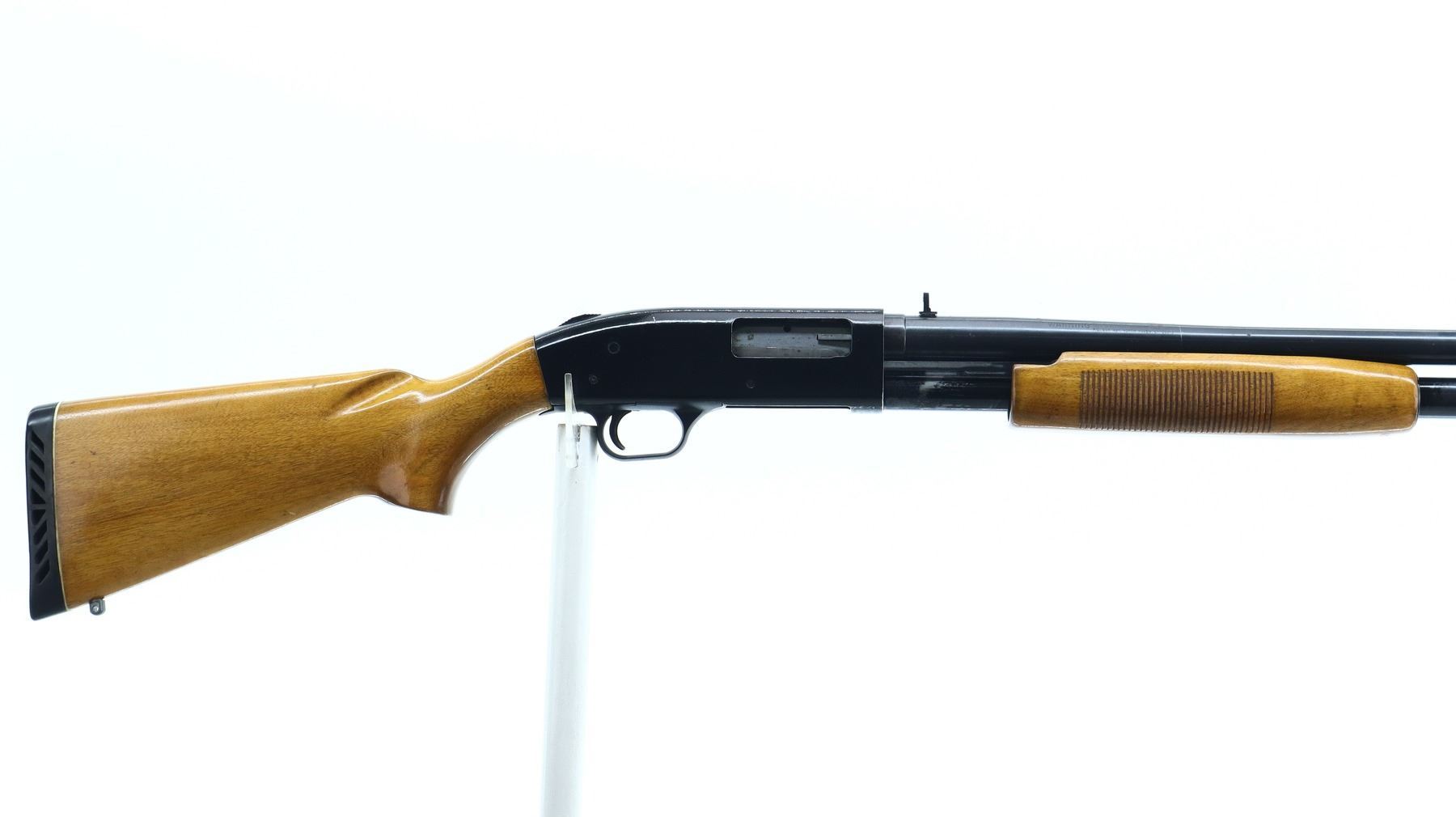 6+/10, MOSSBERG, MODEL: 400G, CALIBER:12 G X 3", BORE IS GOOD, SHINY . FIXED CYLINDER CHOKE. BLADE FRONT SIGHT WITH RAMP, ADJUSTABLE FOLDING U NOTCHED REAR SIGHT, SMOOTH BORE ROUND BARREL, BLACK PAINTED ALLOY RECEIVER, TANG SAFETY, EJECTOR SCREW HAS BEEN MODIFIED. TWO PIECE WOOD STOCKS, GROOVED FOREND, PISTOL GRIP, BLACK VENTED RUBBER RECOIL PAD, SWIVEL STUDS. METAL FINISH SHOWS SOME SCRATCHES, HANDLING MARKS AND WEAR. STOCKS SHOW SOME MARKS, SCRATCHES AND WEAR. , ACTION: PUMP ACTION SHOTGUN, BARREL LENGTH: 18.5", SERIAL # G672483, CONDITION: 6+/10, CLASS: CANADIAN NON RESTRICTED