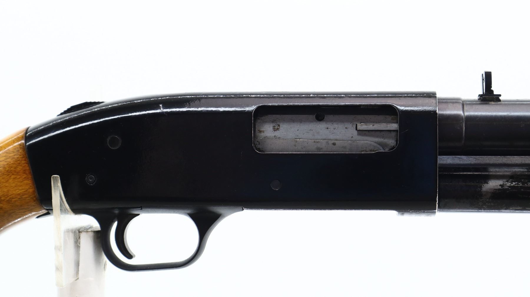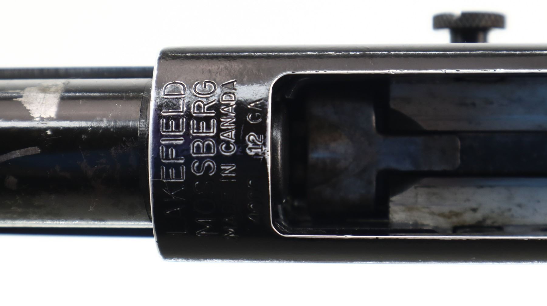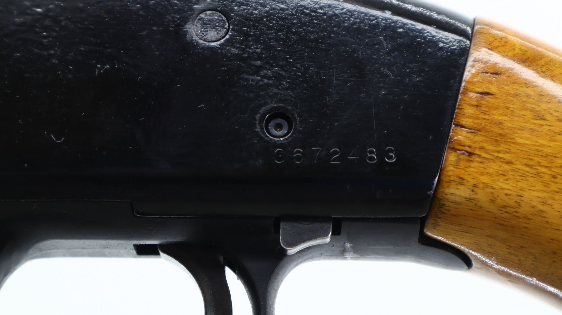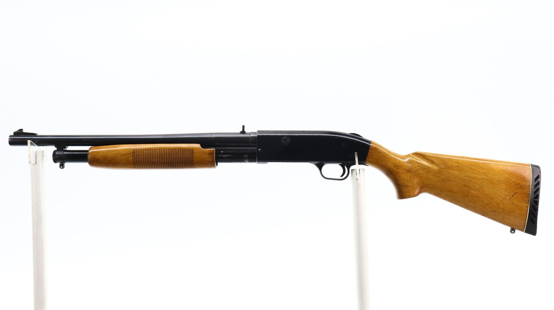 6+/10, MOSSBERG, MODEL: 400G, CALIBER:12 G X 3", BORE IS GOOD, SHINY . FIXED CYLINDER CHOKE. BLADE FRONT SIGHT WITH RAMP, ADJUSTABLE FOLDING U NOTCHED REAR SIGHT, SMOOTH BORE ROUND BARREL, BLACK PAINTED ALLOY RECEIVER, TANG SAFETY, EJECTOR SCREW HAS BEEN MODIFIED. TWO PIECE WOOD STOCKS, GROOVED FOREND, PISTOL GRIP, BLACK VENTED RUBBER RECOIL PAD, SWIVEL STUDS. METAL FINISH SHOWS SOME SCRATCHES, HANDLING MARKS AND WEAR. STOCKS SHOW SOME MARKS, SCRATCHES AND WEAR. , ACTION: PUMP ACTION SHOTGUN, BARREL LENGTH: 18.5", SERIAL # G672483, CONDITION: 6+/10, CLASS: CANADIAN NON RESTRICTED