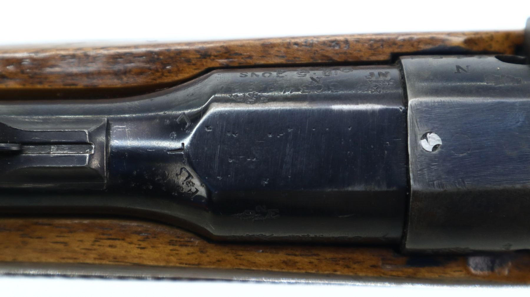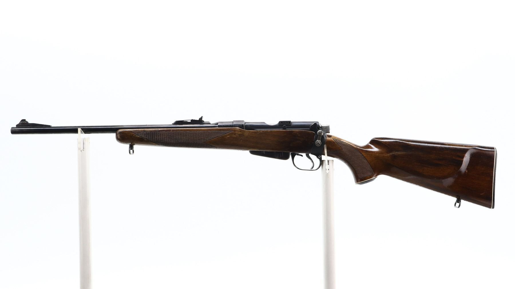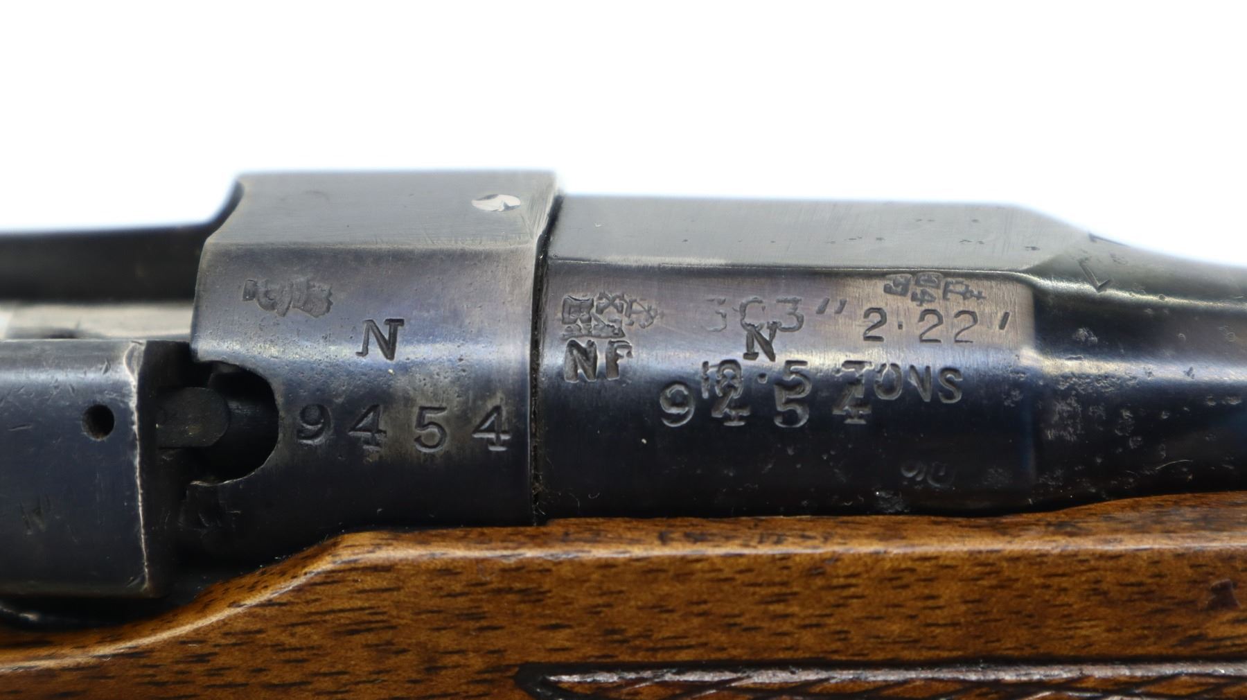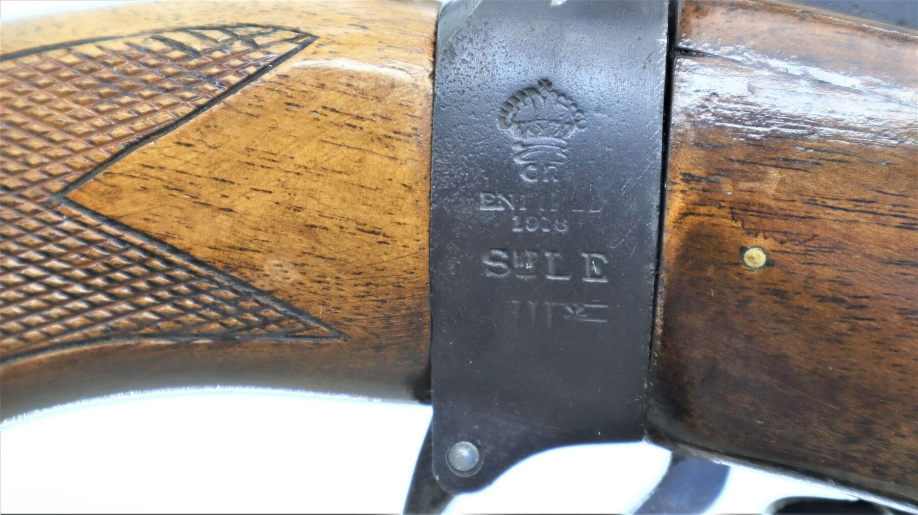 6+/10, LEE ENFIELD, MODEL: NO1 MKIII SPORTER, CALIBER:303 BR, COMES WITH MAGAZINE, BORE IS GOOD. MANUFACTURED ENFIELD 1918, BOLT UNNUMBERED. BLADE FRONT SIGHT WITH RAMP, ADJUSTABLE U NOTCHED REAR SIGHT, RECEIVER BRIDGE REMOVED, SILVER BOLT WITH MODIFIED HANDLE AND COCKING PIECE. TWO PIECE WOOD MONTE CARLO STOCKS, CHECKERED FOREARM AND PISTOL GRIP, CHEEK REST, CHECKERED BLACK POLYMER BUTT PLATE, GRIP CAP, SLING SWIVELS. METAL FINISH SHOWS SOME SCRATCHES, HANDLING MARKS AND WEAR. STOCKS SHOW SOME MARKS, SCRATCHES AND WEAR. , ACTION: BOLT ACTION RIFLE, BARREL LENGTH: 18", SERIAL # N9454, CONDITION: 6+/10, CLASS: CANADIAN NON RESTRICTED