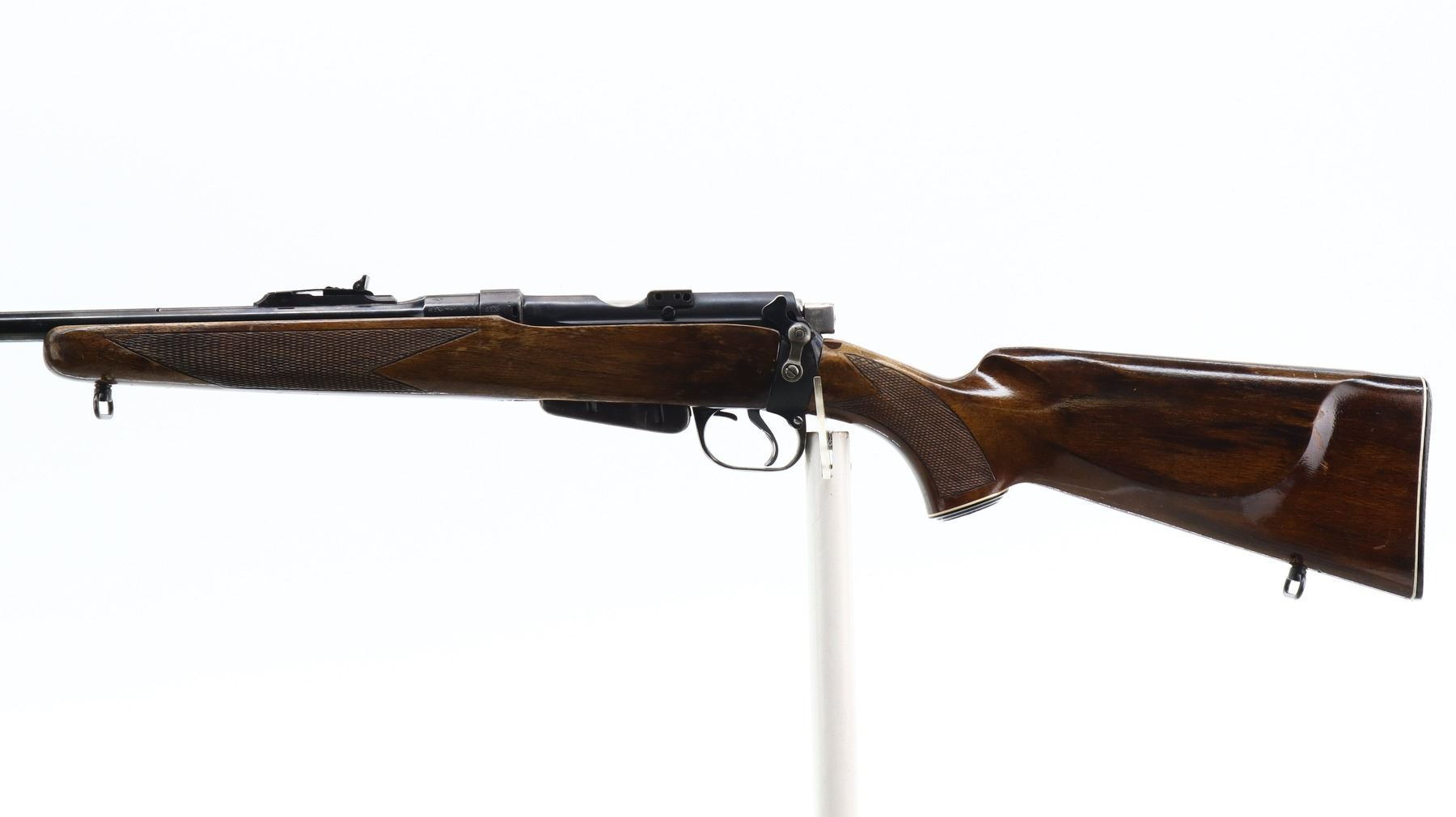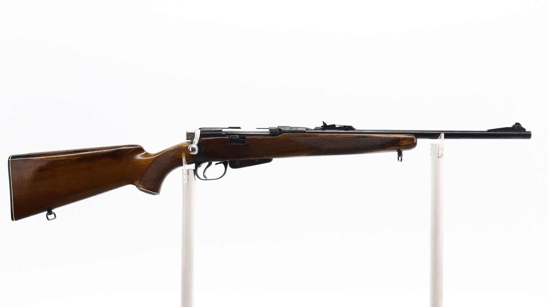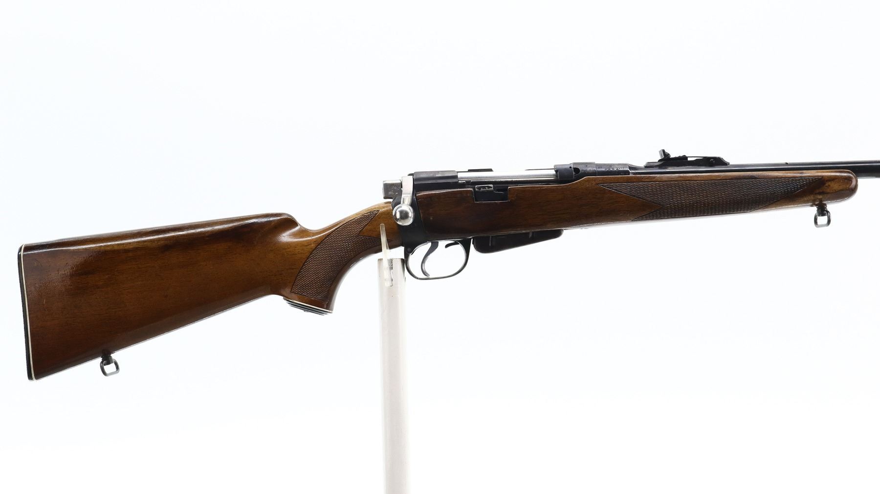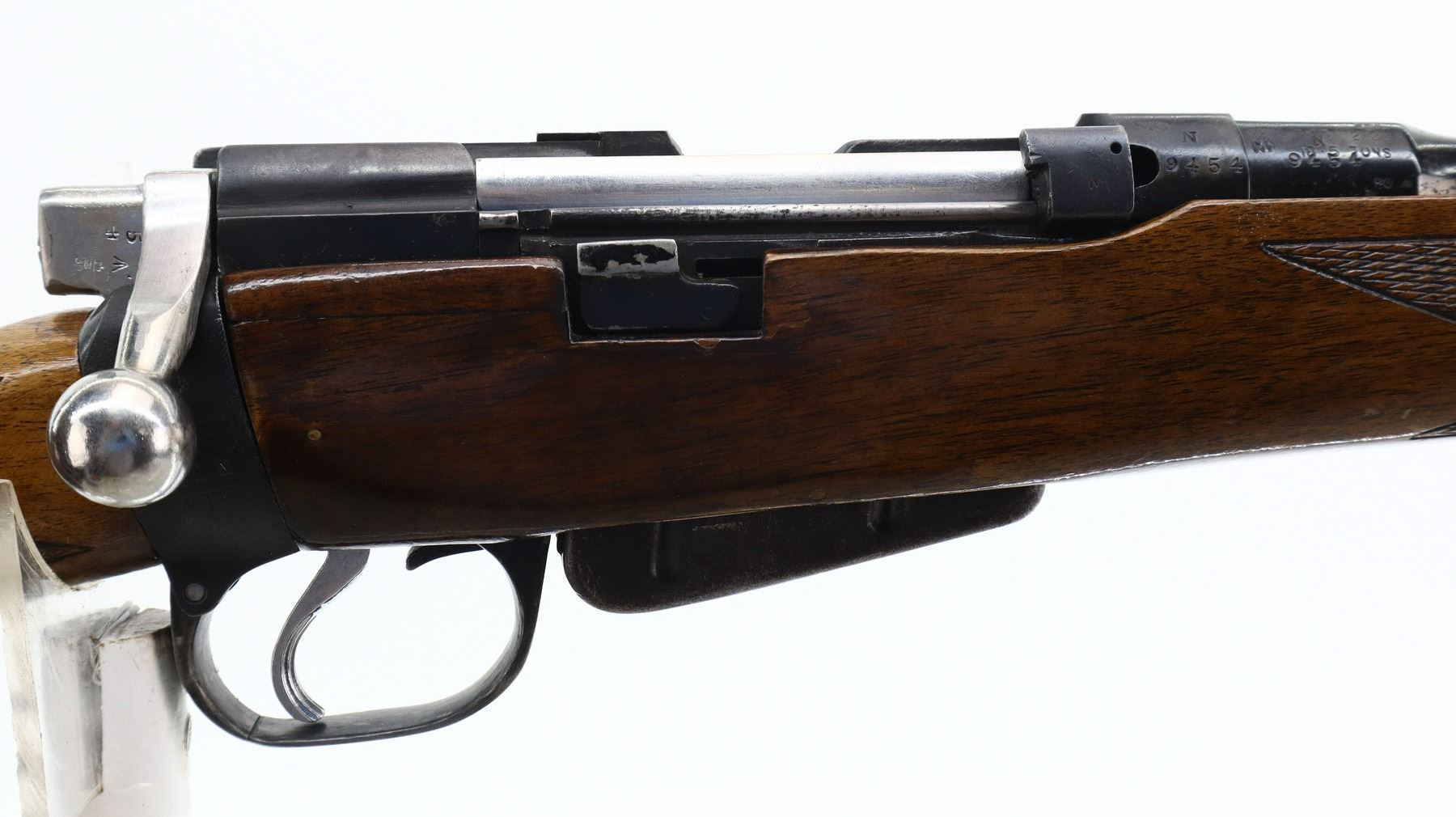 6+/10, LEE ENFIELD, MODEL: NO1 MKIII SPORTER, CALIBER:303 BR, COMES WITH MAGAZINE, BORE IS GOOD. MANUFACTURED ENFIELD 1918, BOLT UNNUMBERED. BLADE FRONT SIGHT WITH RAMP, ADJUSTABLE U NOTCHED REAR SIGHT, RECEIVER BRIDGE REMOVED, SILVER BOLT WITH MODIFIED HANDLE AND COCKING PIECE. TWO PIECE WOOD MONTE CARLO STOCKS, CHECKERED FOREARM AND PISTOL GRIP, CHEEK REST, CHECKERED BLACK POLYMER BUTT PLATE, GRIP CAP, SLING SWIVELS. METAL FINISH SHOWS SOME SCRATCHES, HANDLING MARKS AND WEAR. STOCKS SHOW SOME MARKS, SCRATCHES AND WEAR. , ACTION: BOLT ACTION RIFLE, BARREL LENGTH: 18", SERIAL # N9454, CONDITION: 6+/10, CLASS: CANADIAN NON RESTRICTED