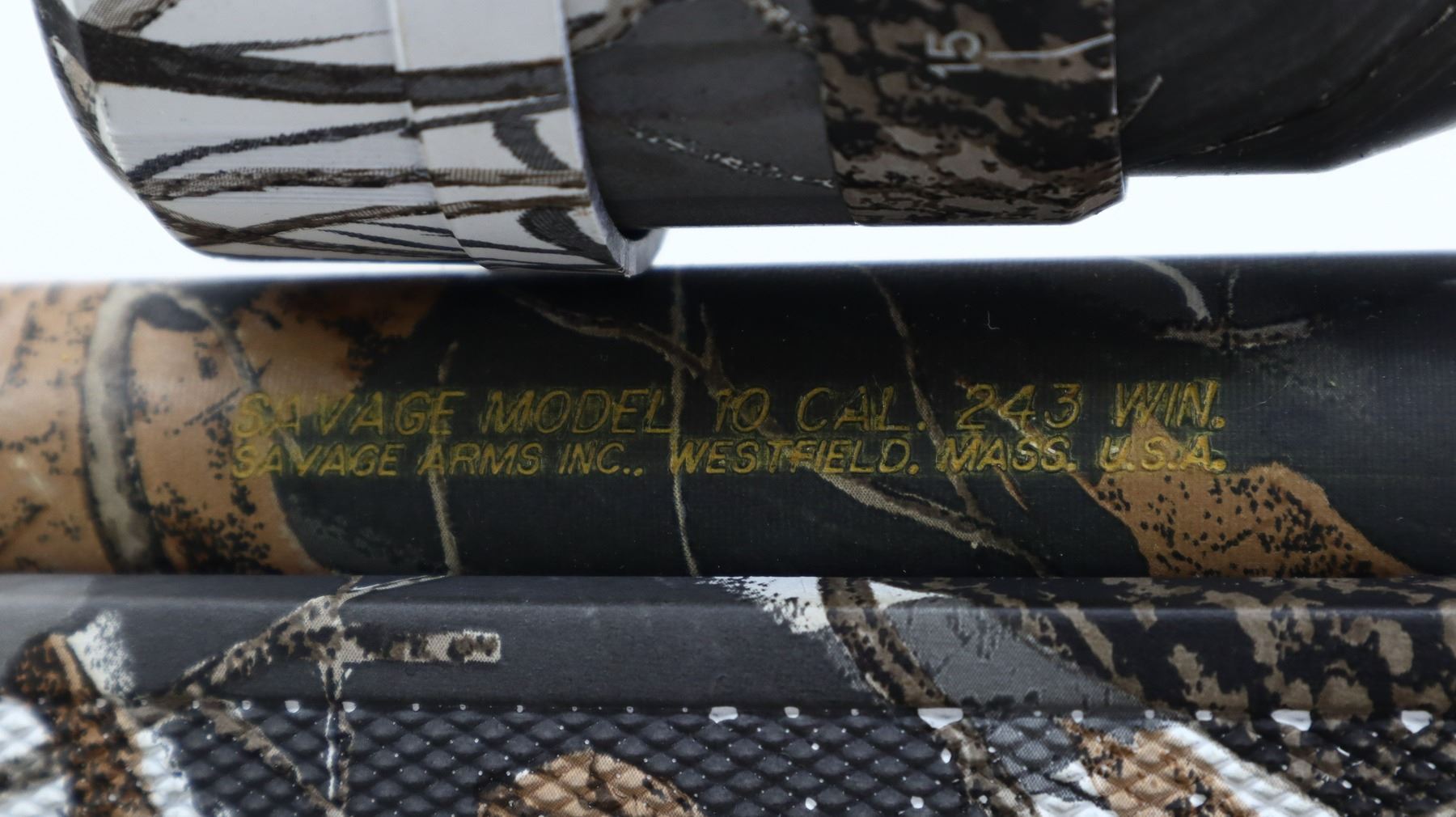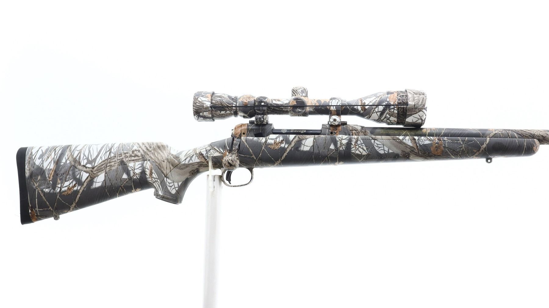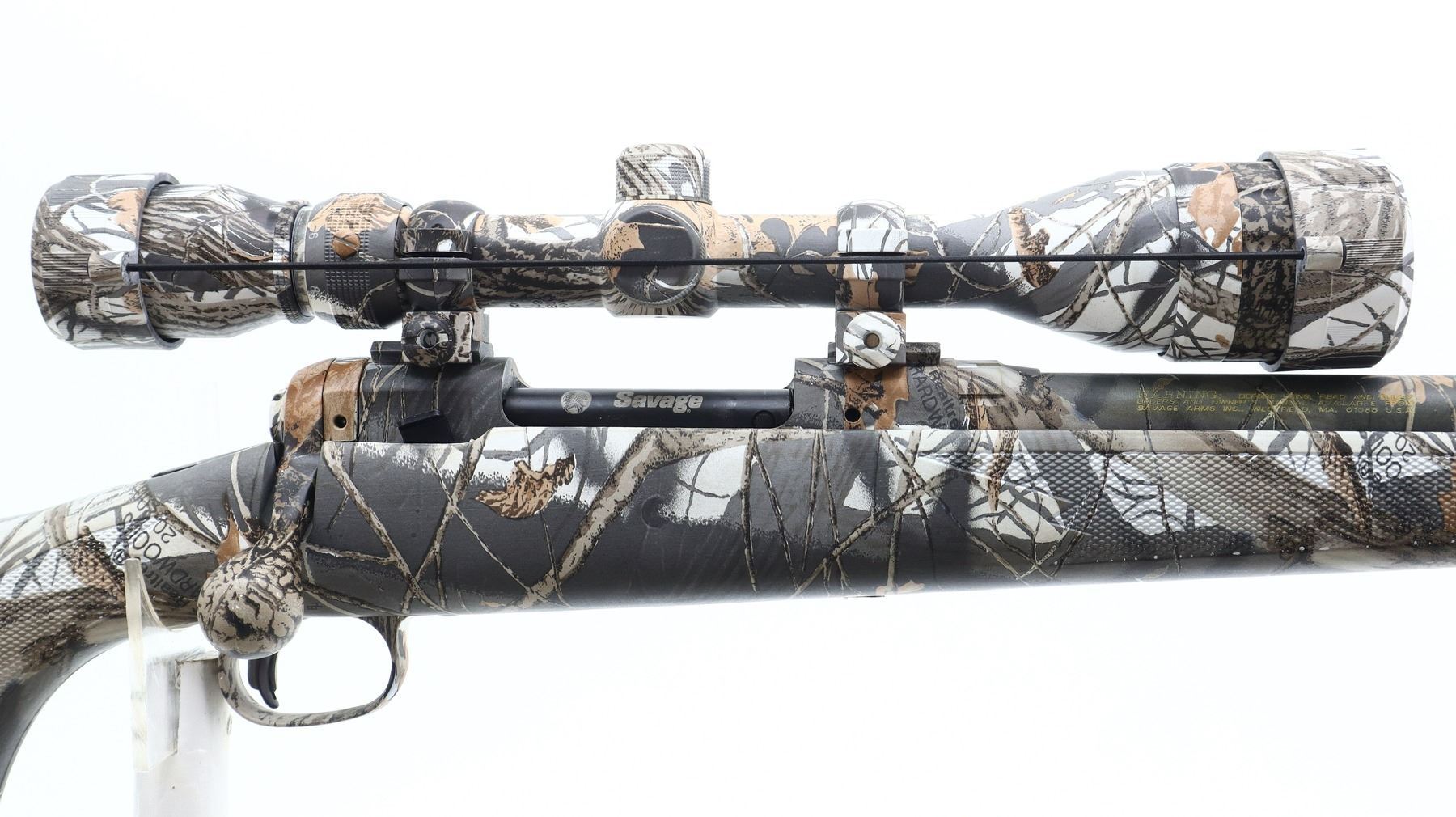 AS NEW NO BOX, SAVAGE, MODEL: 10 HB, CALIBER:243 WIN, BORE IS EXCELLENT. APPEARS AS NEW, MAY HAVE BEEN TEST FIRED IN FACTORY. HEAVY BARREL NO SIGHTS, HAS REAL TREE HARDWOODS CAMO OVERALL, RECEIVER DRILLED AND TAPPED WITH CAMO 4-12 X 40 AO SCOPE, CLEAR OPTICS WITH DUPLEX CROSSHAIR, LARGE BOLT KNOB. ONE PIECE SYNTHETIC STOCK, CHECKERED FOREARM AND PISTOL GRIP, BLACK RUBBER RECOIL PAD, GRIP CAP, SWIVEL STUDS. SHOWS SLIGHT SCRATCHES AND HANDLING MARKS OVERALL. , ACTION: BOLT ACTION RIFLE, BARREL LENGTH: 22", SERIAL # G893737, CONDITION: AS NEW NO BOX, CLASS: CANADIAN NON RESTRICTED