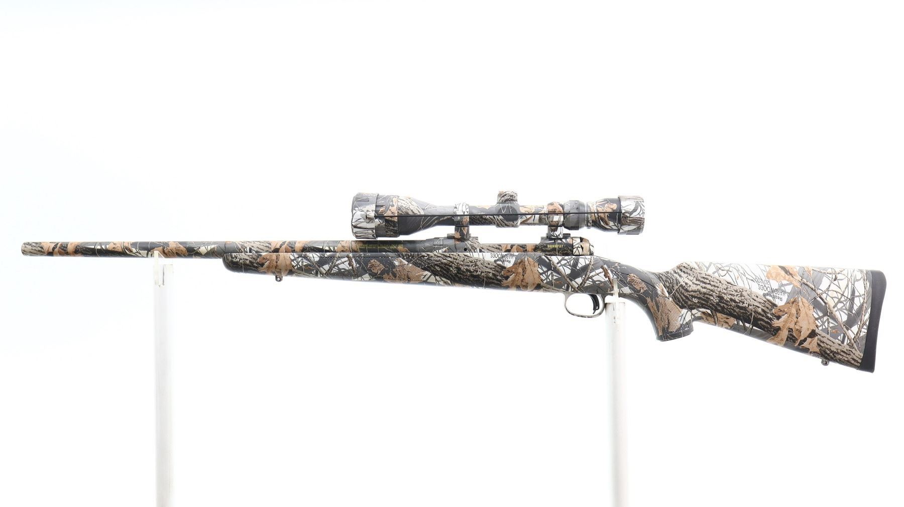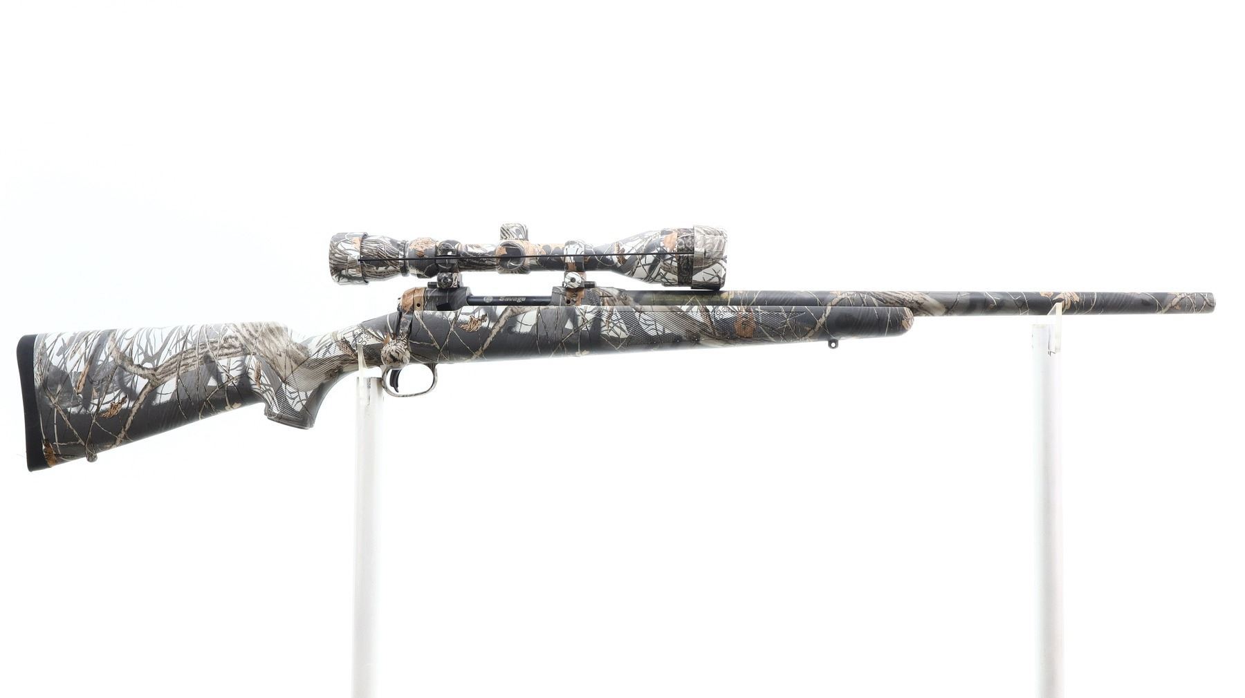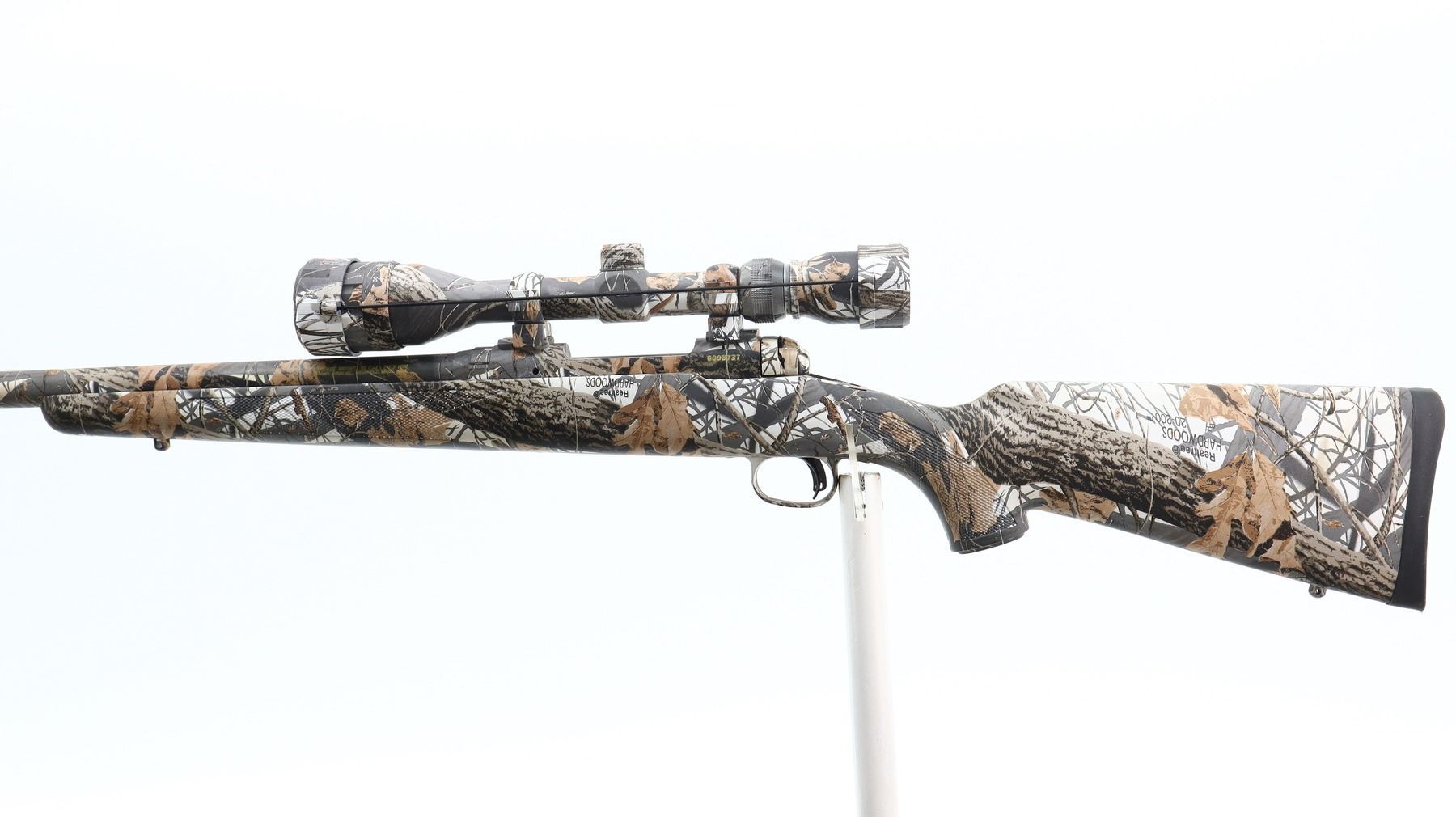 AS NEW NO BOX, SAVAGE, MODEL: 10 HB, CALIBER:243 WIN, BORE IS EXCELLENT. APPEARS AS NEW, MAY HAVE BEEN TEST FIRED IN FACTORY. HEAVY BARREL NO SIGHTS, HAS REAL TREE HARDWOODS CAMO OVERALL, RECEIVER DRILLED AND TAPPED WITH CAMO 4-12 X 40 AO SCOPE, CLEAR OPTICS WITH DUPLEX CROSSHAIR, LARGE BOLT KNOB. ONE PIECE SYNTHETIC STOCK, CHECKERED FOREARM AND PISTOL GRIP, BLACK RUBBER RECOIL PAD, GRIP CAP, SWIVEL STUDS. SHOWS SLIGHT SCRATCHES AND HANDLING MARKS OVERALL. , ACTION: BOLT ACTION RIFLE, BARREL LENGTH: 22", SERIAL # G893737, CONDITION: AS NEW NO BOX, CLASS: CANADIAN NON RESTRICTED
