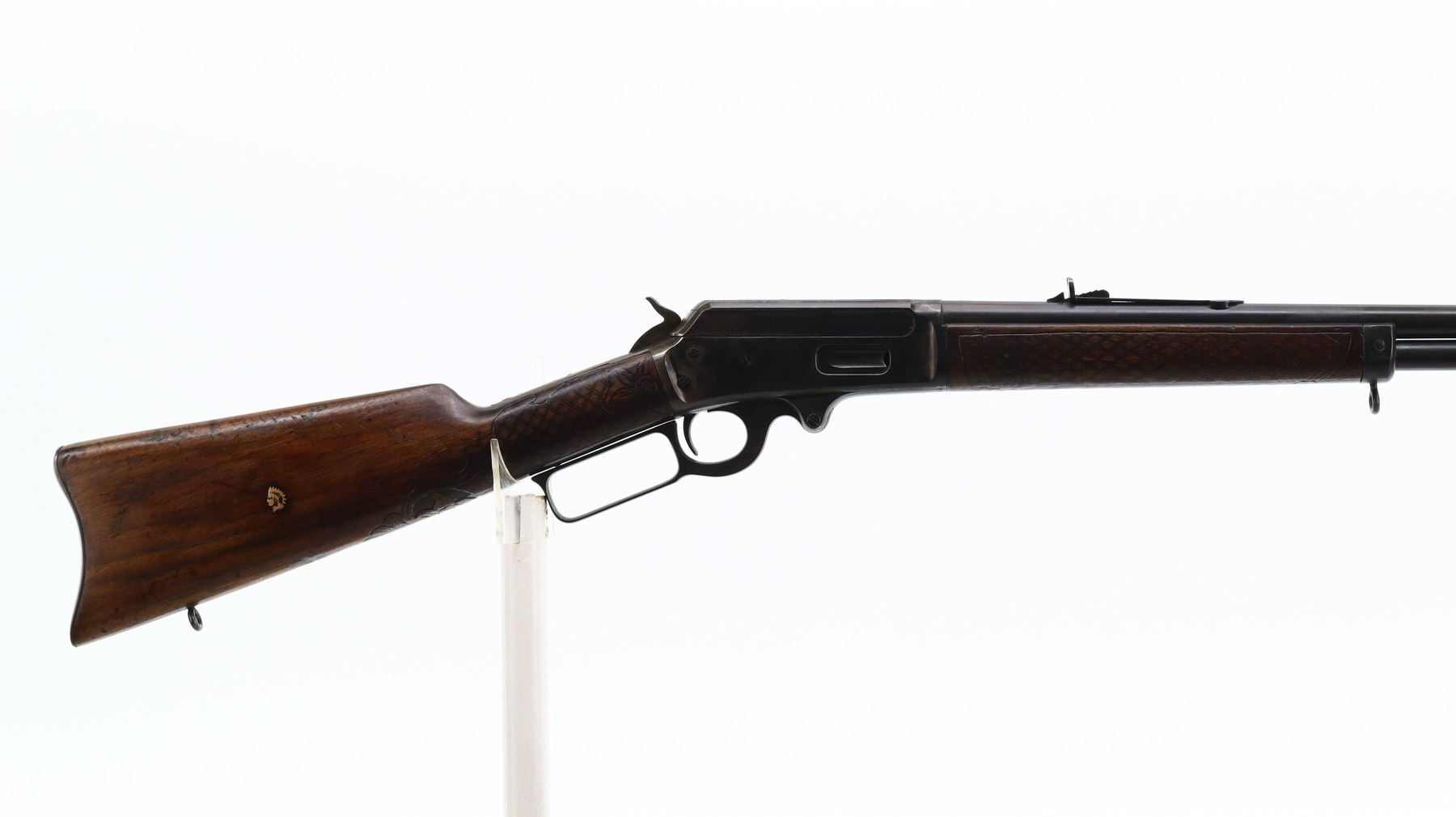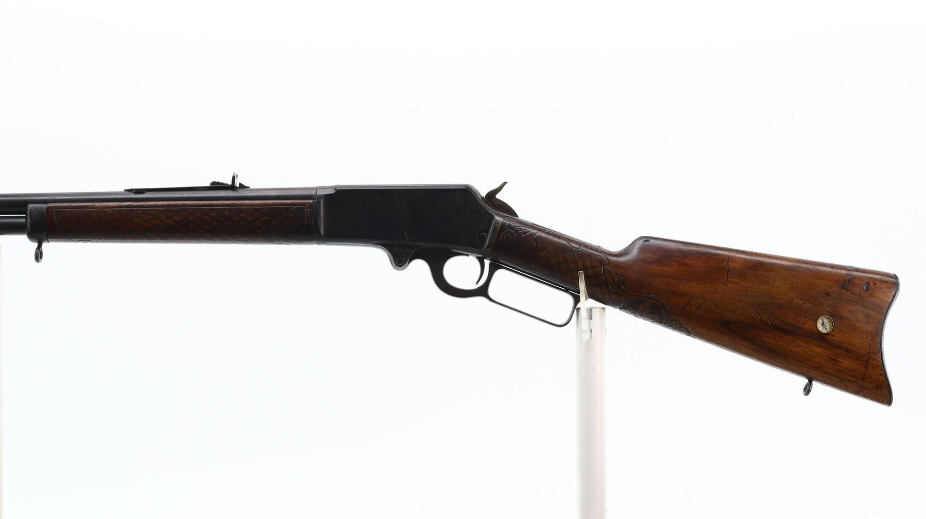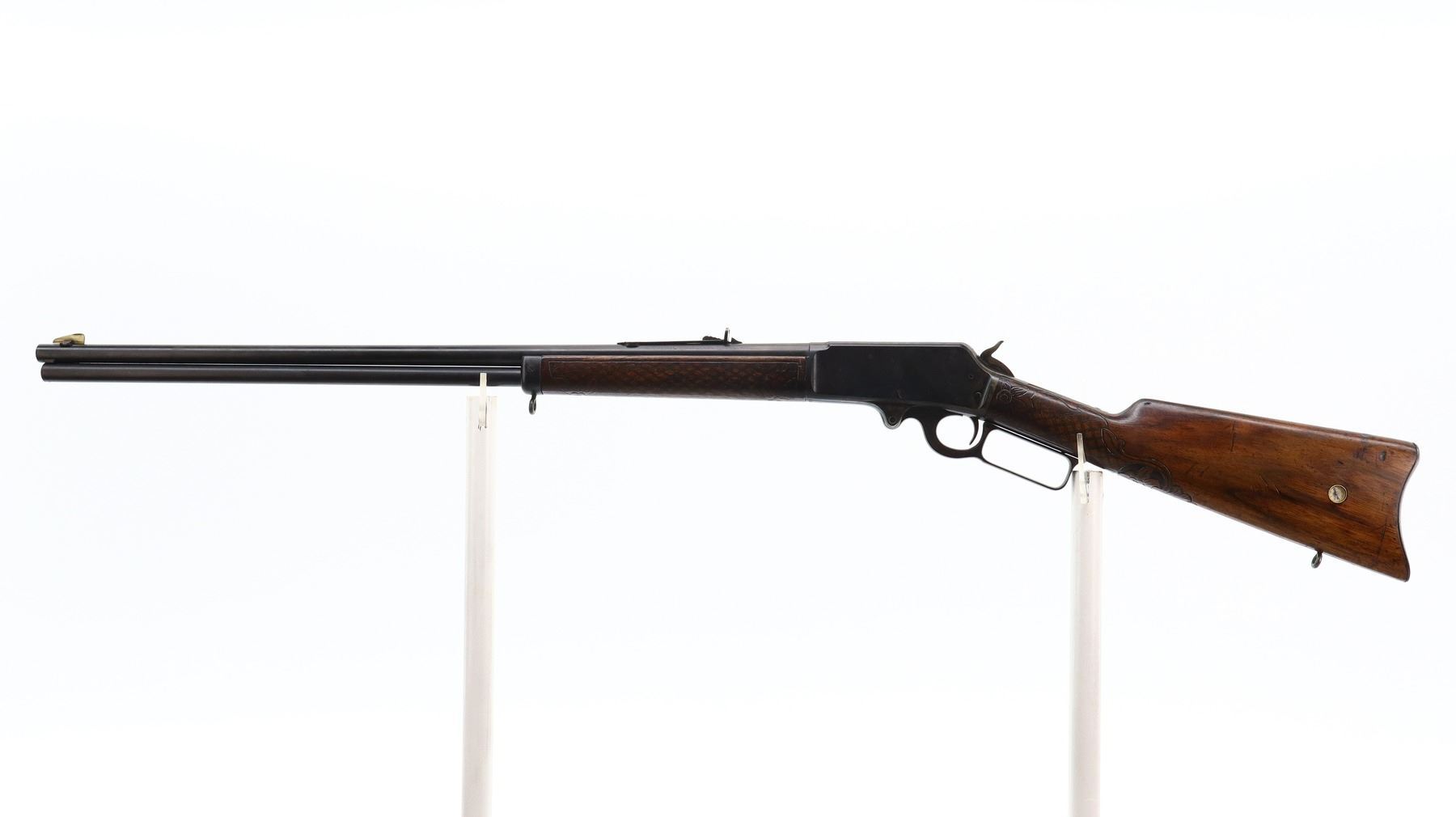 7/10, MARLIN, MODEL: 1893, CALIBER:38-55, BORE IS FAIR, WORN, LIGHT PITTING. BLADE FRONT SIGHT, ADJUSTABLE U NOTCHED SEMI BUCKHORN REAR SIGHT, ROUND BARREL, CHECKERED SPUR HAMMER. TWO PIECE WOOD STOCKS, CUSTOM CHECKERED FOREARM AND STRAIGHT GRIP, SMOOTH CURVED STEEL BUTT PLATE, BRASS INLAY ON RIGHT SIDE AND COMPASS ON LEFT SIDE OF STOCK, SWIVEL STUDS, FULL LENGTH MAG TUBE. METAL FINISH SHOWS SOME SCRATCHES, HANDLING MARKS AND WEAR. STOCKS SHOW SOME MARKS, SCRATCHES AND WEAR. , ACTION: LEVER ACTION RIFLE, BARREL LENGTH: 26", SERIAL # 343232, CONDITION: 7/10, CLASS: CANADIAN NON RESTRICTED