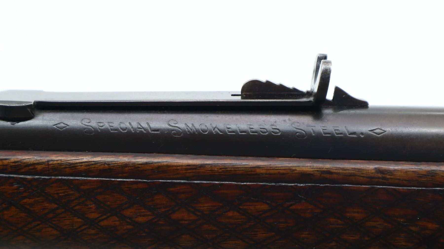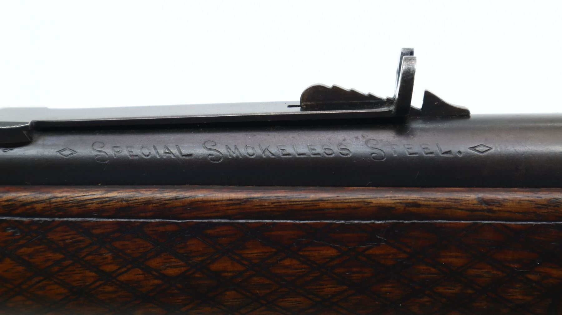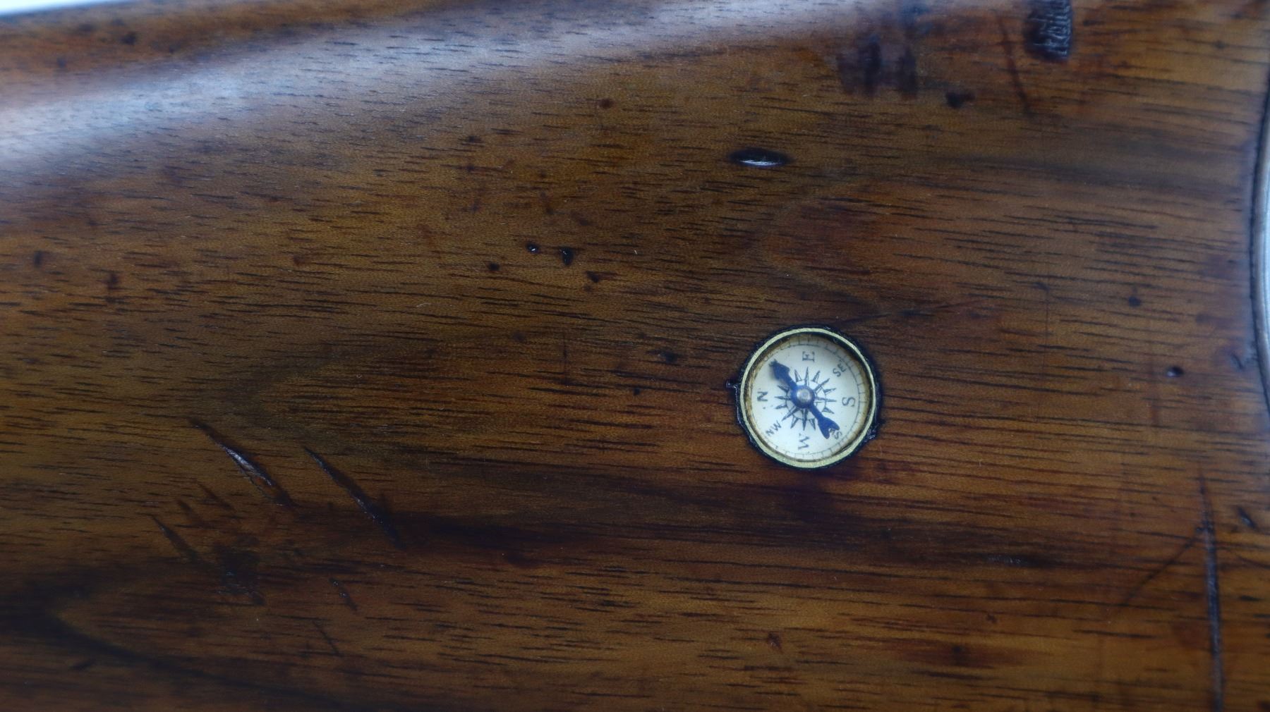 7/10, MARLIN, MODEL: 1893, CALIBER:38-55, BORE IS FAIR, WORN, LIGHT PITTING. BLADE FRONT SIGHT, ADJUSTABLE U NOTCHED SEMI BUCKHORN REAR SIGHT, ROUND BARREL, CHECKERED SPUR HAMMER. TWO PIECE WOOD STOCKS, CUSTOM CHECKERED FOREARM AND STRAIGHT GRIP, SMOOTH CURVED STEEL BUTT PLATE, BRASS INLAY ON RIGHT SIDE AND COMPASS ON LEFT SIDE OF STOCK, SWIVEL STUDS, FULL LENGTH MAG TUBE. METAL FINISH SHOWS SOME SCRATCHES, HANDLING MARKS AND WEAR. STOCKS SHOW SOME MARKS, SCRATCHES AND WEAR. , ACTION: LEVER ACTION RIFLE, BARREL LENGTH: 26", SERIAL # 343232, CONDITION: 7/10, CLASS: CANADIAN NON RESTRICTED