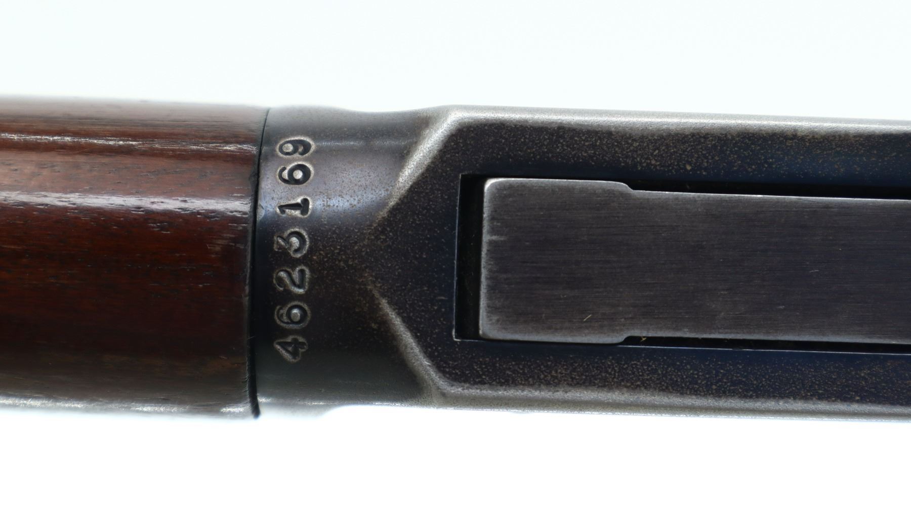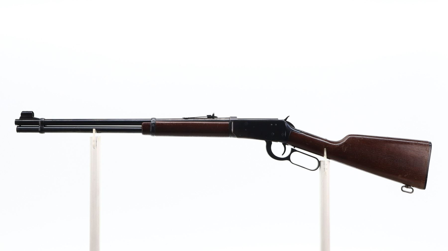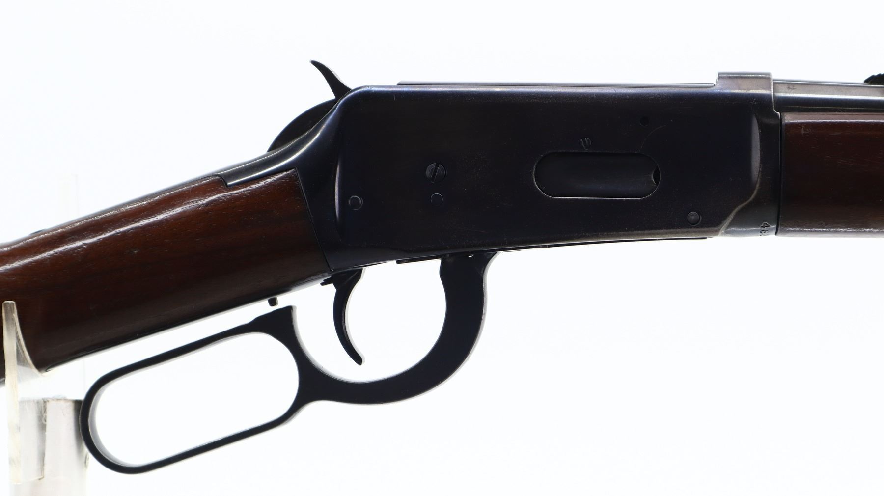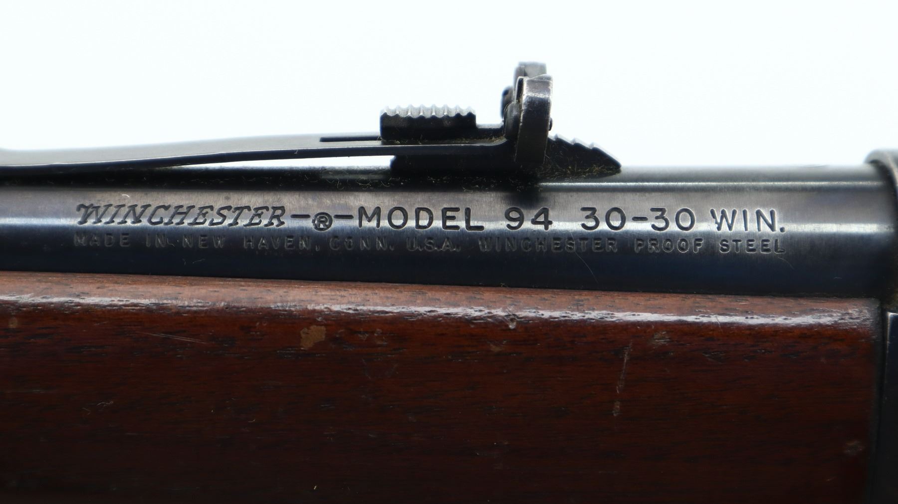 7/10, WINCHESTER, MODEL: 94, CALIBER:30-30 WIN, BORE IS VERY GOOD. BLADE FRONT SIGHT WITH RAMP AND HOOD, ADJUSTABLE U NOTCHED REAR SIGHT, BLUED FINISH, GROOVED SPUR HAMMER. TWO PIECE SMOOTH WOOD STOCKS, STRAIGHT GRIP, CHECKERED BLACK POLYMER BUTT PLATE, REAR SWIVEL ONLY. METAL FINISH SHOWS SOME SCRATCHES, HANDLING MARKS AND WEAR. STOCKS SHOW SOME MARKS, SCRATCHES AND WEAR. , ACTION: LEVER ACTION RIFLE, BARREL LENGTH: 20", SERIAL # 4623169, CONDITION: 7/10, CLASS: CANADIAN NON RESTRICTED