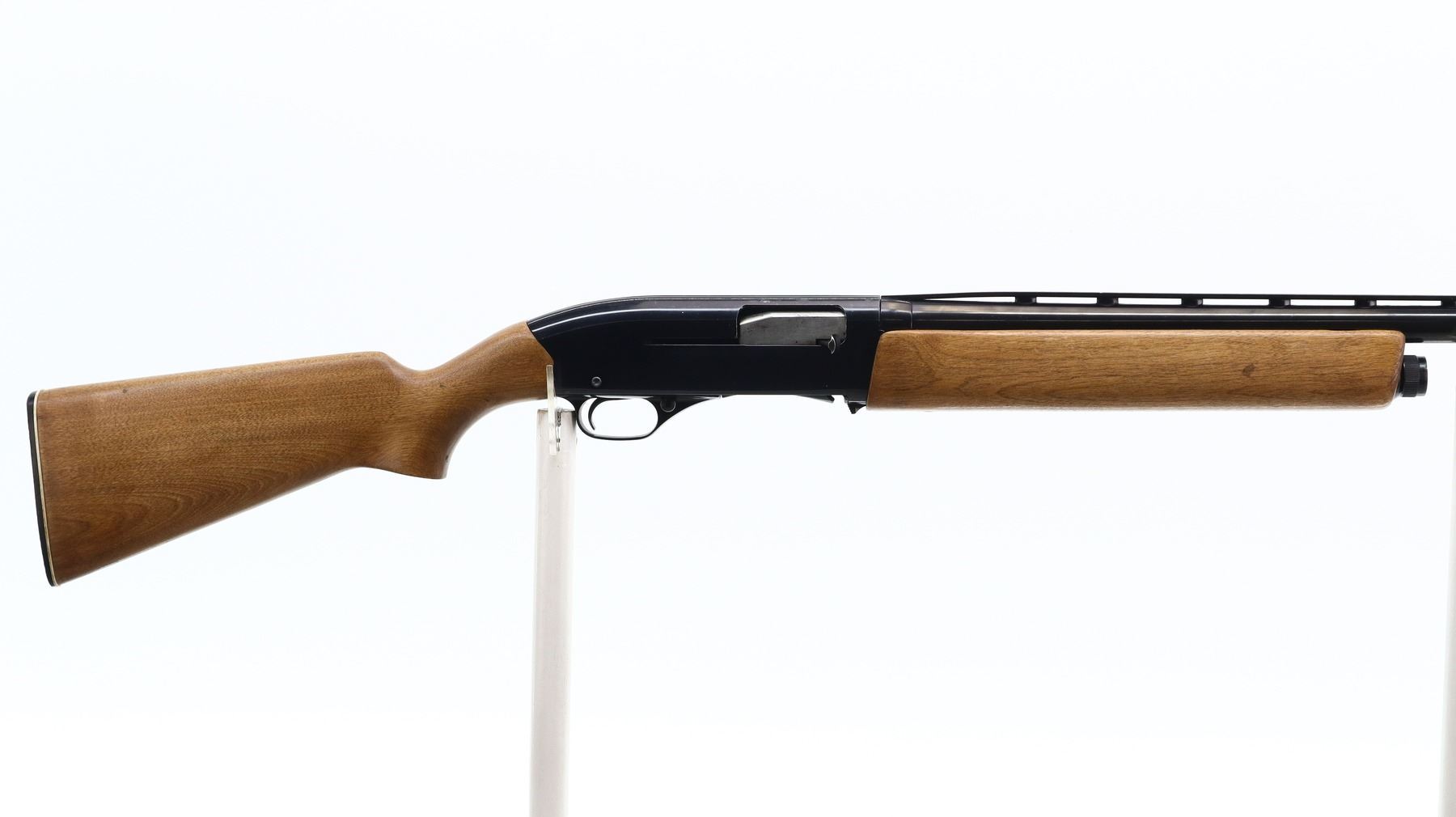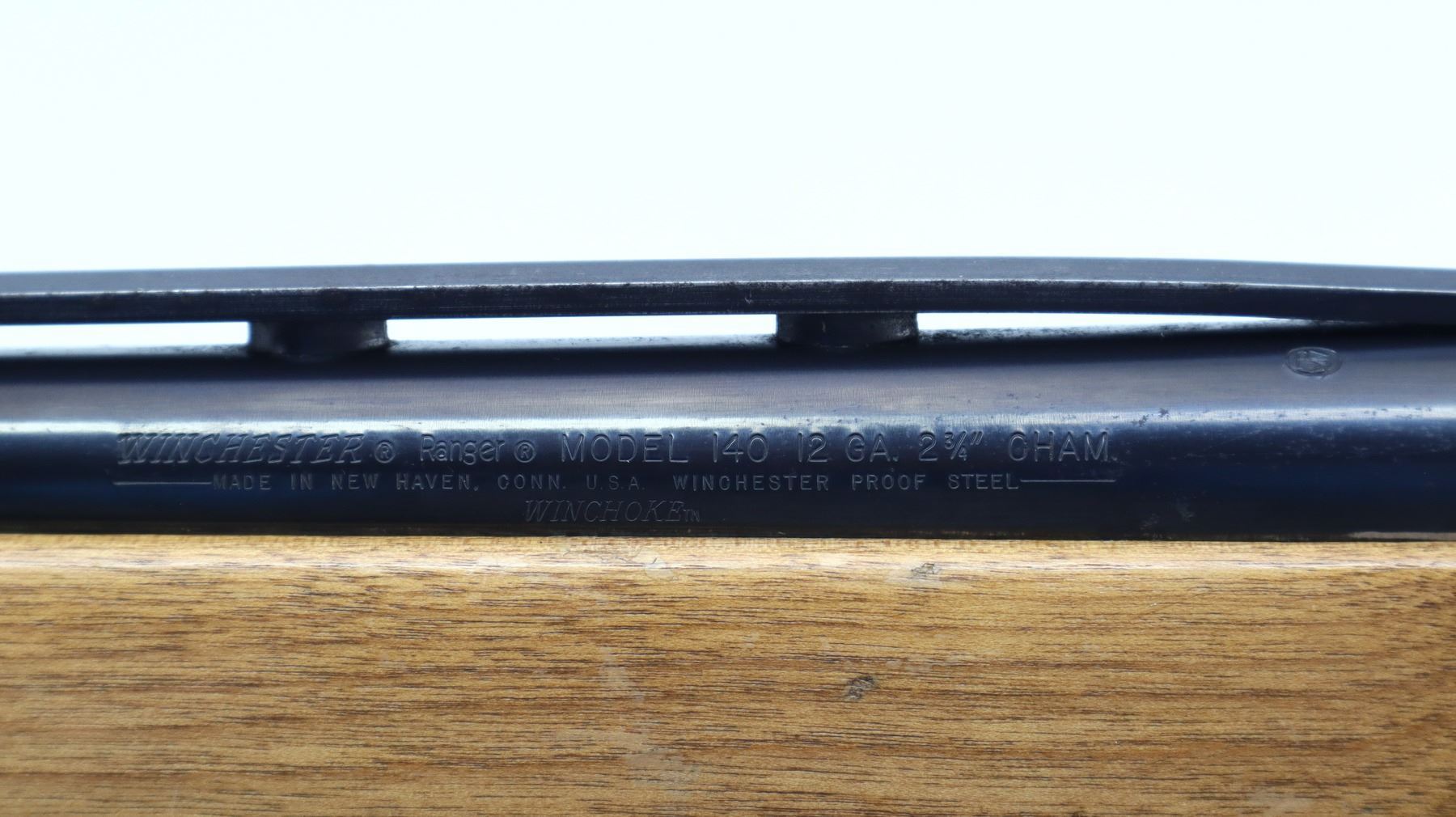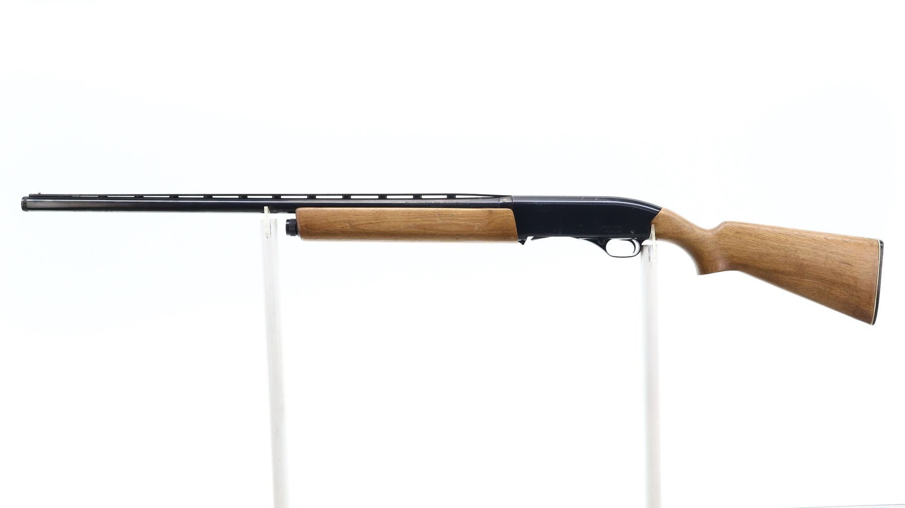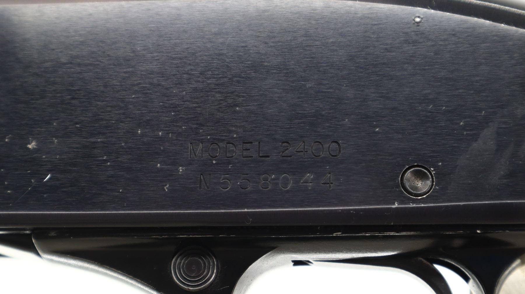 6+/10, WINCHESTER, MODEL: 2400, CALIBER:12 G X 2 3/4", BORE IS EXCELLENT. HAS A REMOVABLE MOD CHOKE. SHOTGUN HAS A WINCHESTER RANGER 140 BARREL INSTALLED WITH BRASS BEAD AND VENT RIB, BLUED FINISH, BLACK ALLOY RECEIVER. TWO PIECE SMOOTH WOOD STOCKS, PISTOL GRIP, CHECKERED BLACK POLYMER BUTT PLATE. METAL FINISH SHOWS SOME LIGHT RUST SPOTS, SCRATCHES, HANDLING MARKS AND WEAR. STOCKS SHOW SOME MARKS, SCRATCHES AND WEAR. , ACTION: SEMI AUTOMATIC SHOTGUN, BARREL LENGTH: 28", SERIAL # N558044, CONDITION: 6+/10, CLASS: CANADIAN NON RESTRICTED