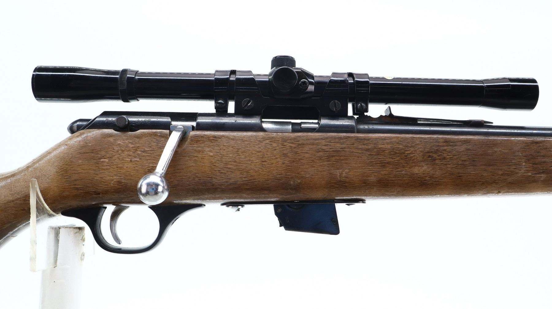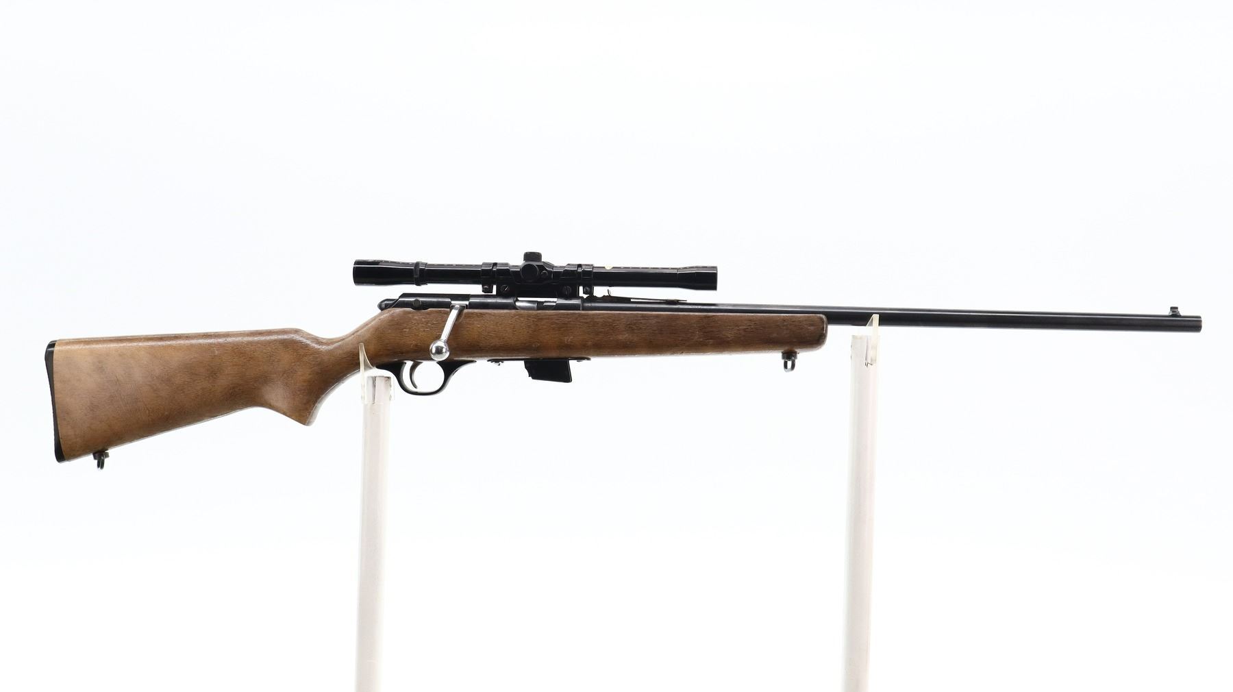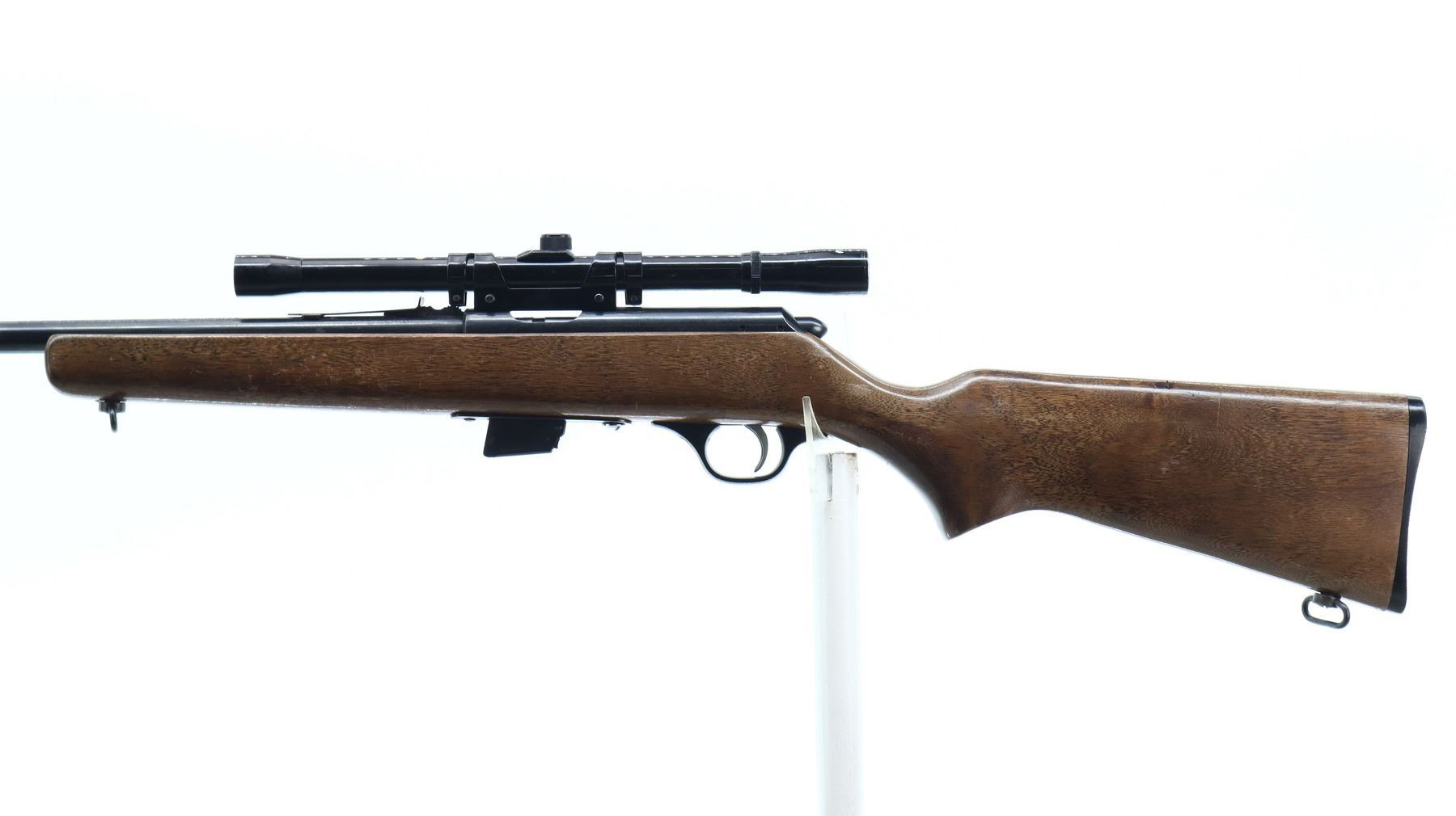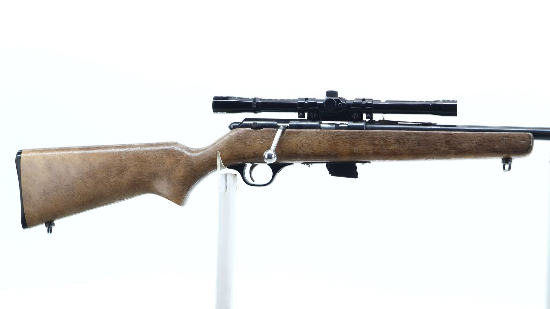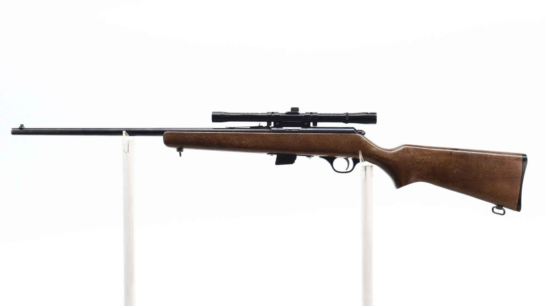 7/10, GLENFIELD, MODEL: 20, CALIBER:22 LR, COMES WITH MAGAZINE, BORE IS VERY GOOD. BLADE FRONT SIGHT, ADJUSTABLE U NOTCHED REAR SIGHT, BLUED FINISH, GROOVED RECEIVER WITH GLENFIELD 4X15 SCOPE, CLEAR OPTICS WITH FINE CROSSHAIR. ONE PIECE SMOOTH WOOD STOCK, PISTOL GRIP, CHECKERED BLACK POLYMER BUTT PLATE, SLING SWIVELS. METAL FINISH SHOWS A FEW LIGHT RUST SPECKLES, SCRATCHES, HANDLING MARKS AND WEAR. STOCK SHOWS SOME MARKS AND SCRATCHES. , ACTION: BOLT ACTION RIFLE, BARREL LENGTH: 22", SERIAL # NA, CONDITION: 7/10, CLASS: CANADIAN NON RESTRICTED