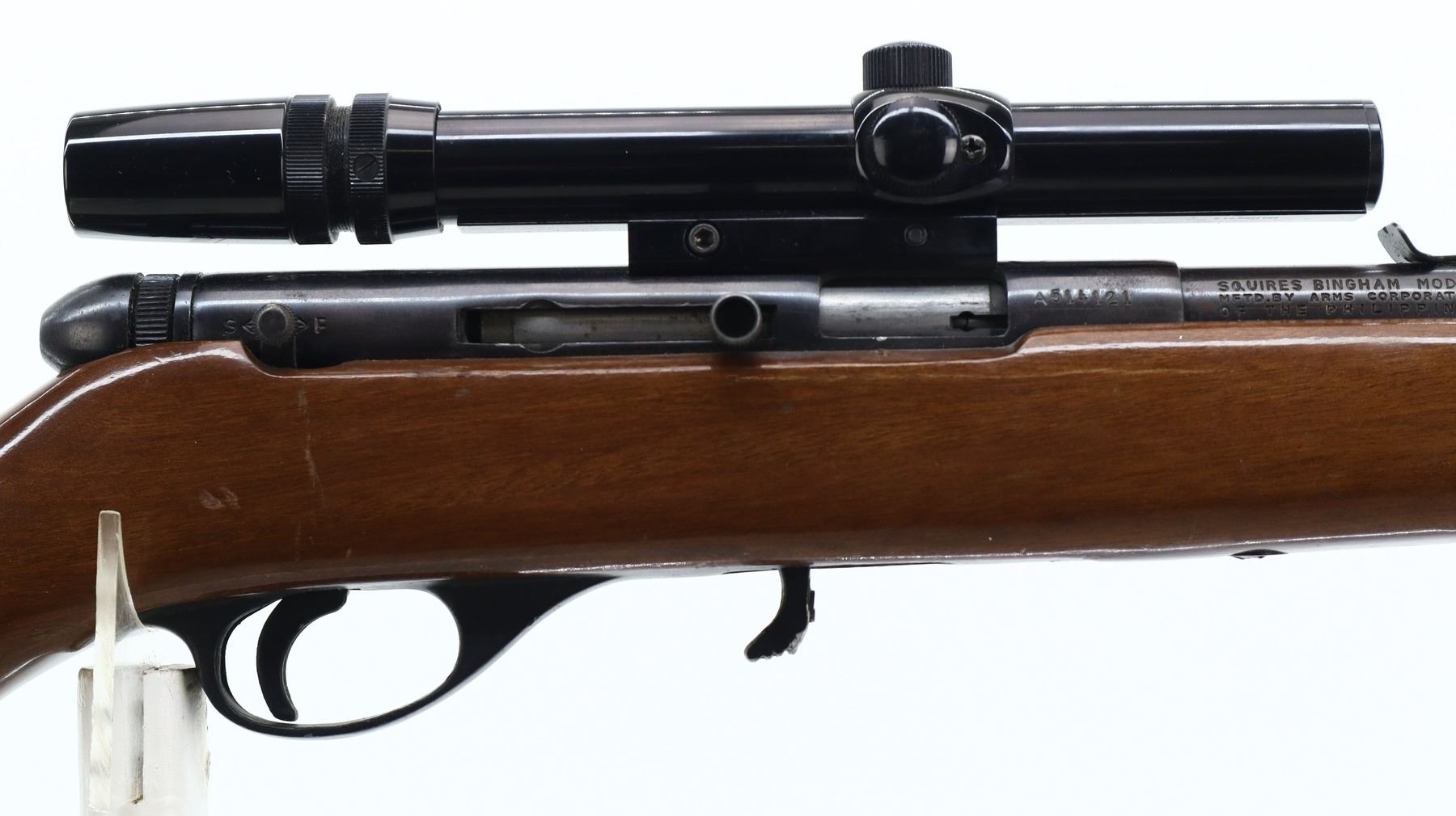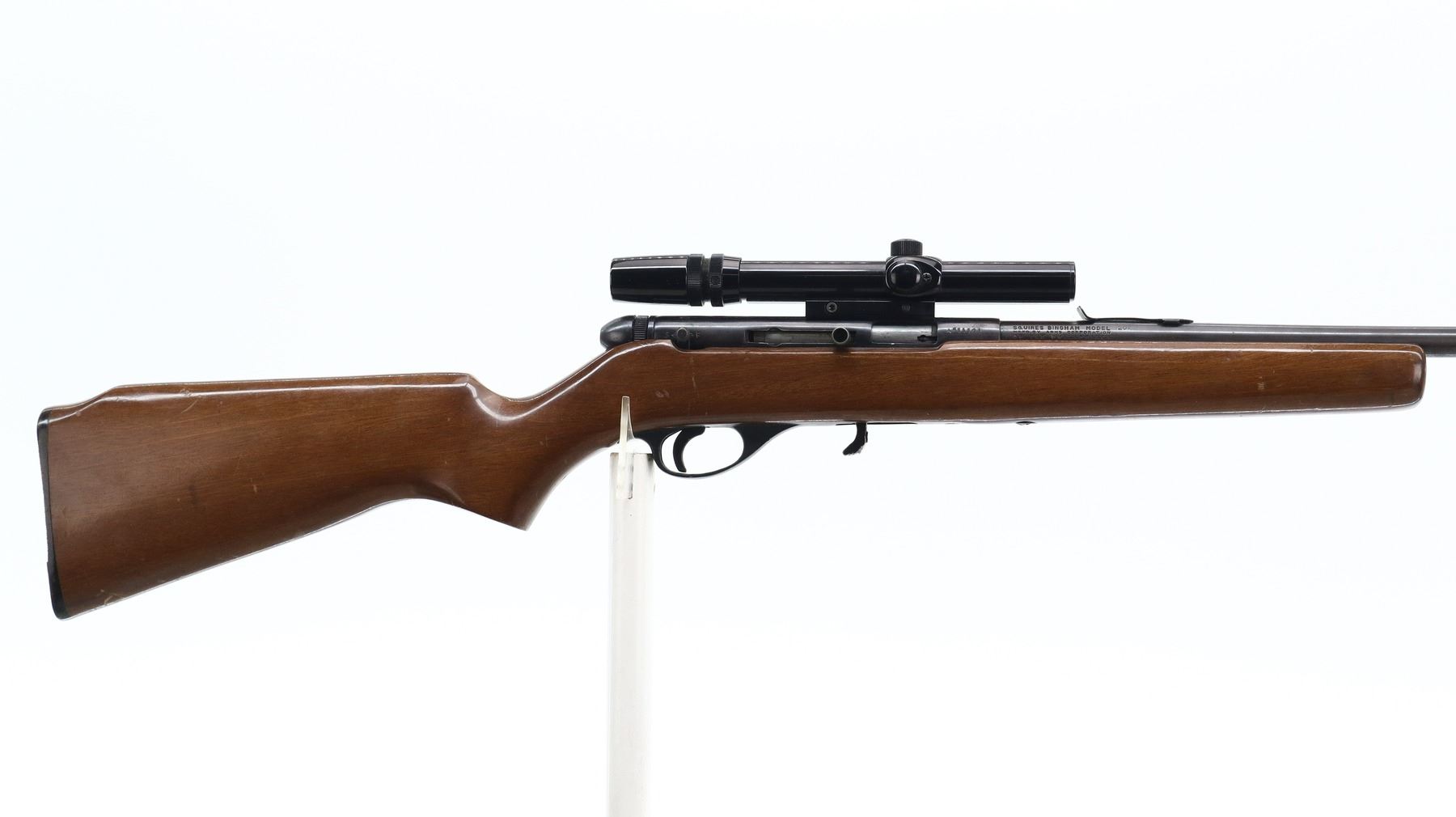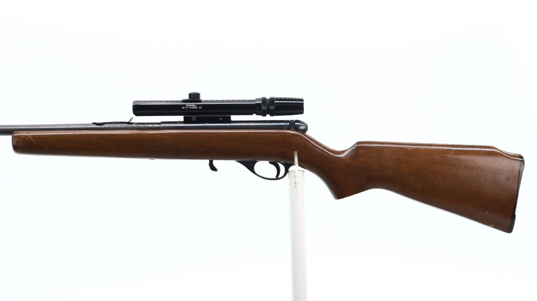 4+/10, SQUIRES BINGHAM, MODEL: 20P, CALIBER:22 LR, DOES NOT COME WITH MAGAZINE, BORE IS VERY GOOD. MISSING FRONT SIGHT, U NOTCHED REAR SIGHT MISSING ELEVATOR, HAS CASE DEFLECTOR NOT INSTALLED MISSING SCREW, GROOVED RECEIVER WITH BUSHNELL 3-7 CUSTOM 22 SCOPE, CLEAR OPTICS WITH DUPLEX CROSSHAIR. ONE PIECE SMOOTH WOOD STOCK, PISTOL GRIP, GROOVED BLACK POLYMER BUTT PLATE. METAL FINISH SHOWS SOME SCRATCHES, HANDLING MARKS AND WEAR. STOCK SHOWS SOME MARKS, SCRATCHES AND WEAR. , ACTION: SEMI AUTOMATIC RIFLE, BARREL LENGTH: 20.75", SERIAL # A514121, CONDITION: 4+/10, CLASS: CANADIAN NON RESTRICTED