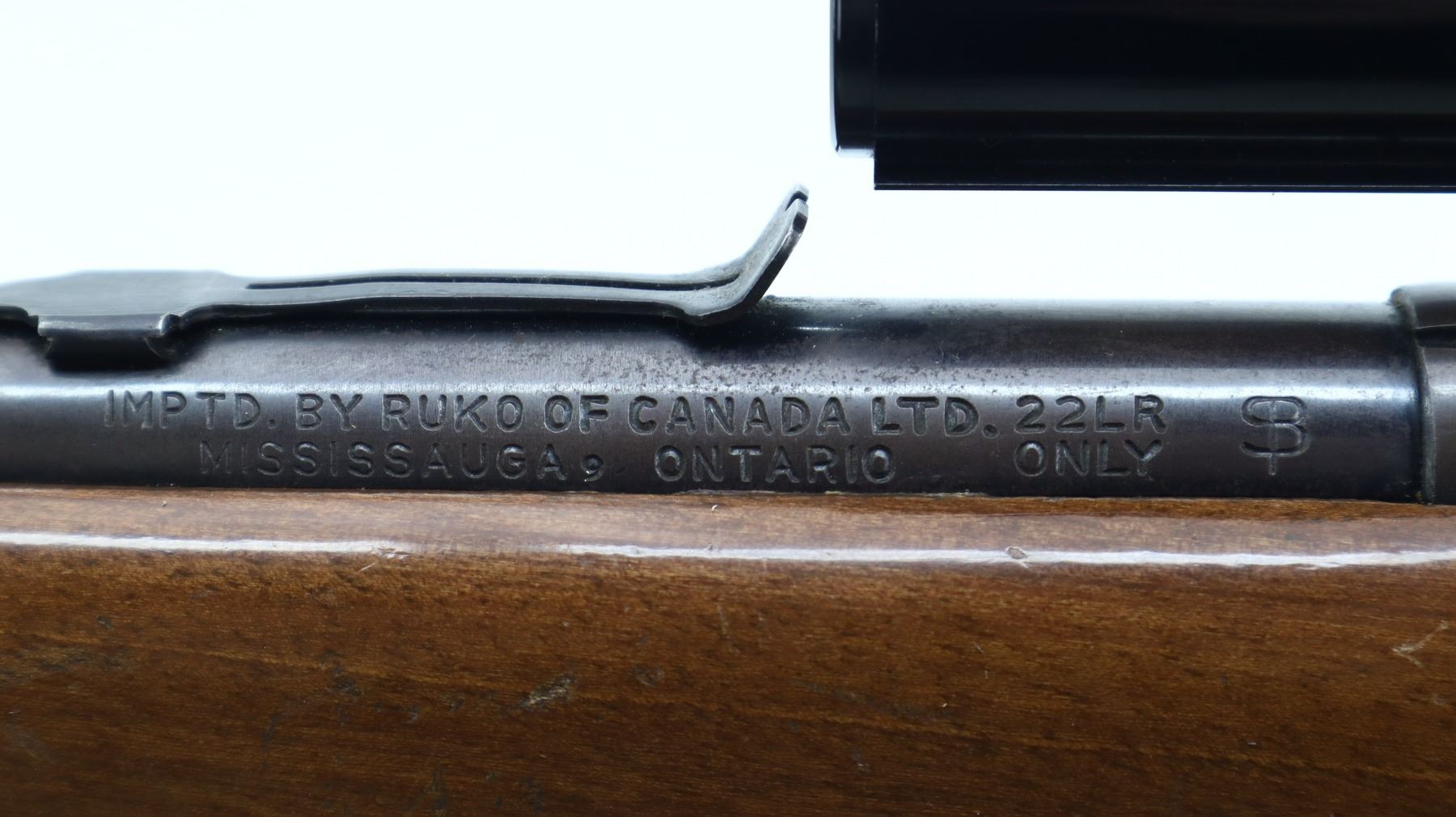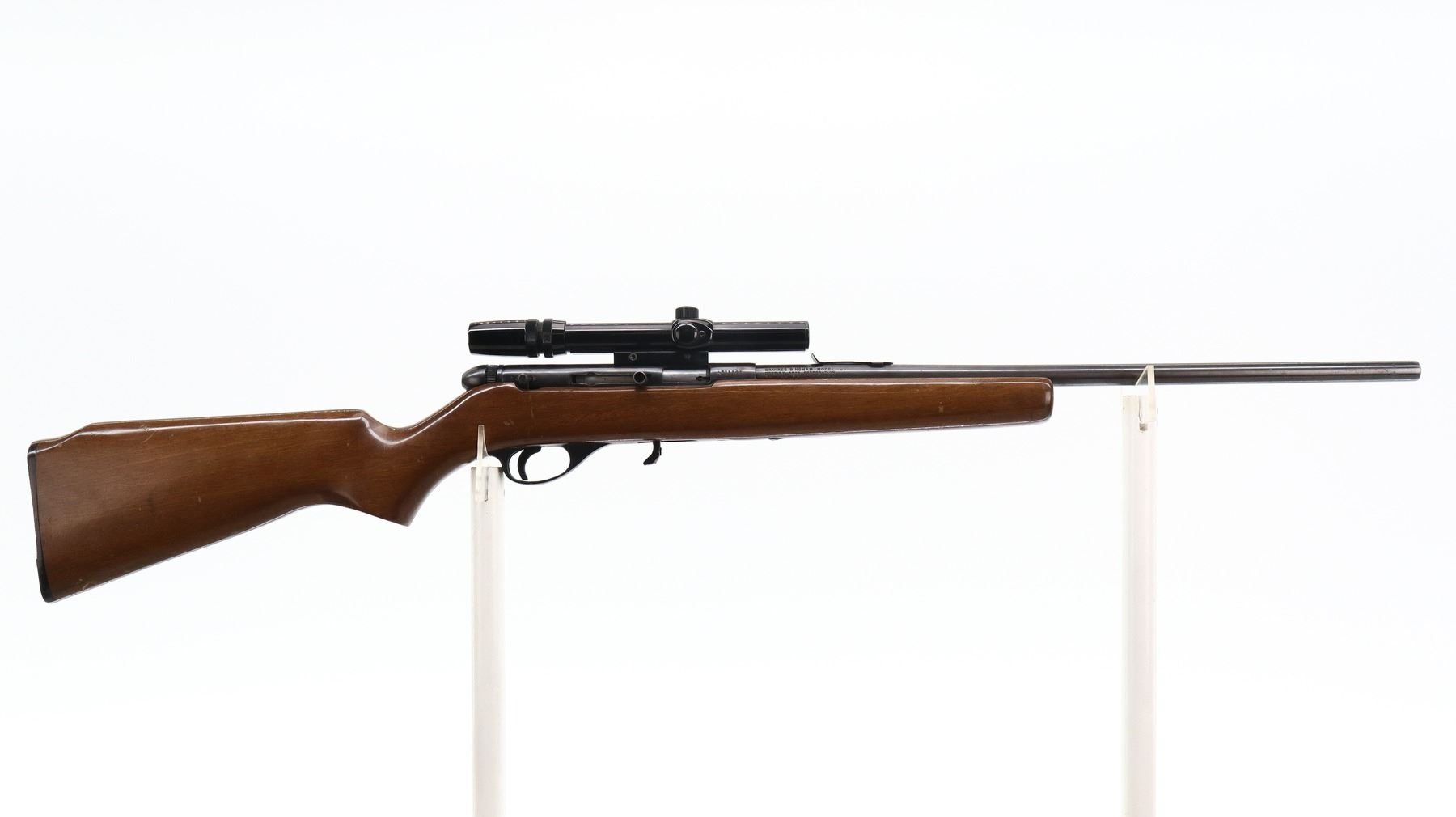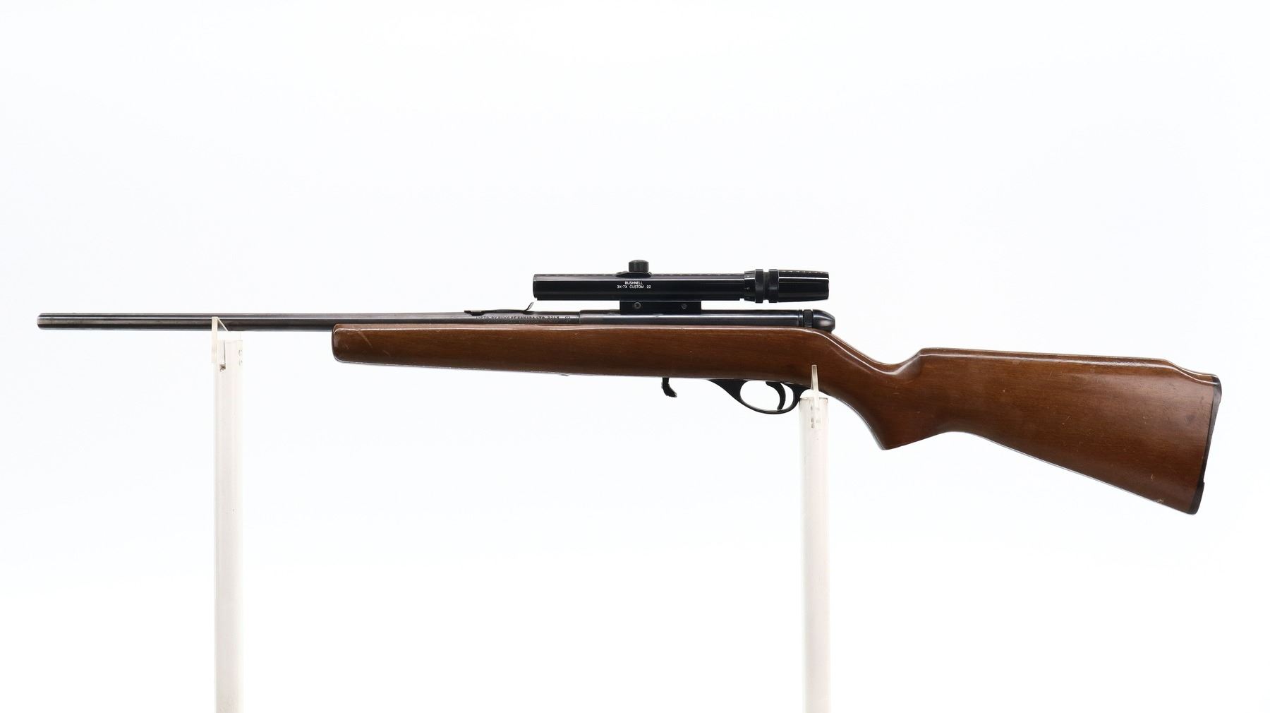 4+/10, SQUIRES BINGHAM, MODEL: 20P, CALIBER:22 LR, DOES NOT COME WITH MAGAZINE, BORE IS VERY GOOD. MISSING FRONT SIGHT, U NOTCHED REAR SIGHT MISSING ELEVATOR, HAS CASE DEFLECTOR NOT INSTALLED MISSING SCREW, GROOVED RECEIVER WITH BUSHNELL 3-7 CUSTOM 22 SCOPE, CLEAR OPTICS WITH DUPLEX CROSSHAIR. ONE PIECE SMOOTH WOOD STOCK, PISTOL GRIP, GROOVED BLACK POLYMER BUTT PLATE. METAL FINISH SHOWS SOME SCRATCHES, HANDLING MARKS AND WEAR. STOCK SHOWS SOME MARKS, SCRATCHES AND WEAR. , ACTION: SEMI AUTOMATIC RIFLE, BARREL LENGTH: 20.75", SERIAL # A514121, CONDITION: 4+/10, CLASS: CANADIAN NON RESTRICTED