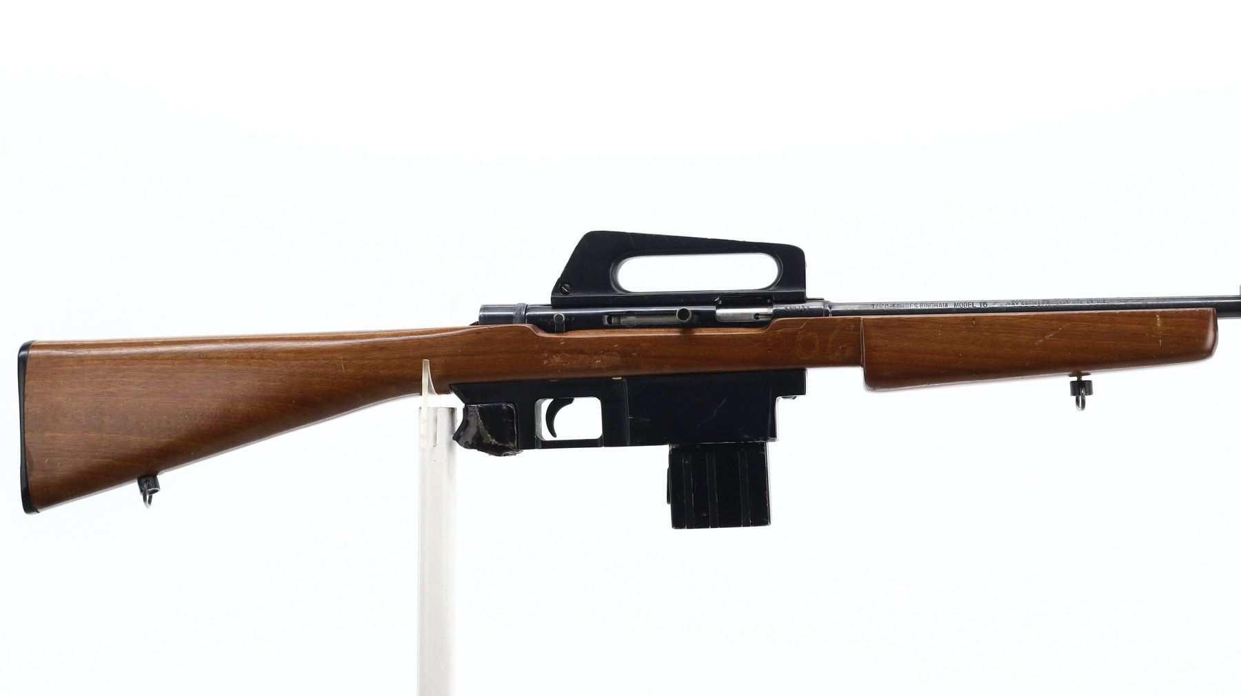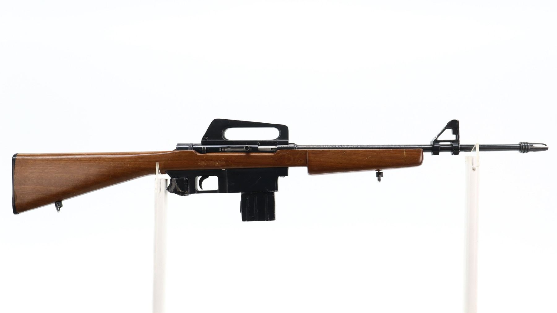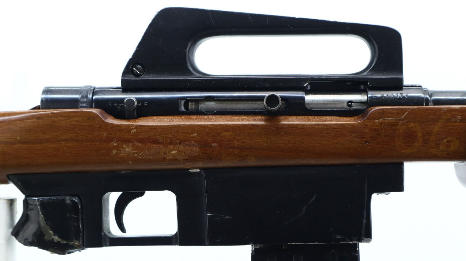 4/10, SQUIRES BINGHAM, MODEL: MODEL 16, CALIBER:22 LR, COMES WITH MAGAZINE, BORE IS VERY GOOD. POST FRONT SIGHT WITH EARS AND RAMP, GROOVED RECEIVER WITH CARRYING HANDLE AND PEEP SIGHT, BLUED FINISH. ONE PIECE SMOOTH WOOD STOCK, PISTOL GRIP BROKEN OFF, GROOVED BLACK POLYMER BUTT PLATE, SLING SWIVELS, FLASH HIDER WITH DAMAGED PRONGS. METAL FINISH SHOWS PITTING, LIGHT RUST SPECKLES, HANDLING MARKS AND WEAR. STOCK SHOWS CHIPS, MARKS, SCRATCHES AND WEAR. , ACTION: SEMI AUTOMATIC RIFLE, BARREL LENGTH: 19", SERIAL # 435177, CONDITION: 4/10, CLASS: CANADIAN NON RESTRICTED