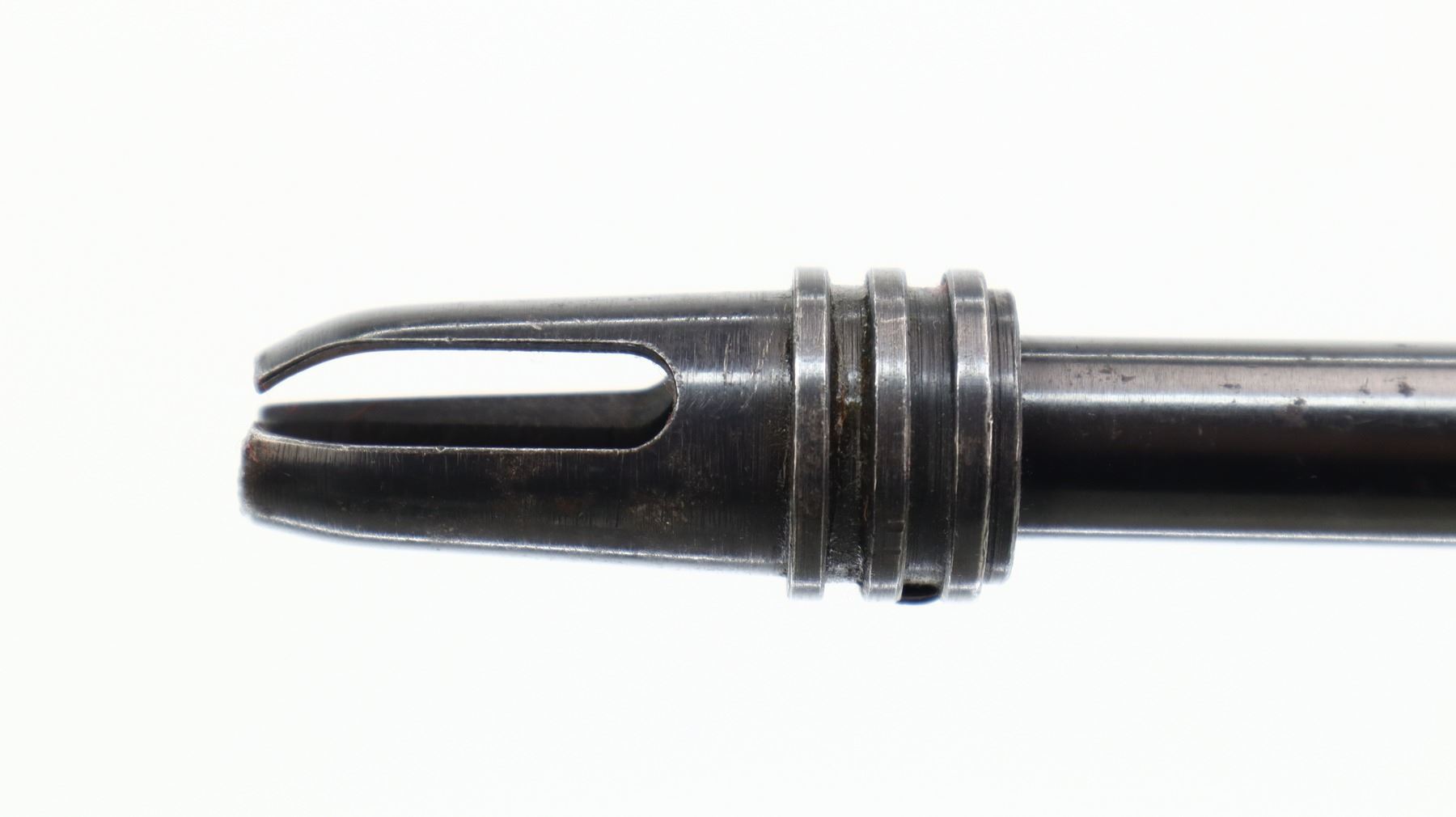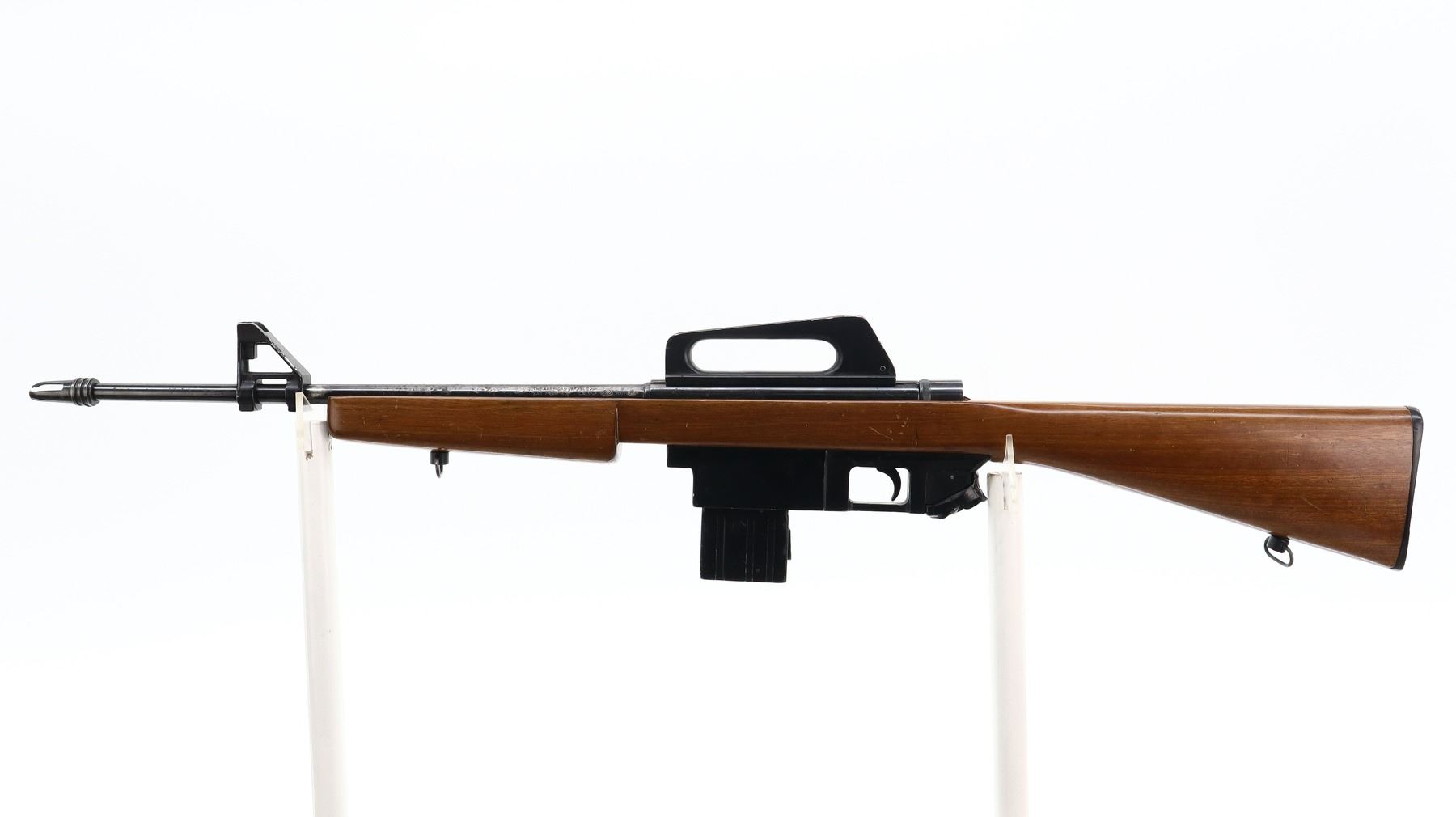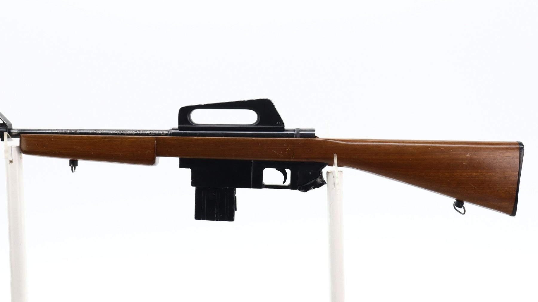 4/10, SQUIRES BINGHAM, MODEL: MODEL 16, CALIBER:22 LR, COMES WITH MAGAZINE, BORE IS VERY GOOD. POST FRONT SIGHT WITH EARS AND RAMP, GROOVED RECEIVER WITH CARRYING HANDLE AND PEEP SIGHT, BLUED FINISH. ONE PIECE SMOOTH WOOD STOCK, PISTOL GRIP BROKEN OFF, GROOVED BLACK POLYMER BUTT PLATE, SLING SWIVELS, FLASH HIDER WITH DAMAGED PRONGS. METAL FINISH SHOWS PITTING, LIGHT RUST SPECKLES, HANDLING MARKS AND WEAR. STOCK SHOWS CHIPS, MARKS, SCRATCHES AND WEAR. , ACTION: SEMI AUTOMATIC RIFLE, BARREL LENGTH: 19", SERIAL # 435177, CONDITION: 4/10, CLASS: CANADIAN NON RESTRICTED