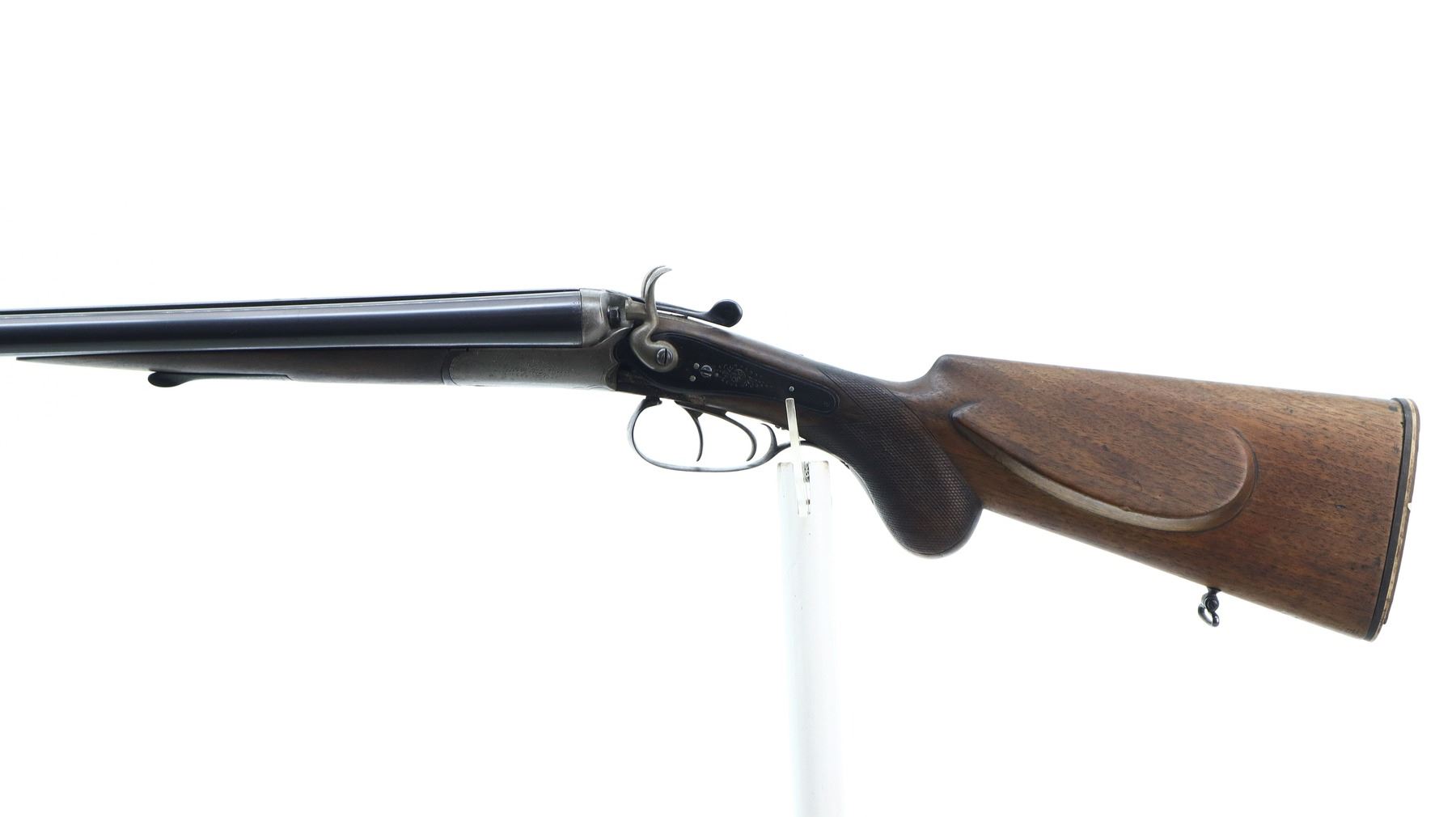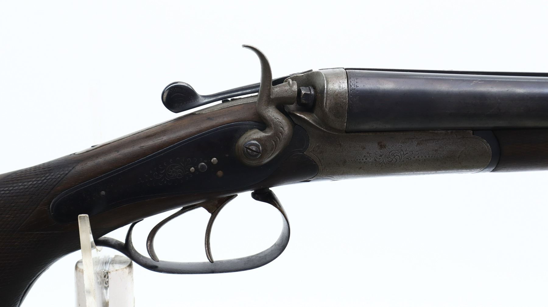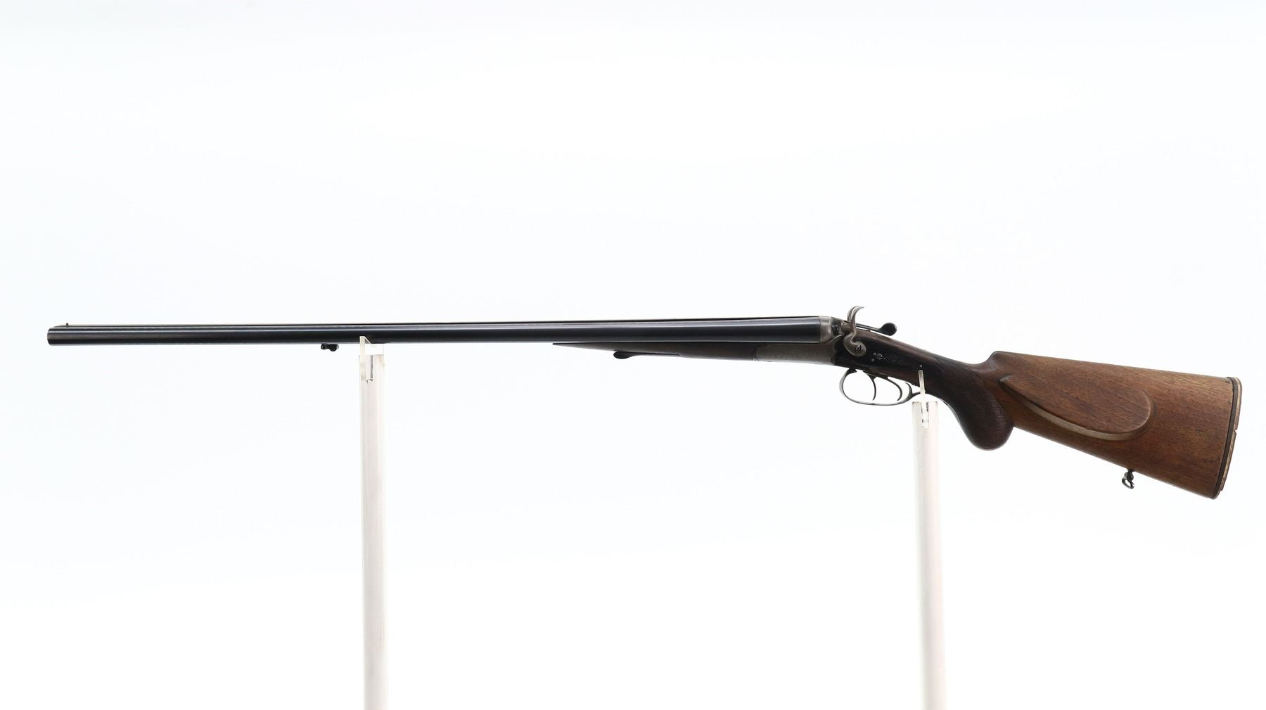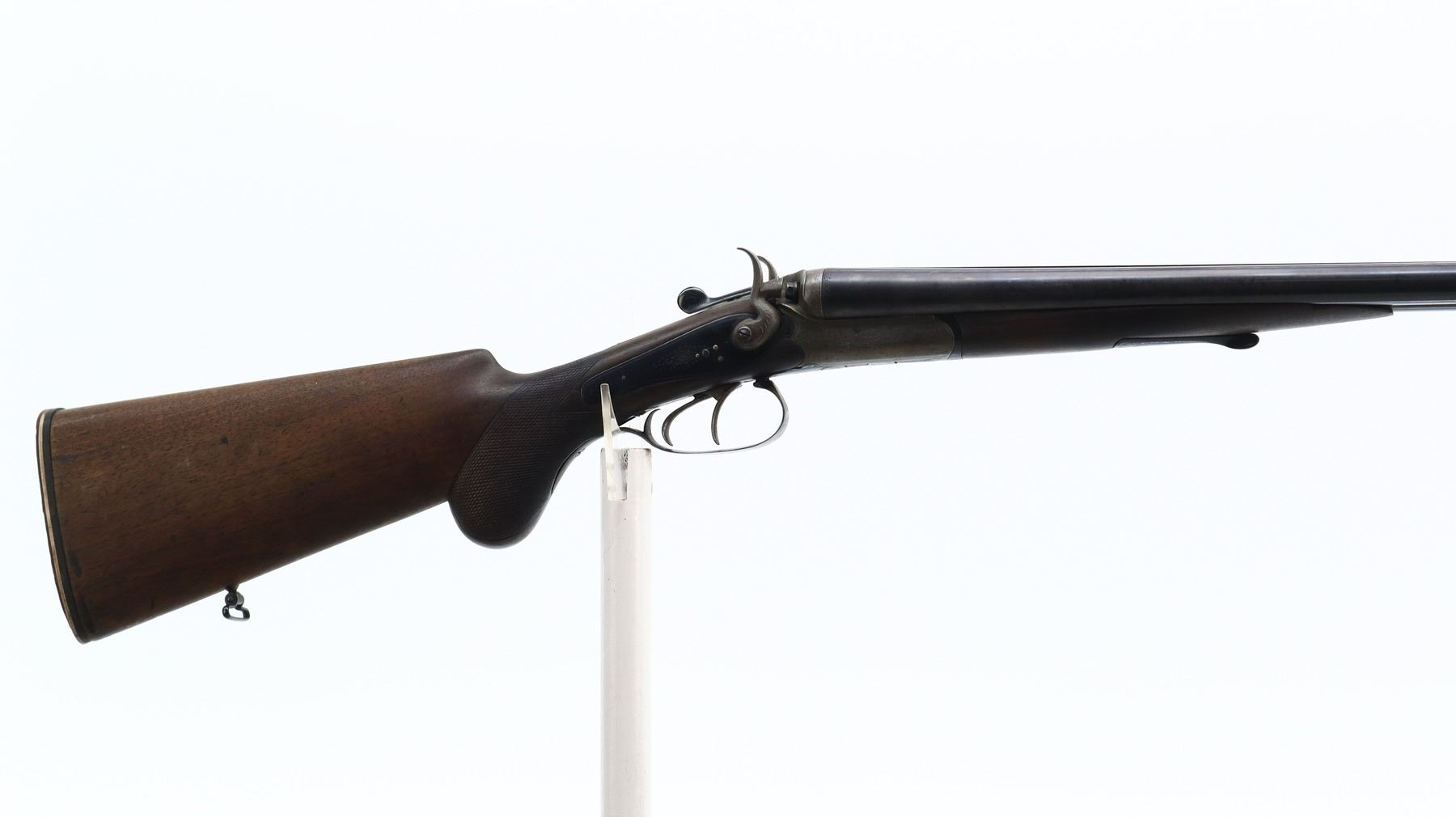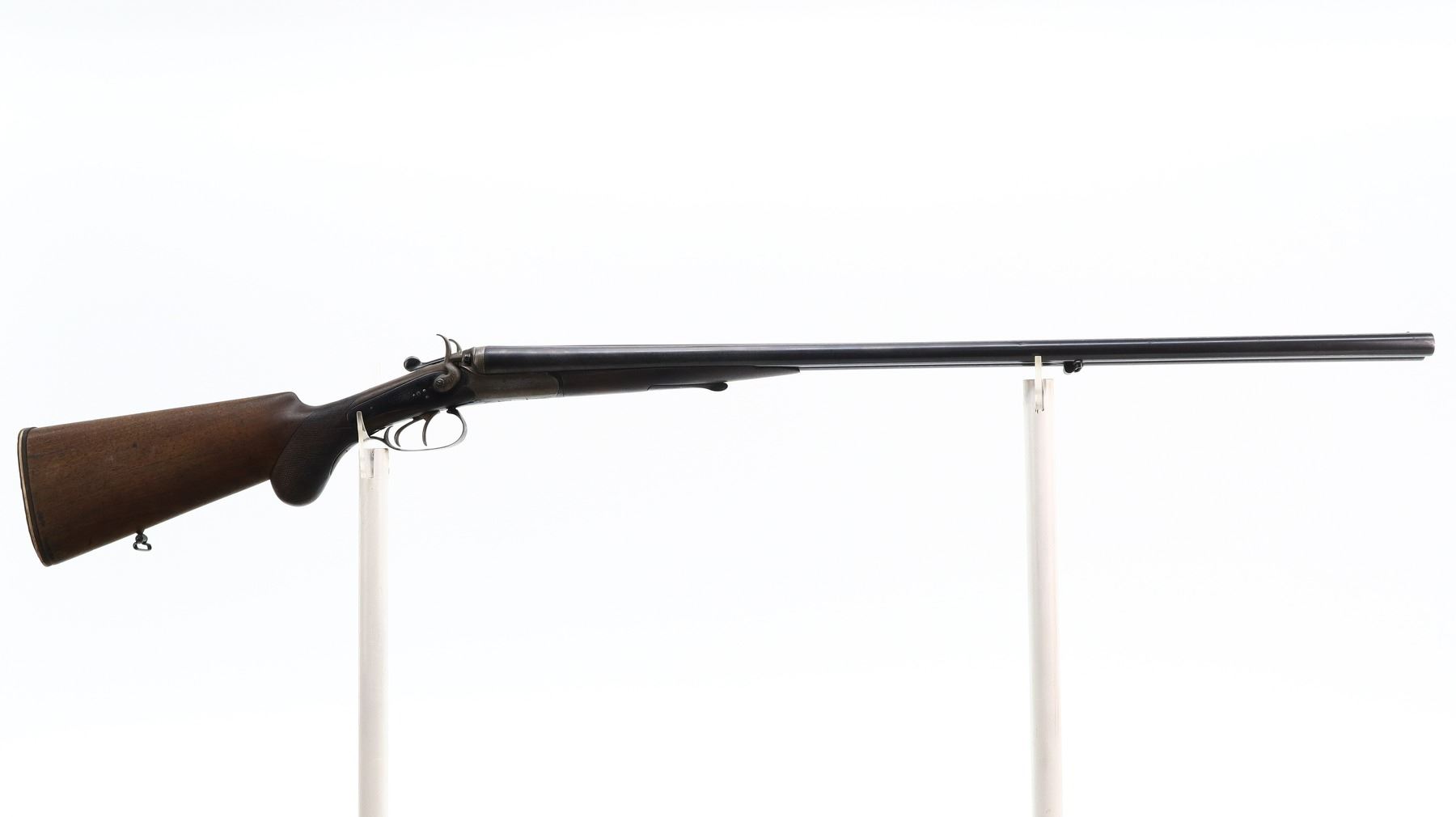4/10, UNKNOWN, MODEL: SIDE BY SIDE HAMMERGUN, CALIBER:16 G X 2 3/4", BORES ARE FAIR, PITTED. FIXED FULL CHOKES. BRASS BEAD, BLUED BARRELS LOOSE ON FACE, RIB IS DRILLED AND TAPPED FOR SCOPE MOUNT, ENGRAVED RECEIVER, BACK ACTION LOCKS WITH CHECKERED SPUR HAMMERS THAT FUNCTION, MISSING FIRING PINS AND SPRINGS, EXTRACTOR, DOUBLE TRIGGERS. TWO PIECE WOOD STOCKS, CHECKERED FOREARM AND PISTOL GRIP, CHEEK REST, RECOIL PAD BROKEN, 13.5" LOP, SLING SWIVELS, STOCK IS CHIPPED ON LEFT SIDE. METAL FINISH SHOWS SOME SCRATCHES, HANDLING MARKS AND WEAR. STOCKS SHOW SOME MARKS, SCRATCHES AND WEAR. , ACTION: HINGED SIDE BY SIDE SHOTGUN, BARREL LENGTH: 30", SERIAL # 1893, CONDITION: 4/10, CLASS: CANADIAN NON RESTRICTED