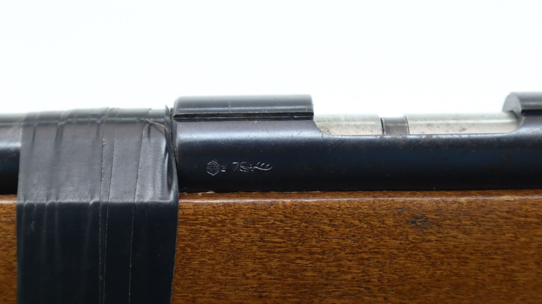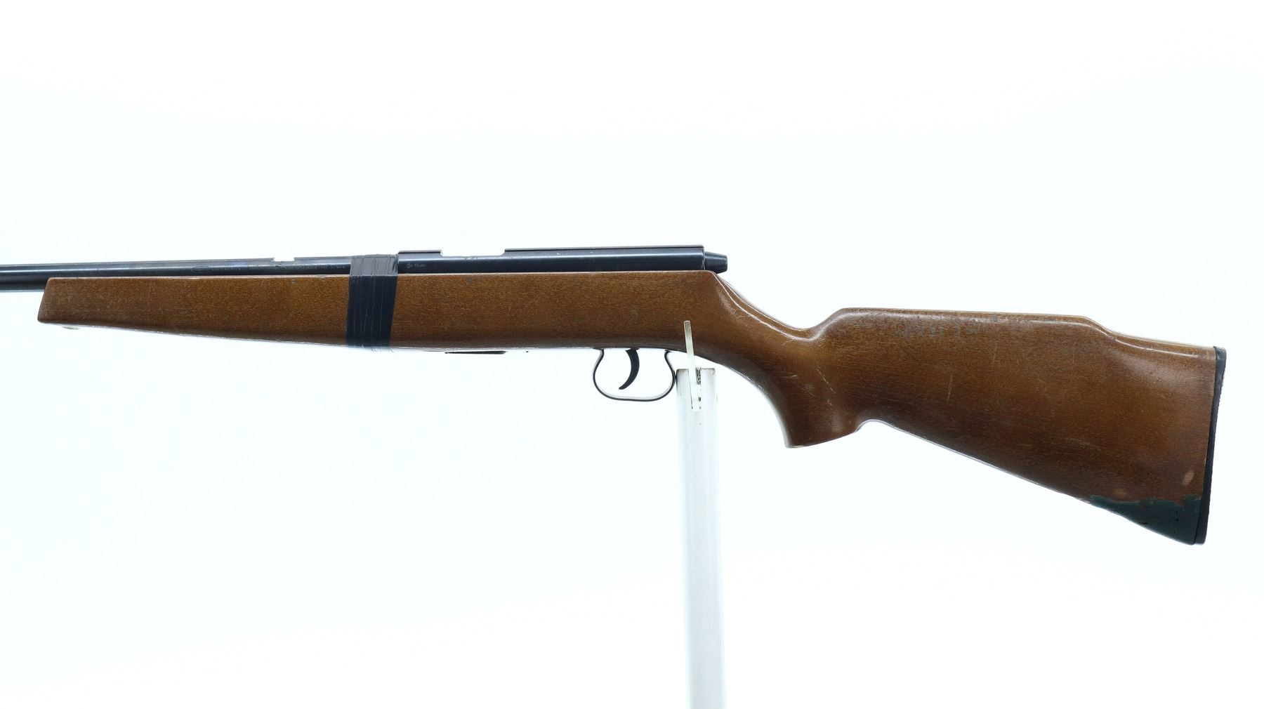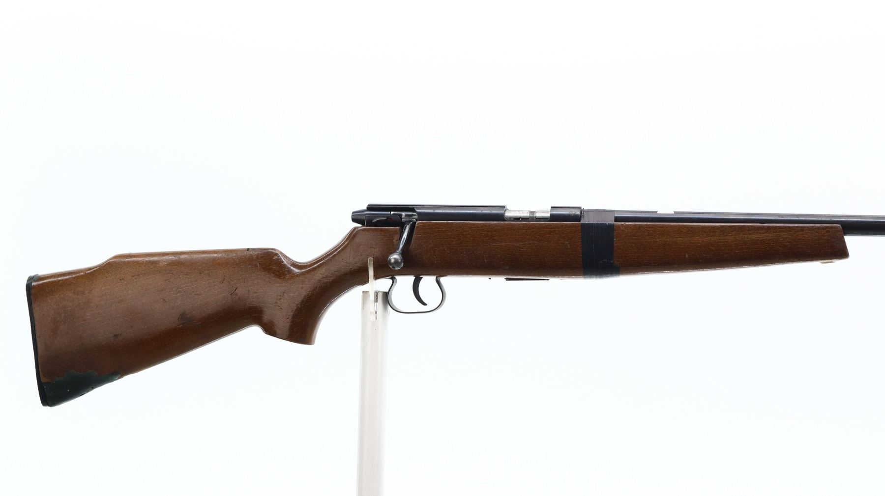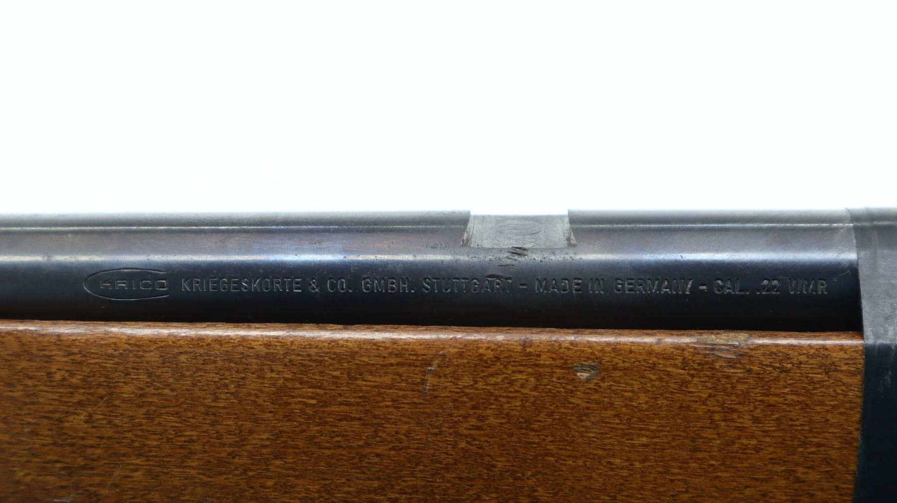3/10, KRICO, MODEL: REPEATER, CALIBER:22 MAGNUM, COMES WITH MAGAZINE, BORE IS VERY GOOD. ROUND BARREL, FRONT AND REAR SIGHTS REMOVED, BLUED FINISH, RECEIVER GROOVED FOR SCOPE MOUNT. ONE PIECE SMOOTH WOOD STOCK, PISTOL GRIP, TEXTURED BLACK POLYMER RECOIL PAD, STOCK BROKEN AT TOE REPAIRED WITH GREEN EPOXY. MISSING ACTION SCREWS, STOCK HELD ON WITH BLACK TAPE. SWIVELS REMOVED, HOLES ARE PRESENT. METAL FINISH SHOWS SOME SCRATCHES, HANDLING MARKS AND WEAR. STOCK SHOWS SOME MARKS, SCRATCHES AND WEAR. , ACTION: BOLT ACTION RIFLE, BARREL LENGTH: 22.5", SERIAL # 503884, CONDITION: 3/10, CLASS: CANADIAN NON RESTRICTED